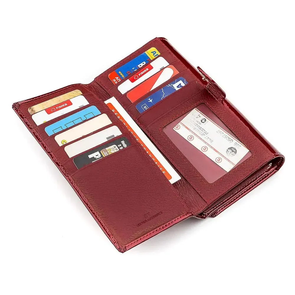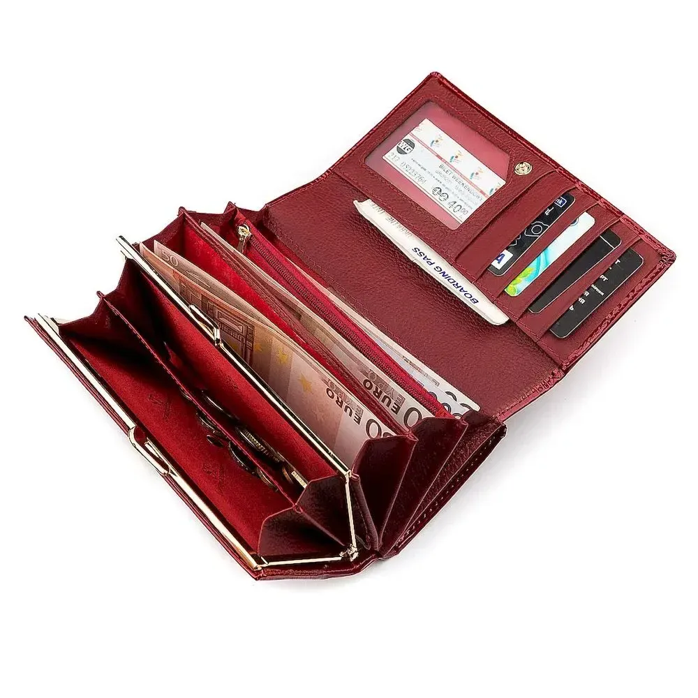Особливості:< 14 осередків для пластикових карток; 3 великі відділення для паперових грошей; 2 прозорих віконця; 2 слоти для сім-карт; монетниця на механічній клямці;