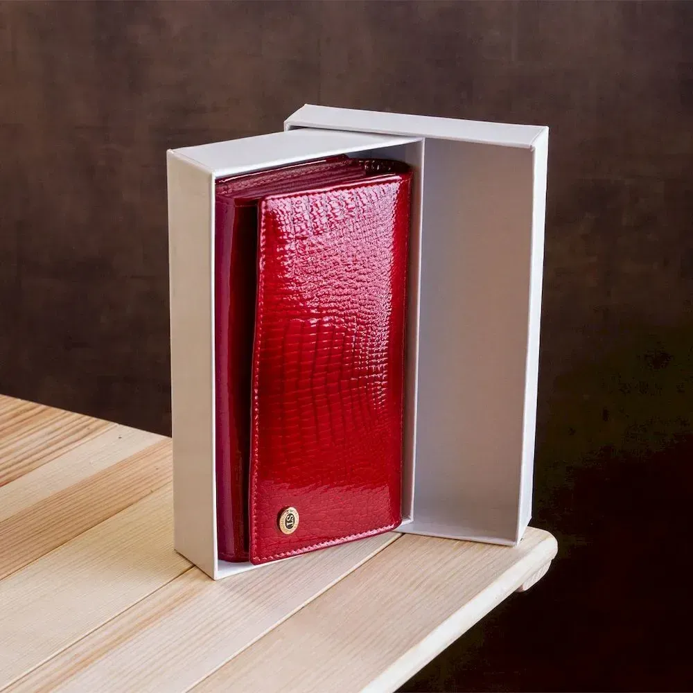 Дана модель сподобається дівчатам і жінкам, тому що червоний колір є дуже барвистим та привабливим. Всередині просторо, функціональність оптимальна завдяки наявності всіх потрібних відділень, а також якісному пошиття. З боків є відмінні прилеглі відсіки, а в перегородці є кишенька на змійці та монетниця на клямці.
