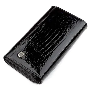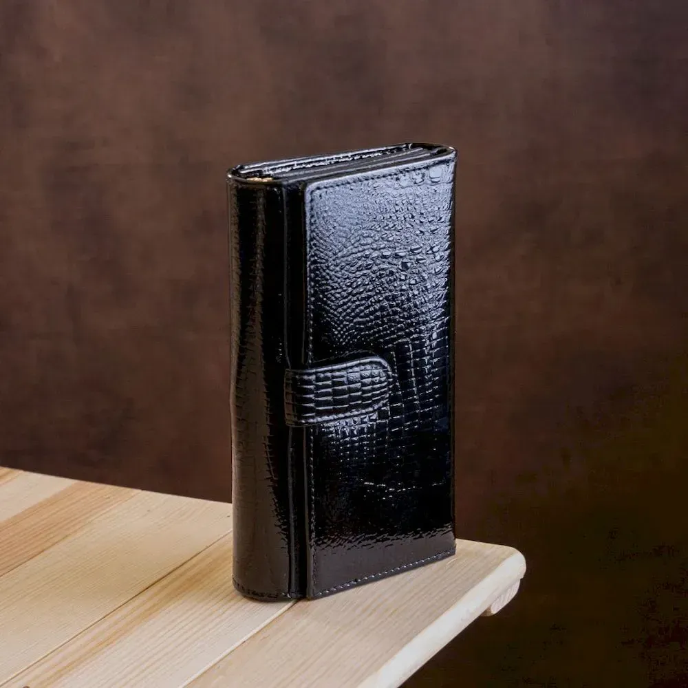Чорний гаманець для жінок з тисненням під крокодилячу шкіру – це не міф, а можливість підкреслити солідність та елегантність. Крім шикарного дизайну, надійної фурнітури із золотим відтінком, аксесуар має якість і прекрасну практичність. Місткість відмінна для паперових купюр і особливо банківських карт, яких можна розмістити аж 14. Порадує і великий відділ для монет, що закривається на клямку.