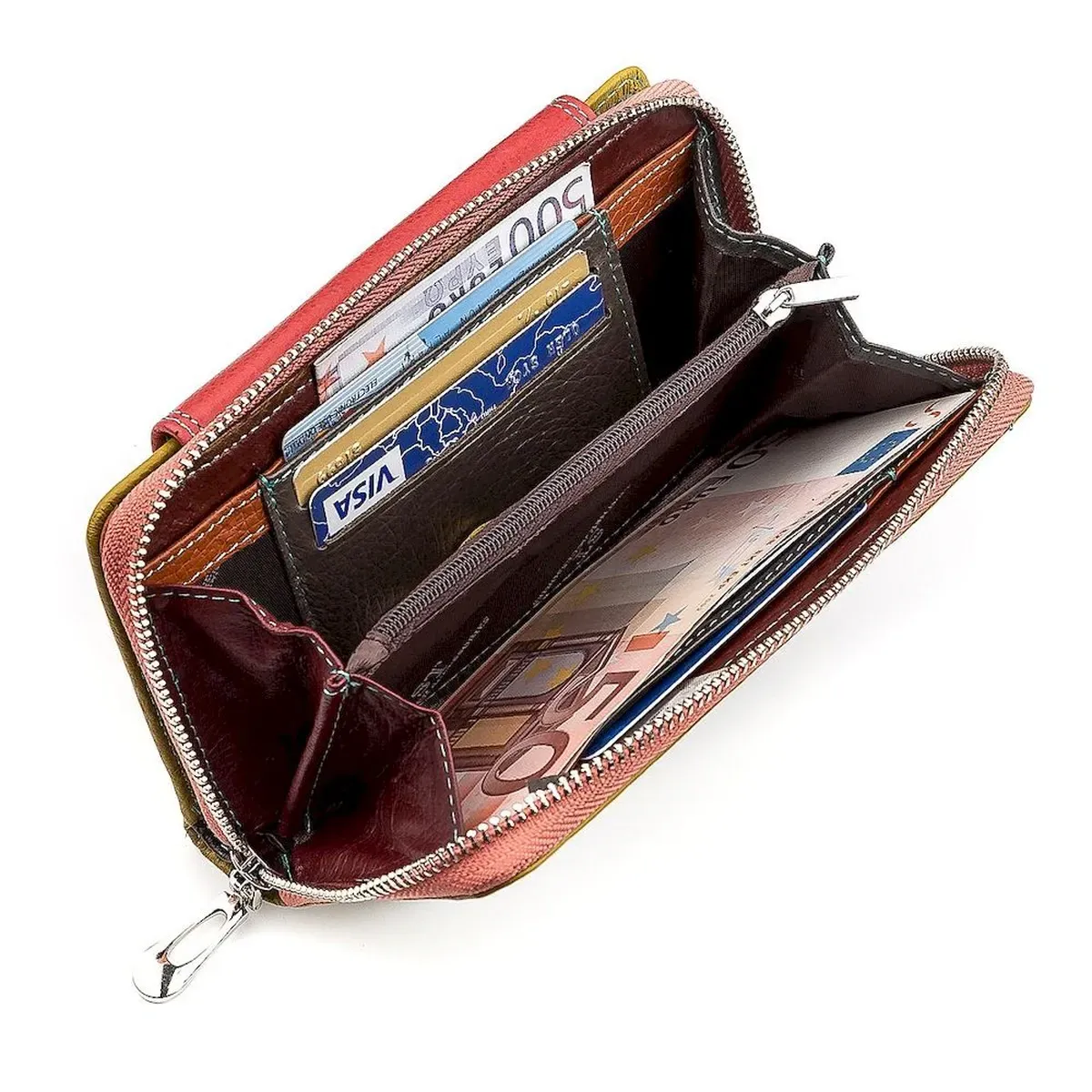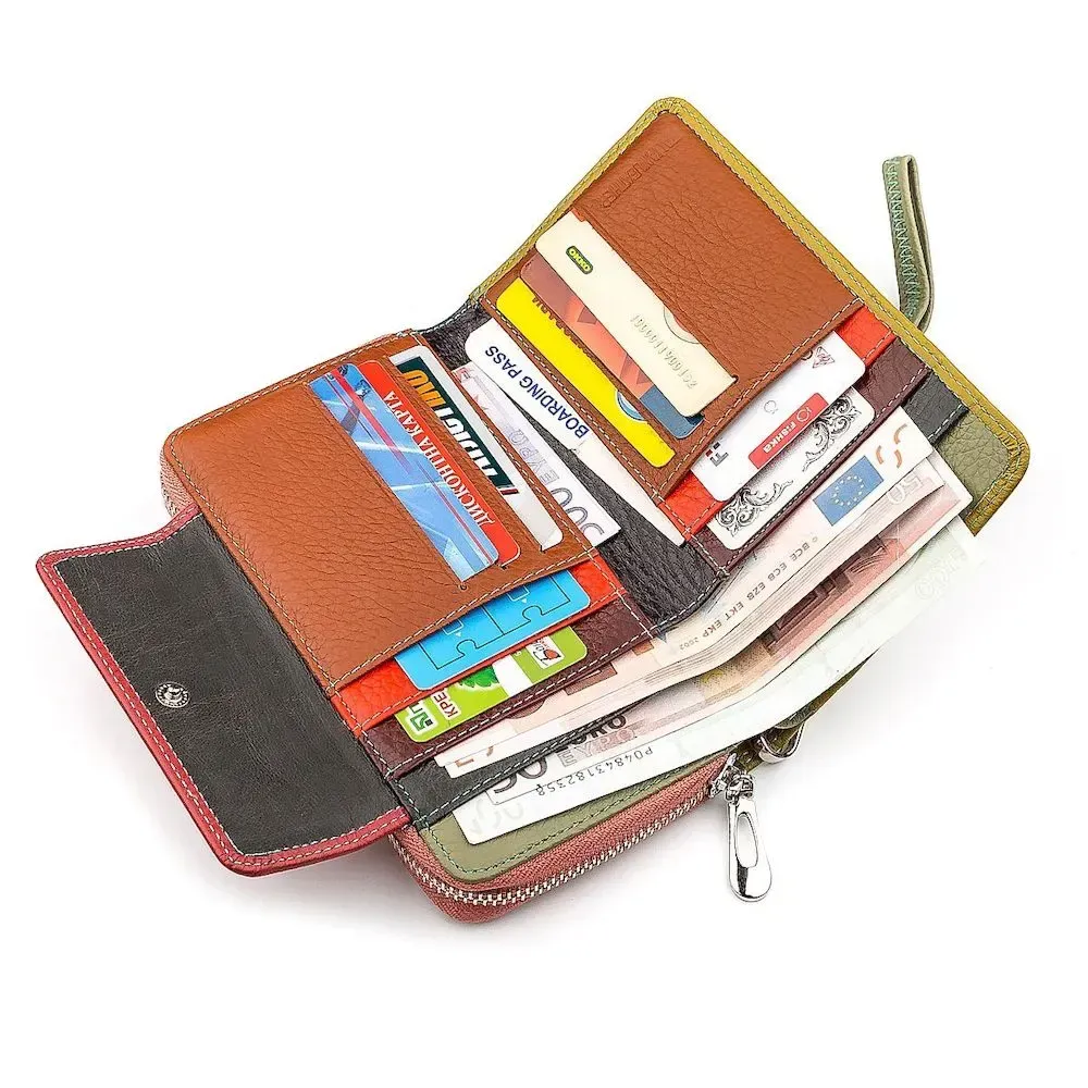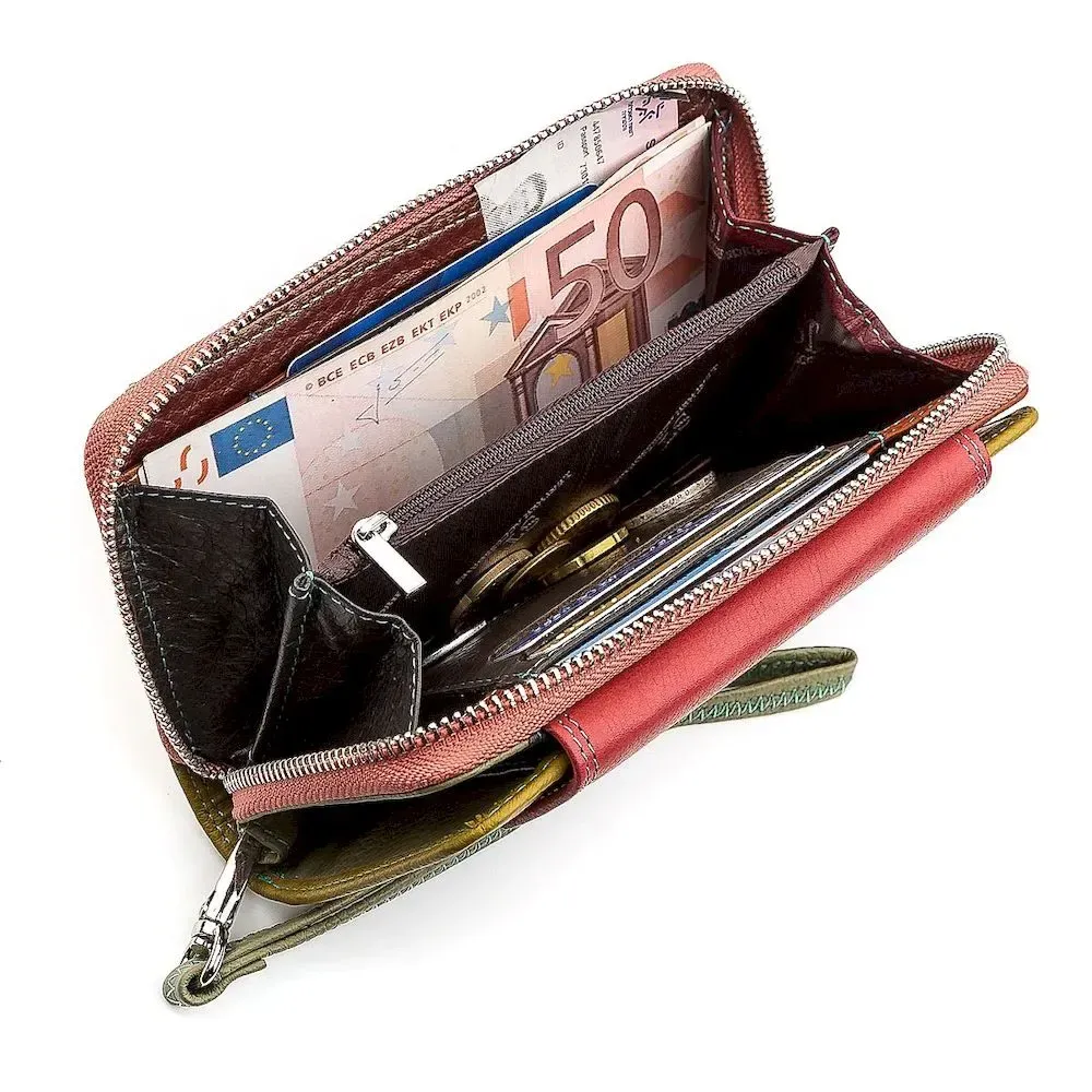 Цікава модель гаманця, яка виконана у шикарному, барвистим стилі, поєднуючи шматочки шкіри у бірюзовому та рожевому кольорах. Оригінальний дизайн доповнюється відмінним функціоналом: внутрішній простір дуже місткий, а також великі прилеглі відсіки, секції для карток, широкі та глибокі кишені. Аксесуар зовні виробляється з яловичої шкіри, яку всередині доповнює свиняча та підкладка з текстилю.