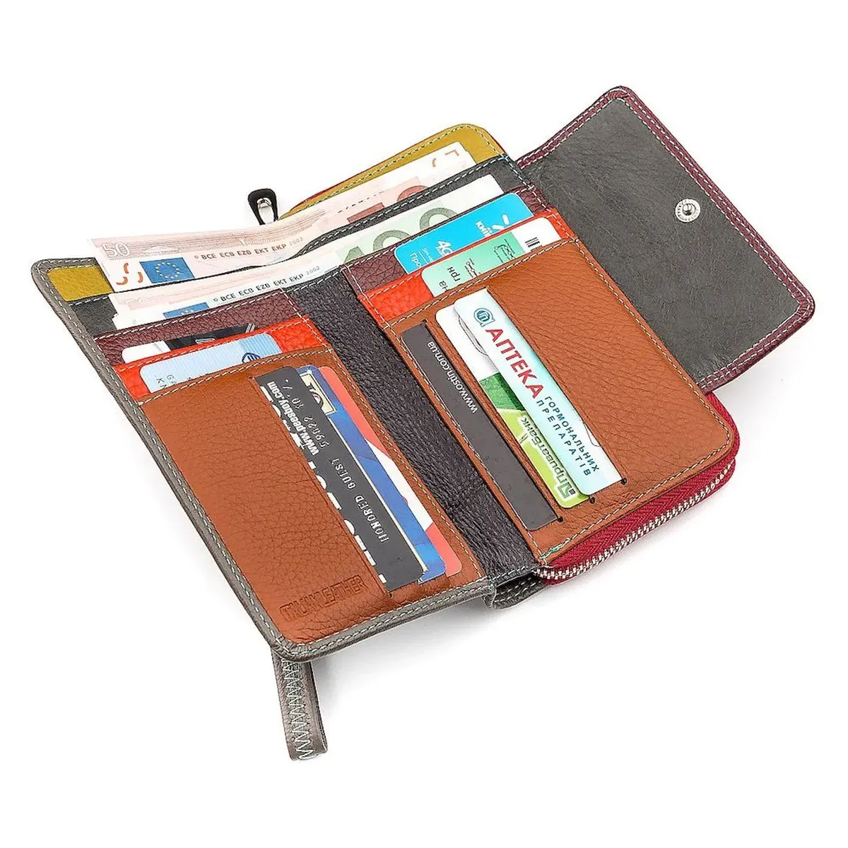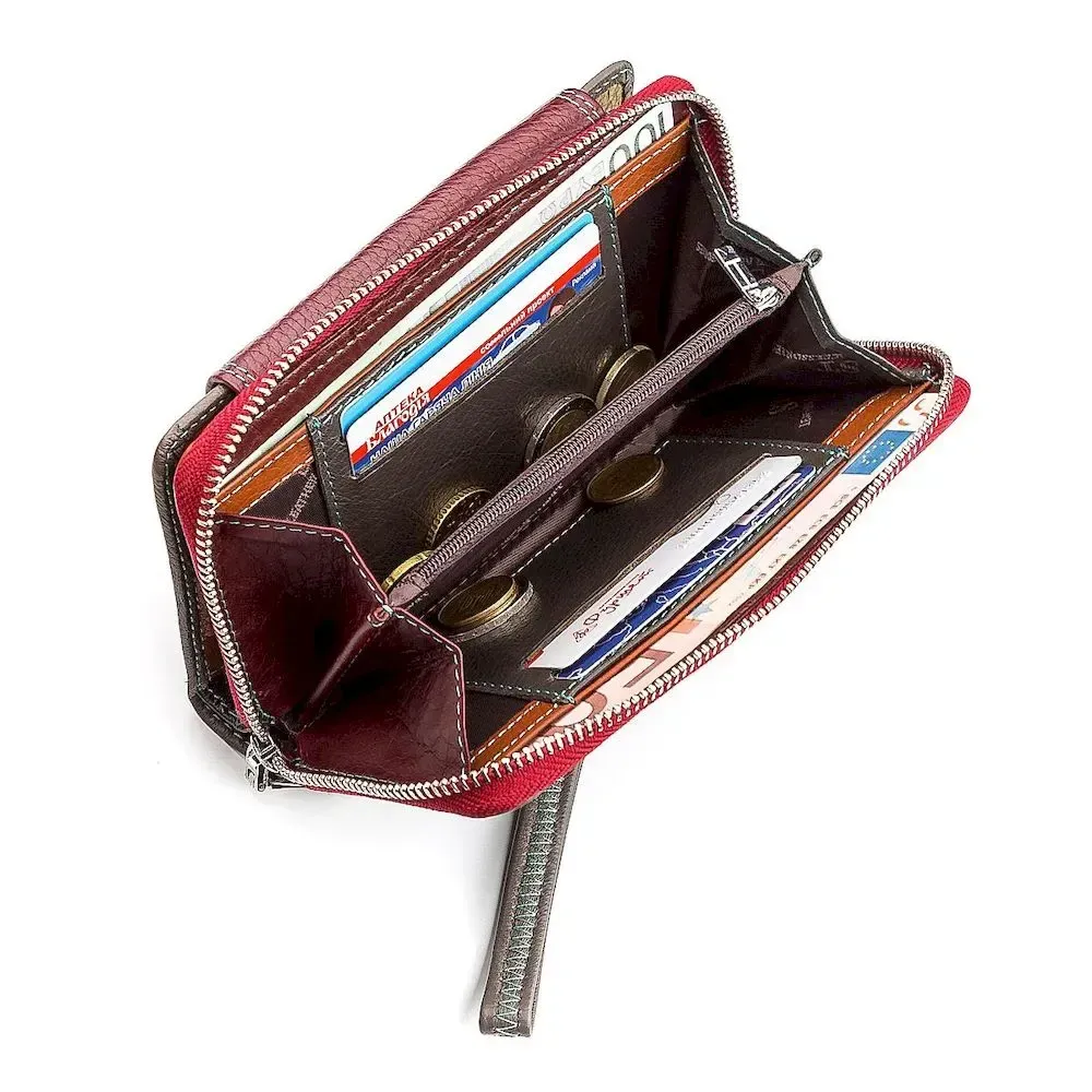 Представлена модель жіночого гаманця має привабливий дизайн, який забезпечується поєднанням бордового та сірого кольорів. При досить компактних розмірах, місткість аксесуара відмінна – є об'ємні та широкі кишені, 10 осередків для платіжних карток та прилеглі відділення. Закривається гаманець з двох сторін: на кнопку та блискавку, надаючи чудову надійність та збереження вмісту. Як матеріал використовується екологічно чиста шкіра, а внутрішній простір доповнюється текстильною підкладкою.