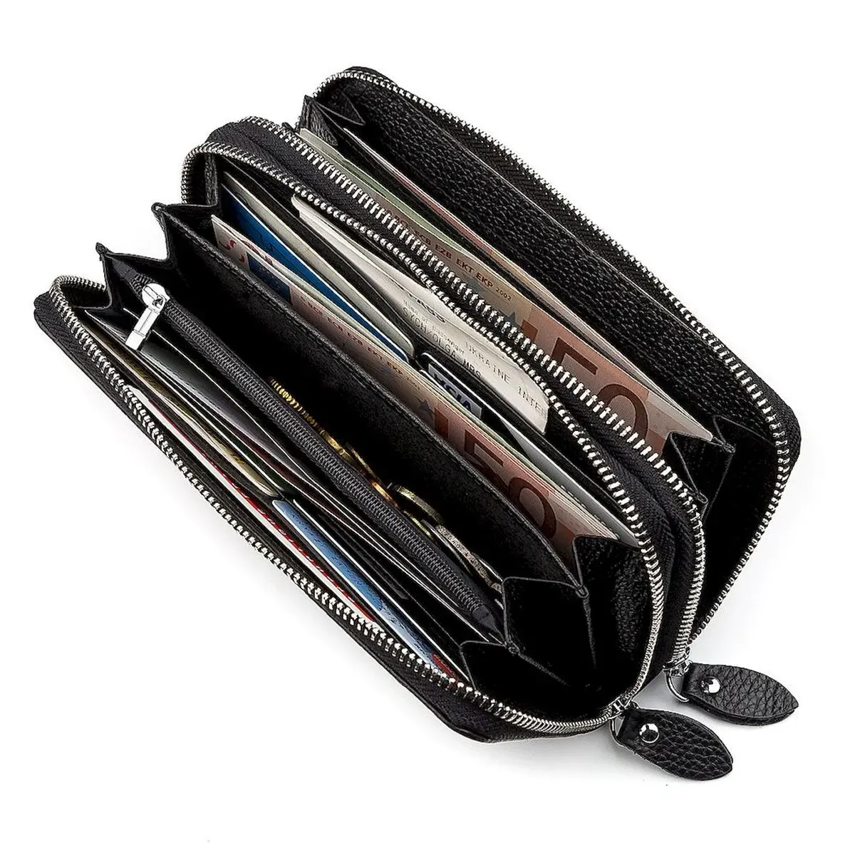6 відділення для купюр, під двома окремими блискавками;