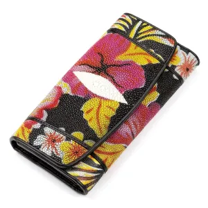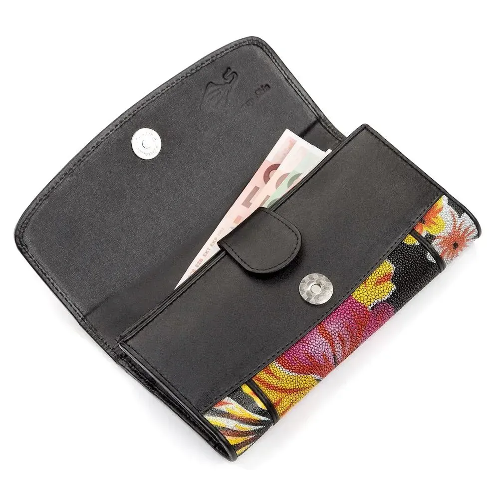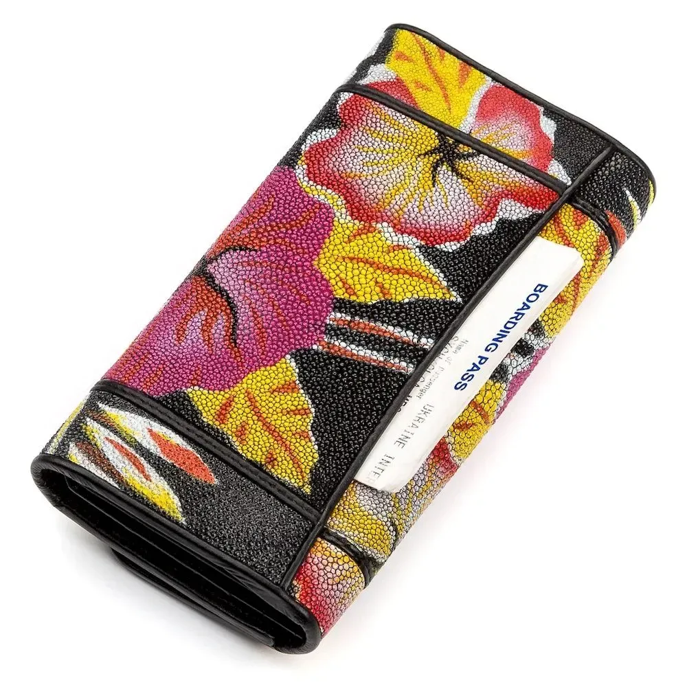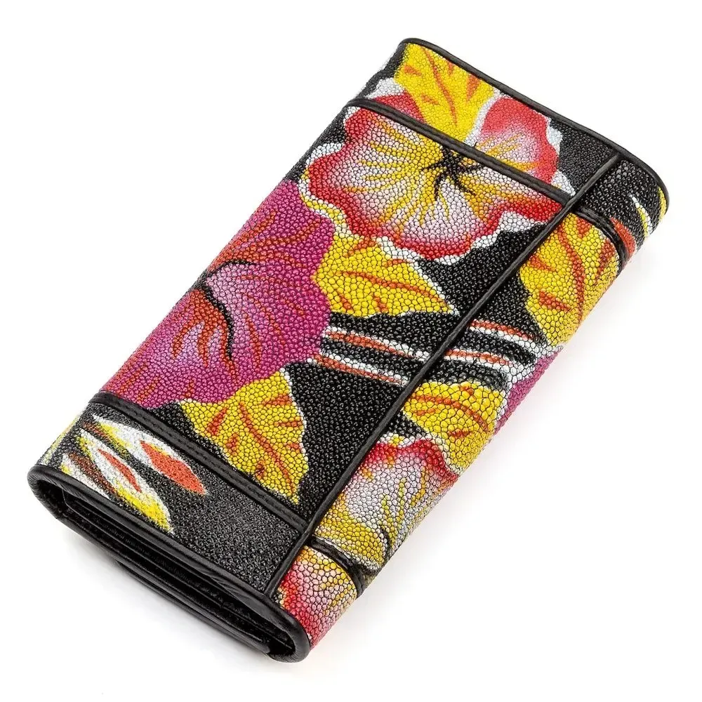 Гарний жіночий гаманець з натуральної шкіри морського схилу, декорований малюнком з різнокольорових квітів. Аксесуар обшитий гладкою чорною шкірою. Весь простір шкіри вкритий сотнями дрібних горбків, різного розміру, які грають на світлі, як невеликі бусинки, центральна частина аксесуара виділена білим кольором і структура бусинок у ній трохи більша. Дуже стильний аксесуар, який підійде жінці, яка цінує оригінальність та якість.