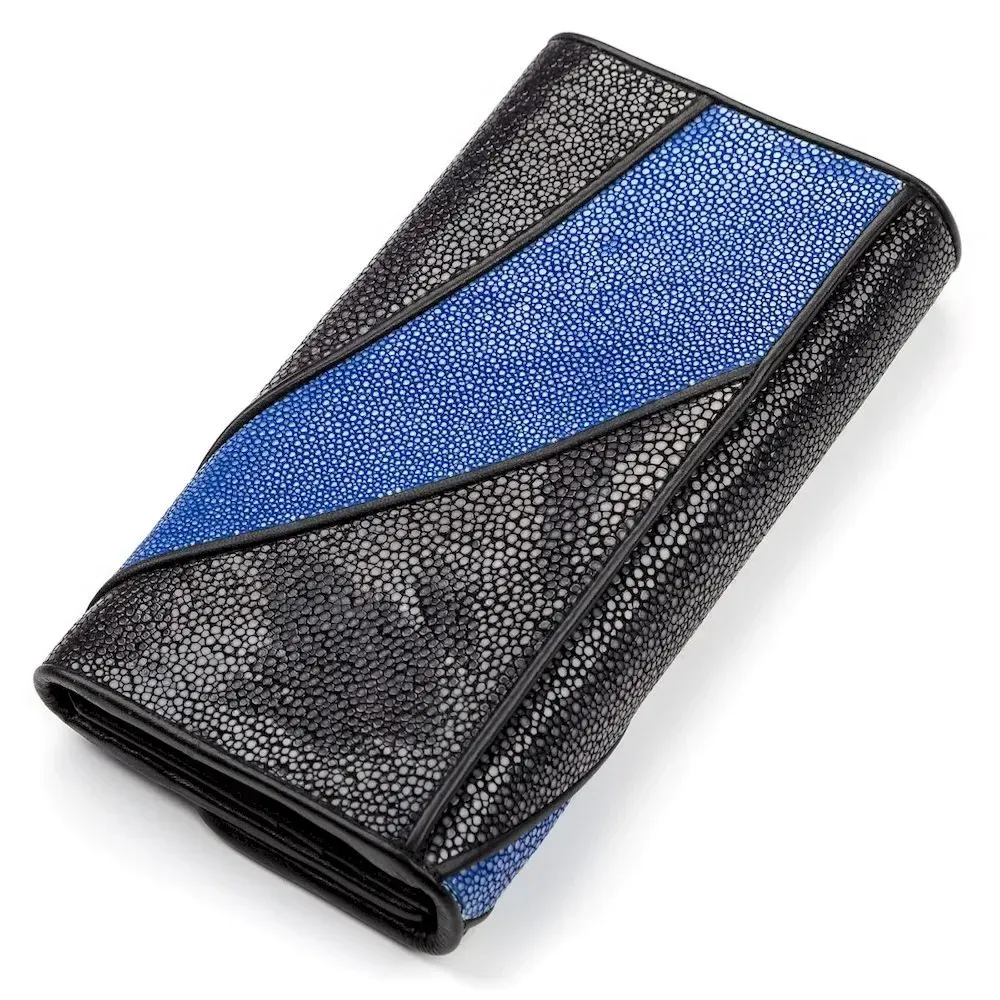Надійний жіночий гаманець з натуральної шліфованої шкіри морського ската, яка має фантастичну фактуру і красу, а також дуже стійку до зносу, проколів, порізів, до розривів і навіть до вогню. Весь простір шкіри вкритий сотнями дрібних горбків, різного розміру, які грають на світлі, як невеликі бусинки. Аксесуар декорований, контрастними вставками із синьої шкіри, що надають виробу оригінальності та яскравості. Дуже акуратний аксесуар, який підійде жінці, яка цінує зручність та якість.