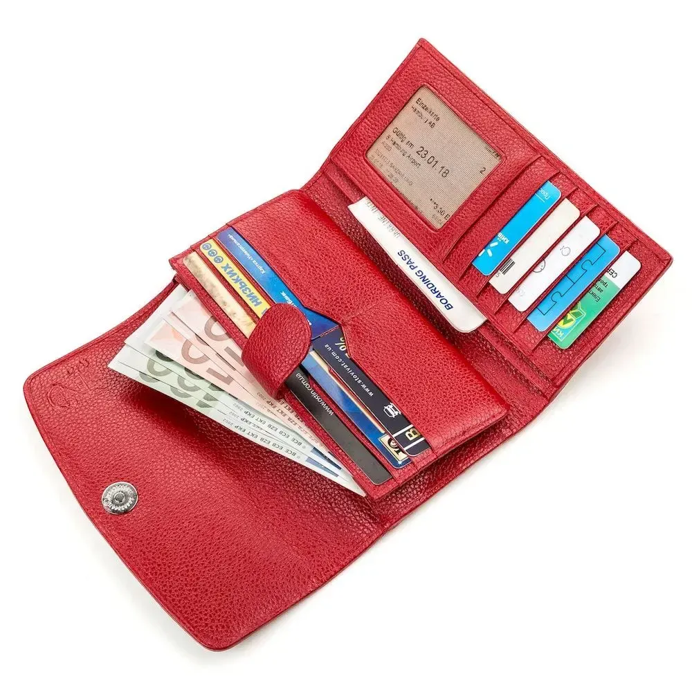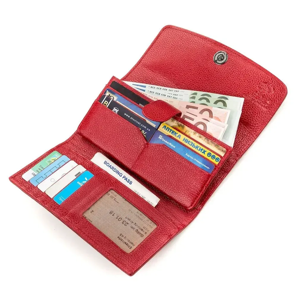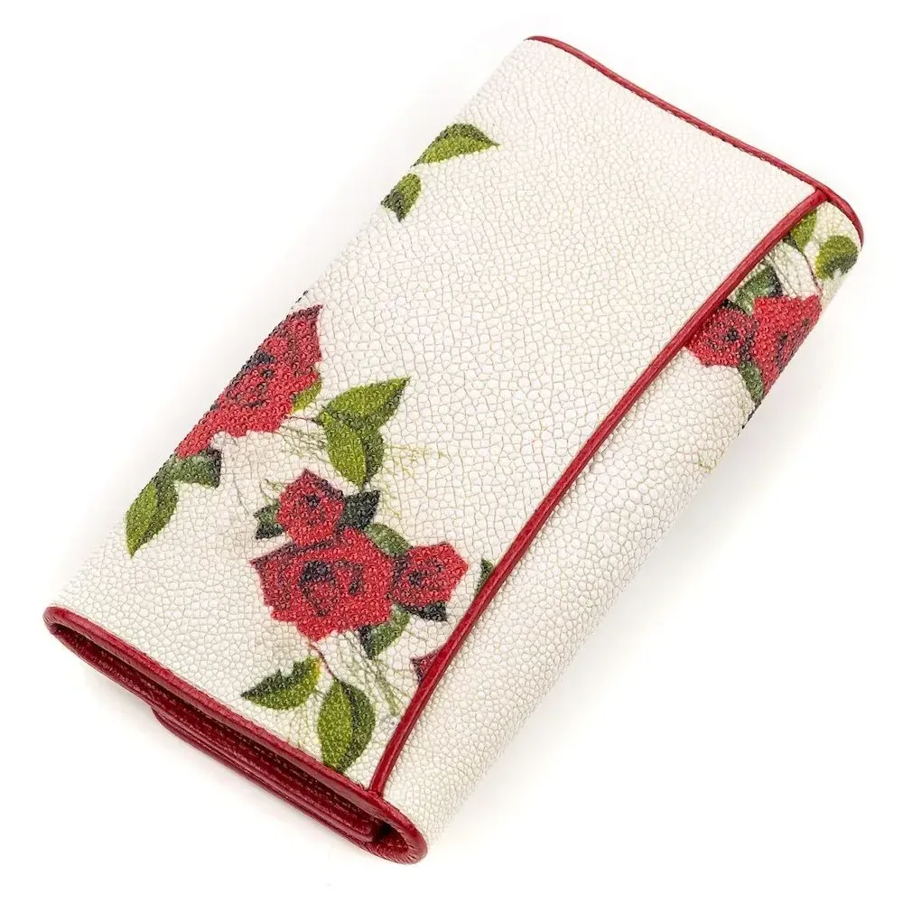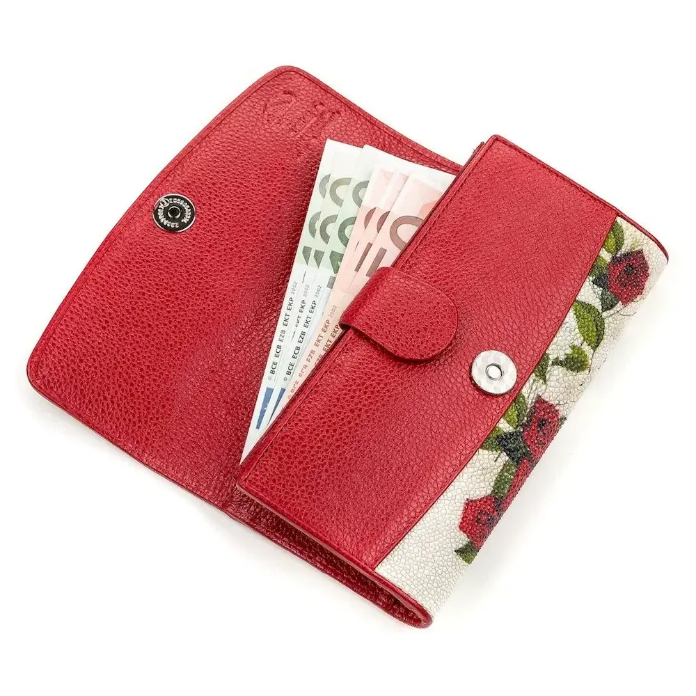 Гаманець з гарним   ;принтом з натуральної шкіри морського ската, яка має фантастичну фактуру і красу. Її витонченість підкреслює кістяний залишок від спинного плавця, схожий на блок перлин. Найбільша “перлина” перебуває у центрі, і з ній визначають вік ската. Весь простір шкіри вкритий сотнями дрібних горбків, різного розміру, які грають на світлі, як невеликі бусинки. Аксесуар обшитий гладкою червоною шкірою. Дуже компактний та зносостійкий аксесуар, який підійде всім цінителям зручності та якості.