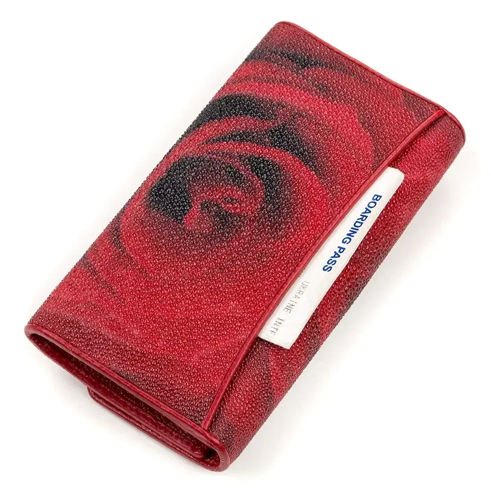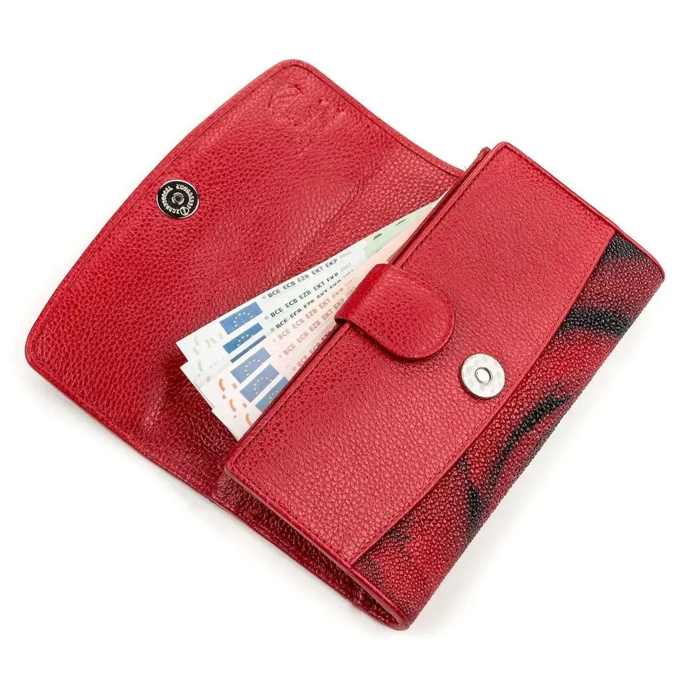 Гаманець з фантастичним   ;принтом з натуральної шкіри морського ската, яка має фантастичну фактуру і красу. Її витонченість підкреслює кістяний залишок від спинного плавця, схожий на блок перлин. Найбільша “перлина” перебуває у центрі, і з ній визначають вік ската. Весь простір шкіри вкритий сотнями дрібних горбків, різного розміру, які грають на світлі, як невеликі бусинки. Аксесуар обшитий гладкою червоною шкірою. Дуже компактний та зносостійкий аксесуар, який підійде всім цінителям зручності та якості.