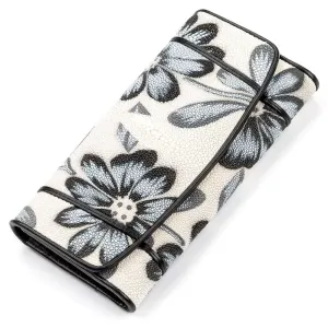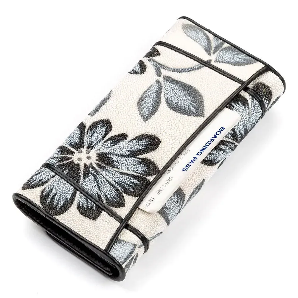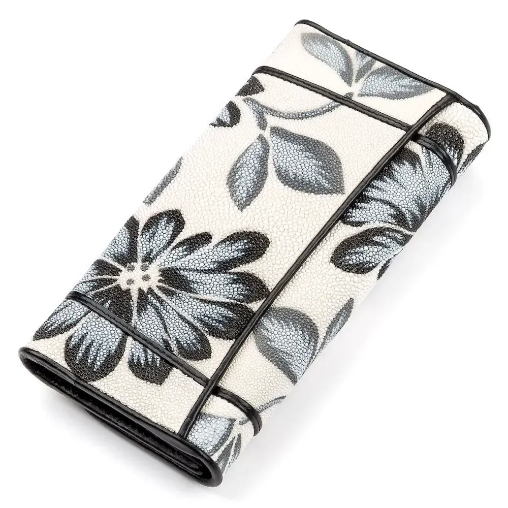 Гарний жіночий гаманець з натуральної шкіри морського схилу, декорований малюнком з різнокольорових квітів. Аксесуар обшитий гладкою чорною шкірою. Весь простір шкіри вкритий сотнями дрібних горбків, різного розміру, які грають на світлі, як невеликі бусинки, центральна частина аксесуара виділена білим кольором і структура бусинок у ній трохи більша. Вироби зі шкіри морського ската вважаються одними з найзносостійкіших у світі. Дуже стильний аксесуар, який підійде жінці, яка цінує оригінальність та якість.