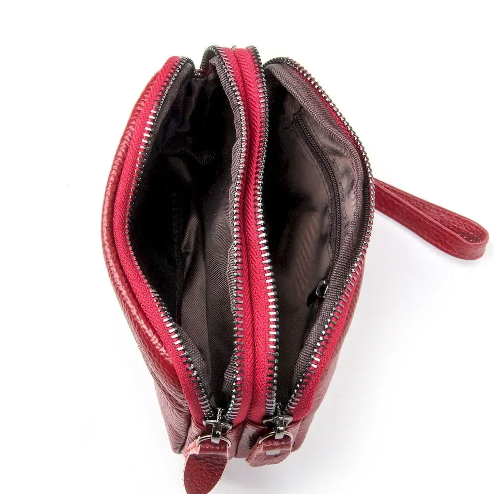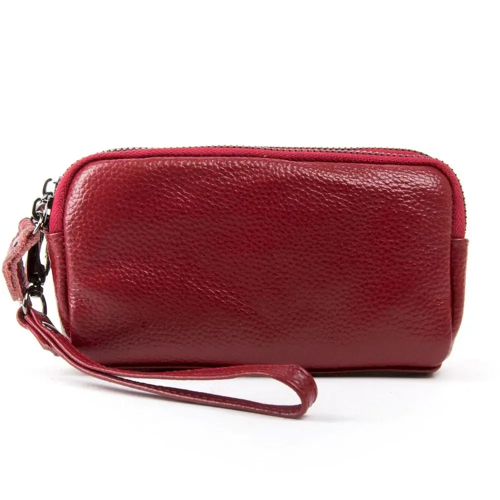 Жіночий шкіряний гаманець-косметичка. Два відділення, які закриваються на блискавці. Усередині відділень є одна кишеня на блискавці і одна відкрита кишеня. У комплекті знімний кистьовий ремінець. Розмір (см.) 16*9*5