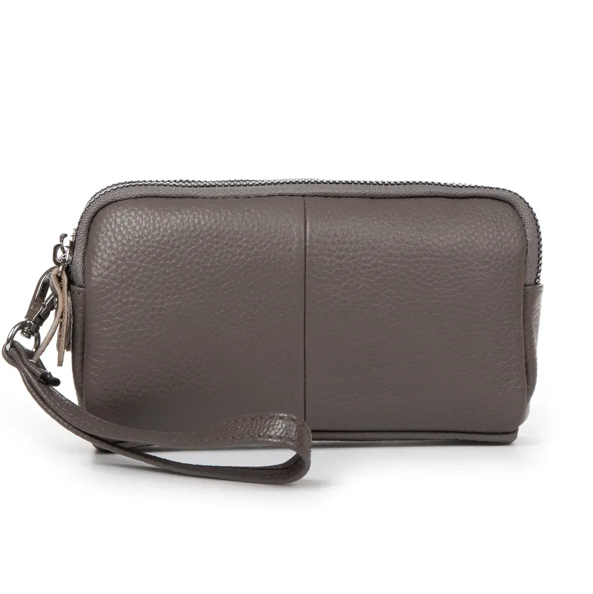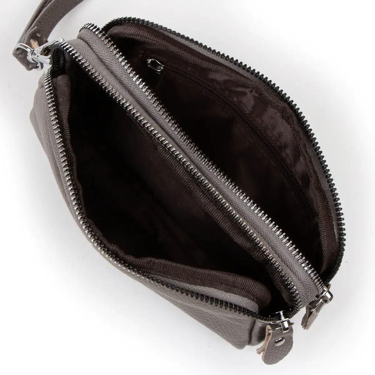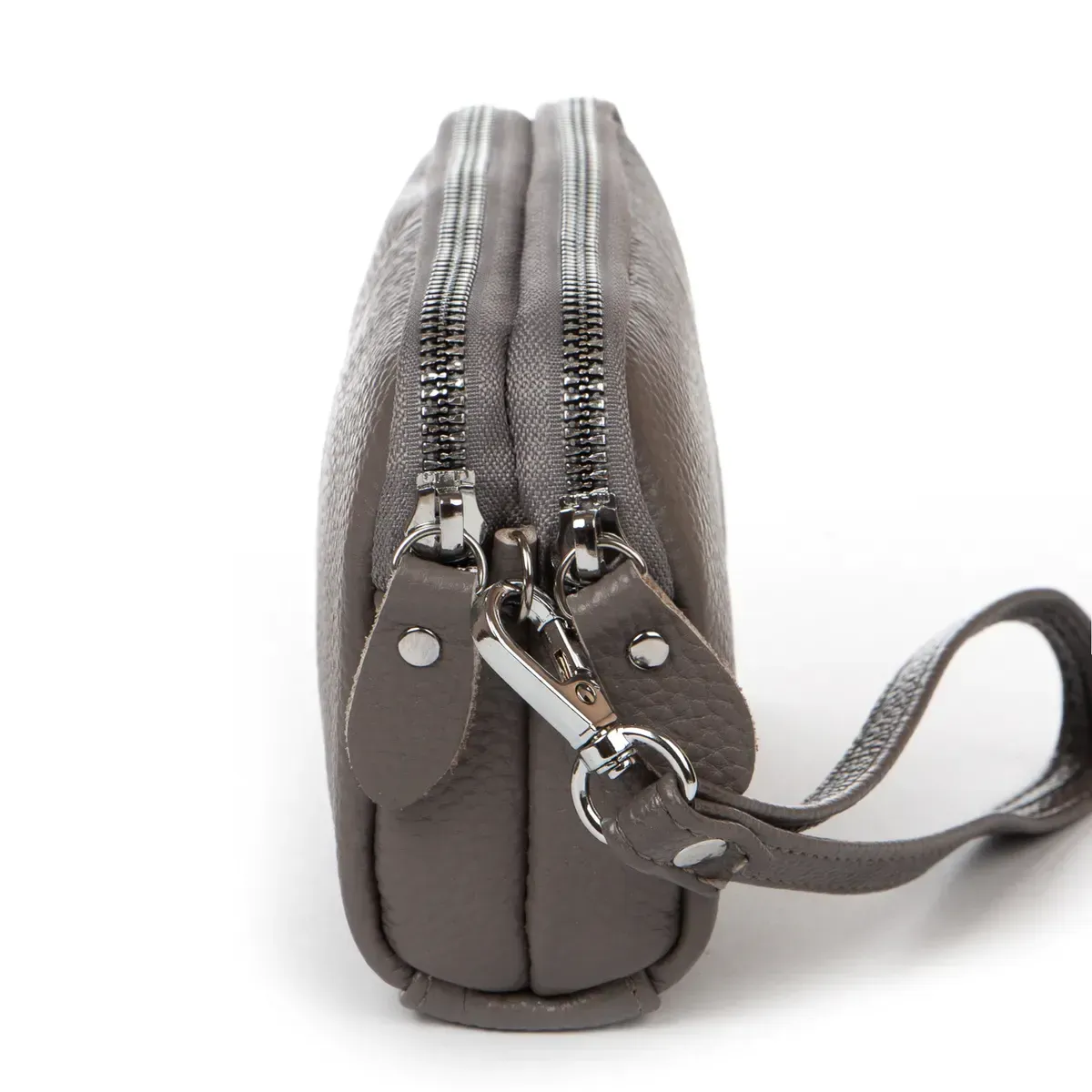 Жіноча шкіряна косметичка. Виготовлена з м'якої шкіри. Два відділення, що закриваються на блискавці. Усередині є бічна кишеня на блискавці та відкрита кишеня.
