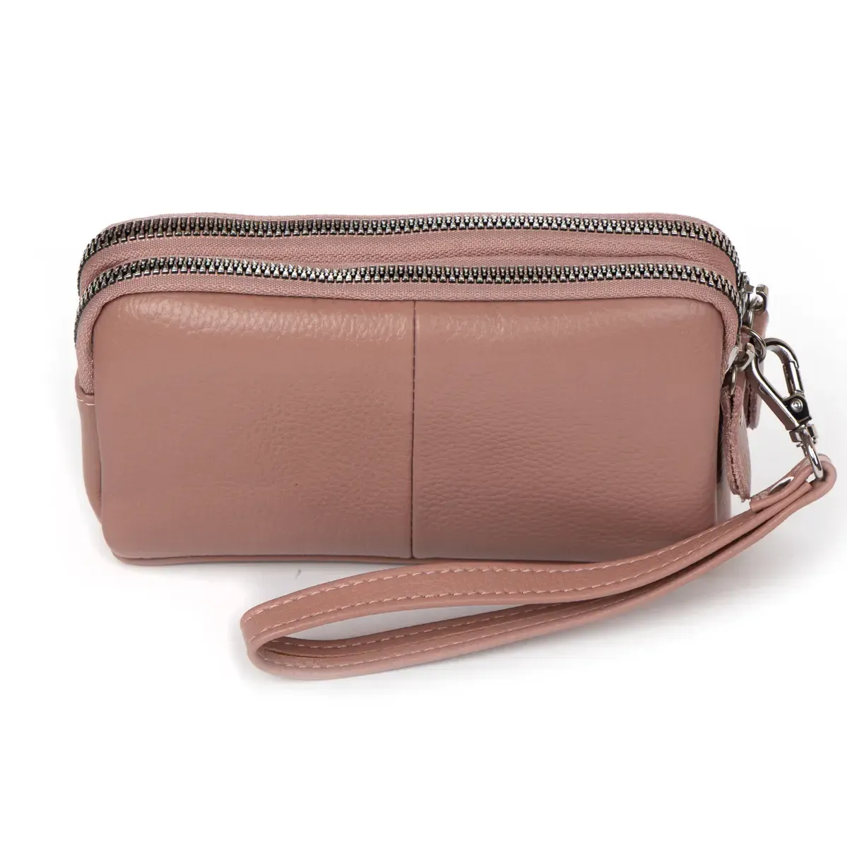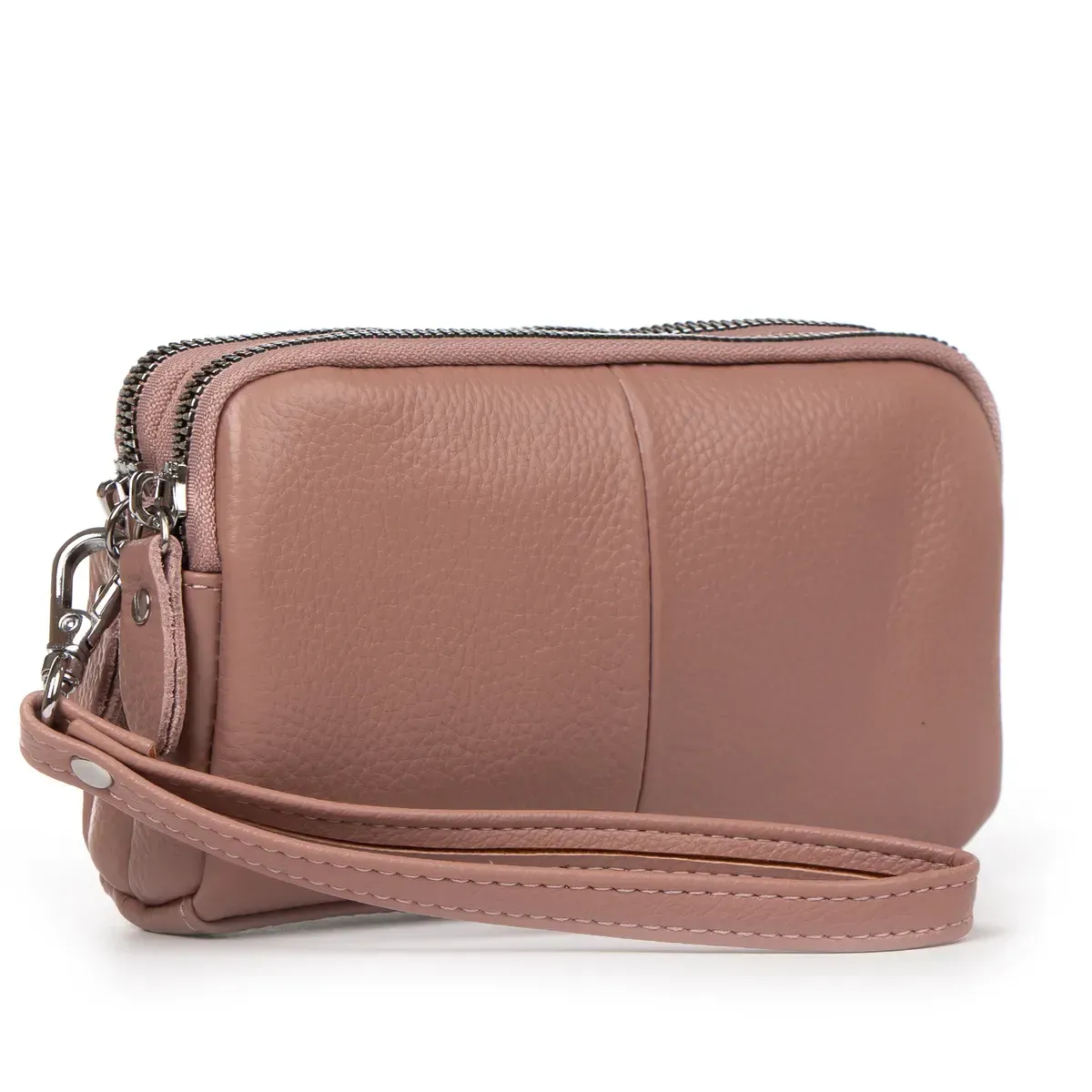 Жіноча шкіряна косметичка. Виготовлена з м'якої шкіри. Два відділення, що закриваються на блискавці. Усередині є бічна кишеня на блискавці та відкрита кишеня.