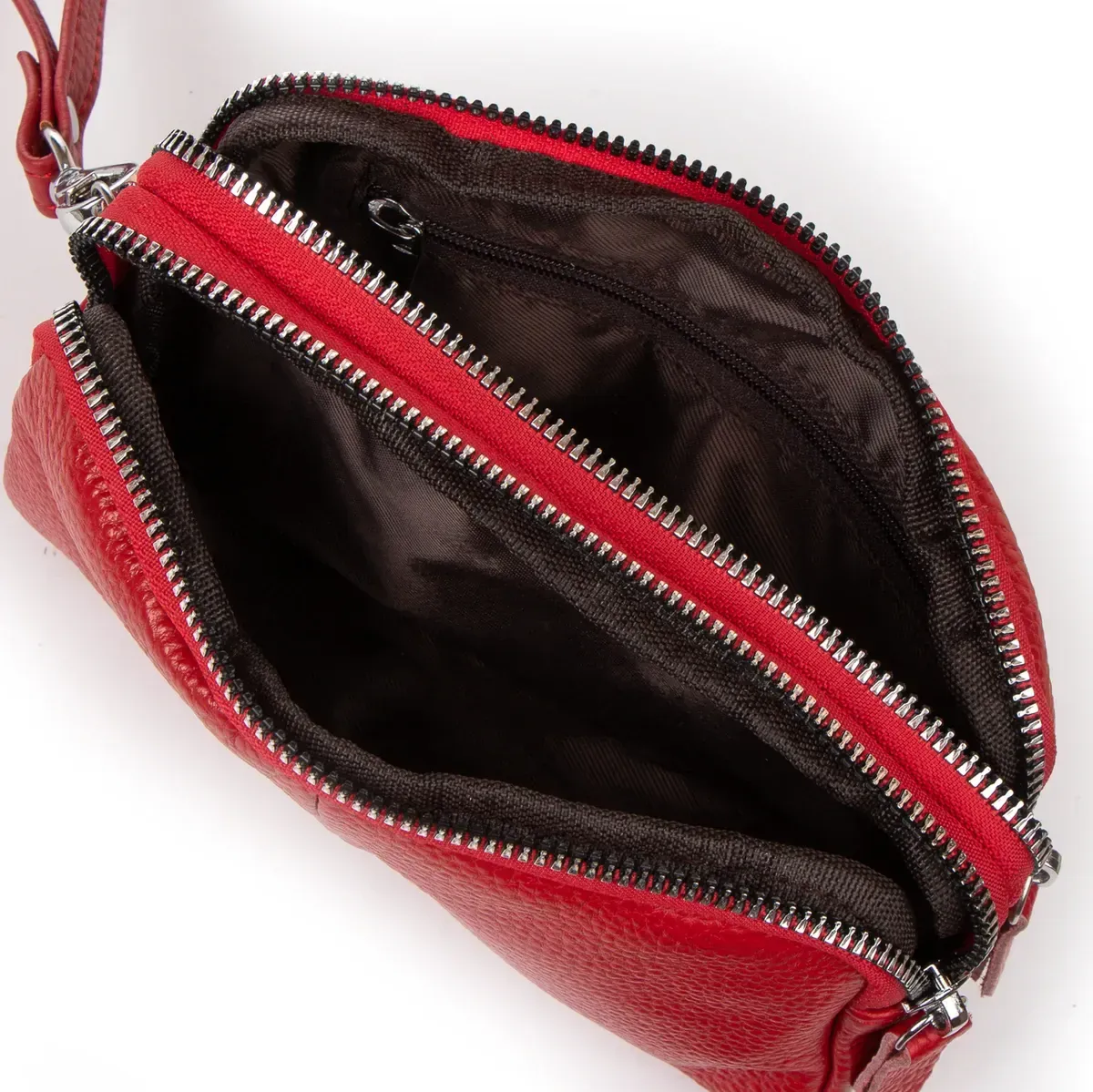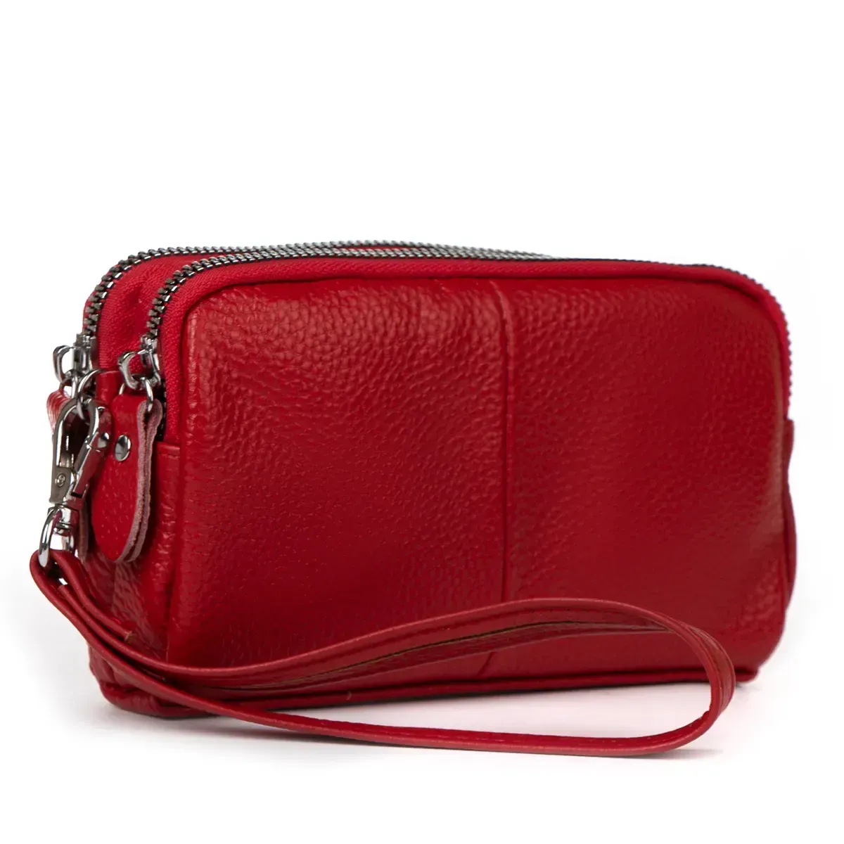 Жіноча шкіряна косметичка. Виготовлена з м'якої шкіри. Два відділення, що закриваються на блискавці. Усередині є бічна кишеня на блискавці та відкрита кишеня.