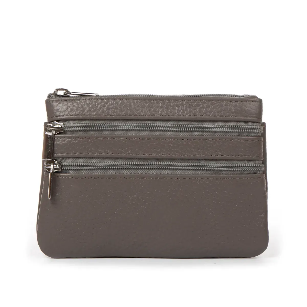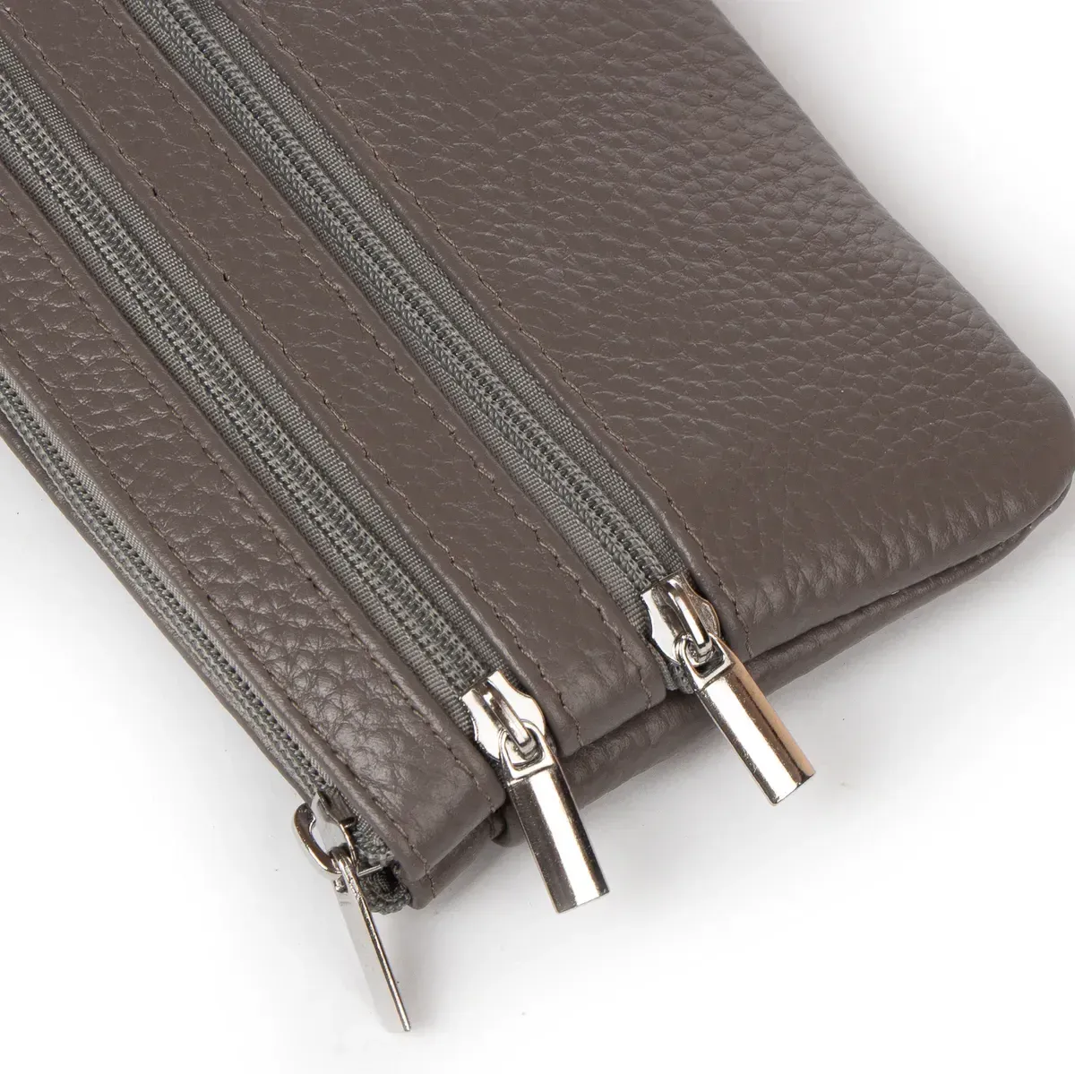 Жіноча шкіряна косметичка – ключниця. Одне відділення для ключів закривається на блискавку. На фасаді розташовані дві кишені на блискавці, а на звороті одна відкрита кишеня.