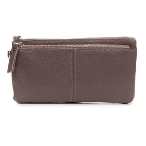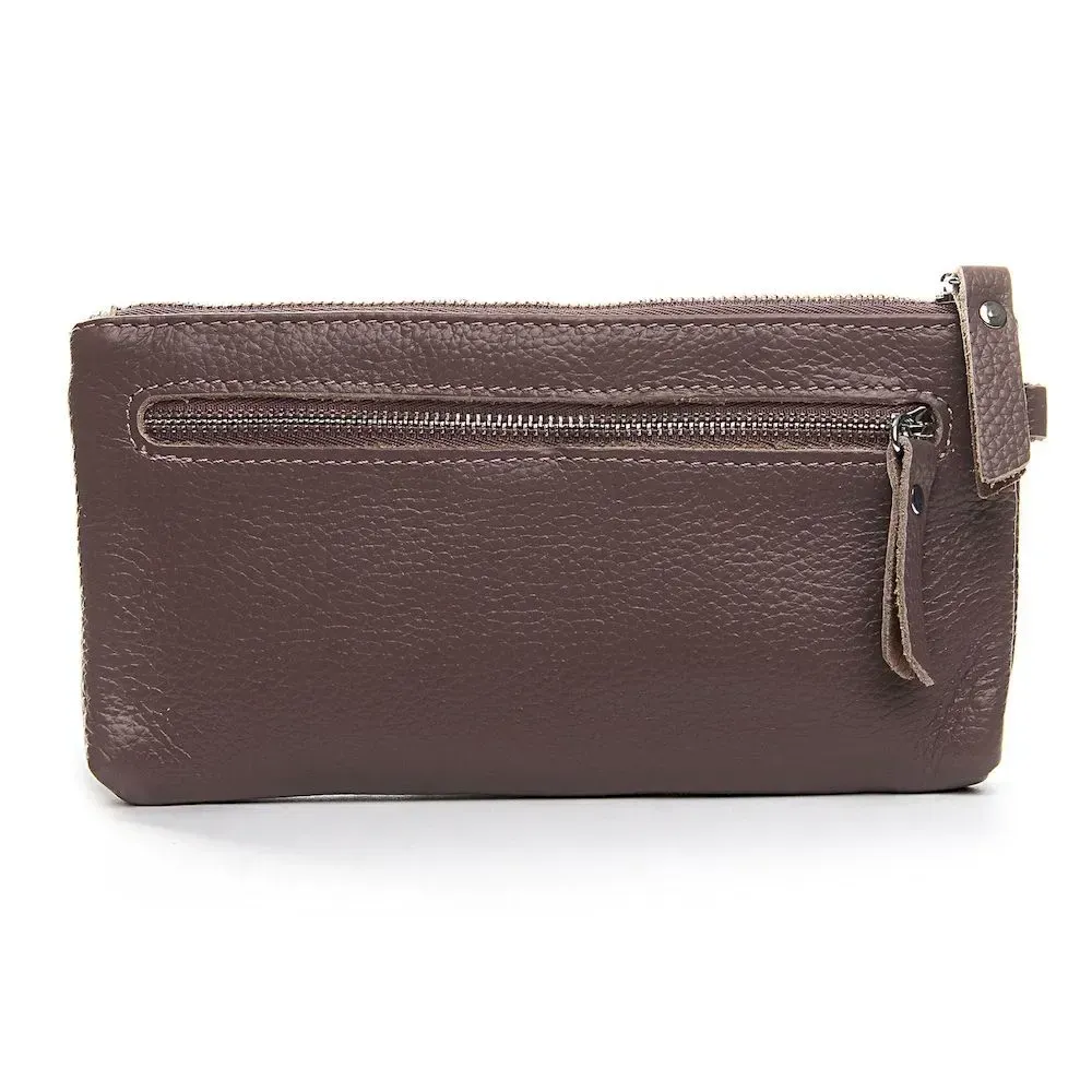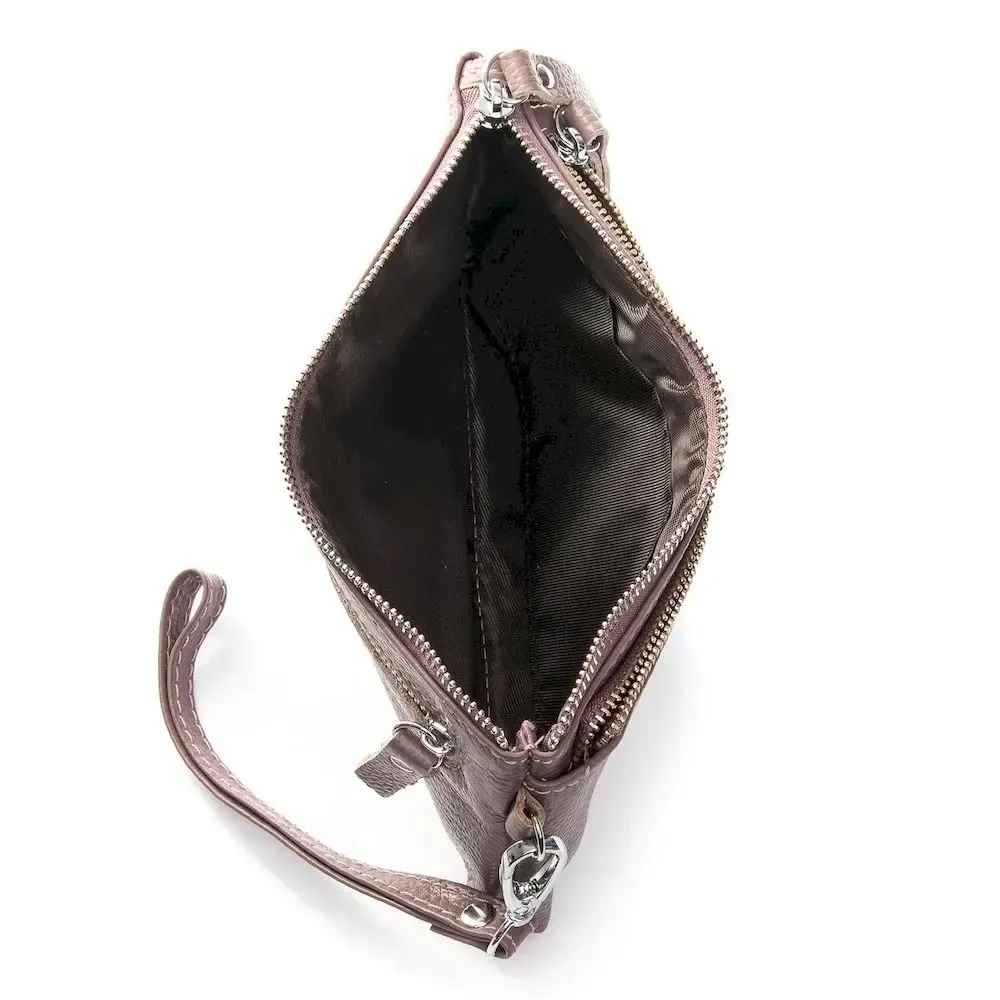 Жіночий шкіряний гаманець-косметичка. Одне основне відділення із кишенею, закривається на блискавку. На фасаді та на звороті є великі кишені на блискавці. У комплекті знімний кистьовий ремінець. Розмір (см.) 20*10*3