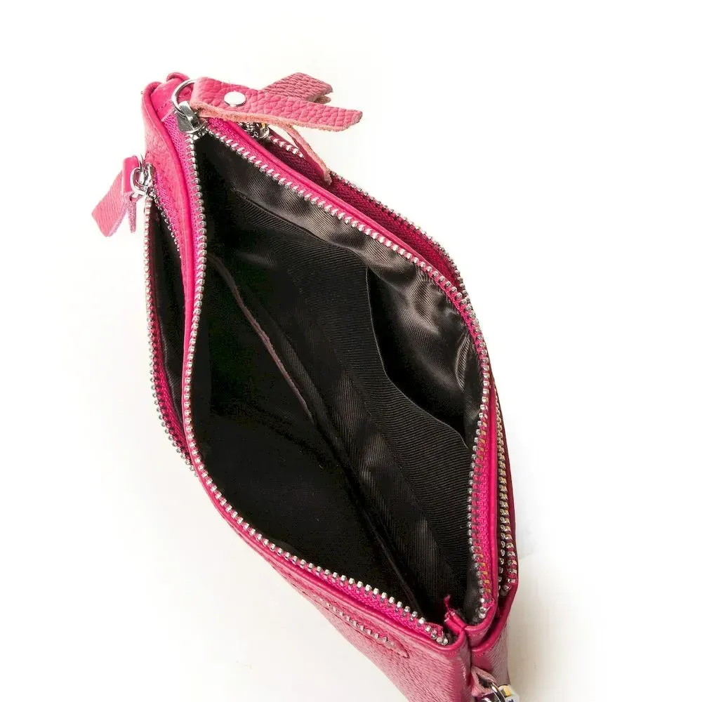 Жіночий шкіряний гаманець-косметичка. Одне основне відділення із кишенею, закривається на блискавку. На фасаді та на звороті є великі кишені на блискавці. У комплекті знімний кистьовий ремінець. Розмір (см.) 20*10*3
