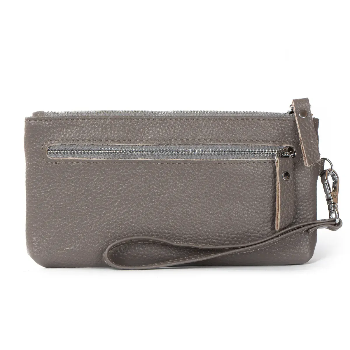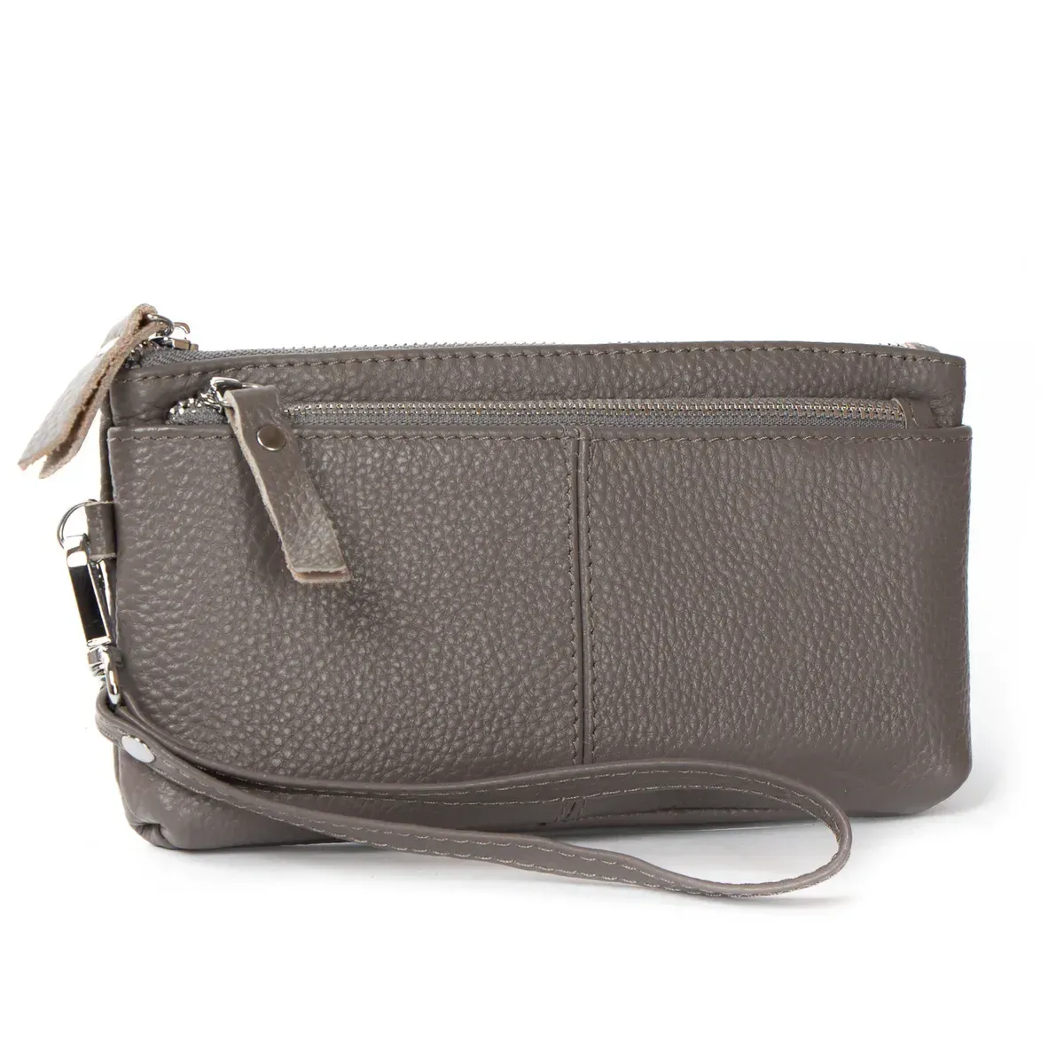 Жіночий шкіряний гаманець-косметичка. Закривається на блискавку. Одне основне відділення з боковою відкритою кишенею. На фасаді та на звороті є великі кишені на блискавці.