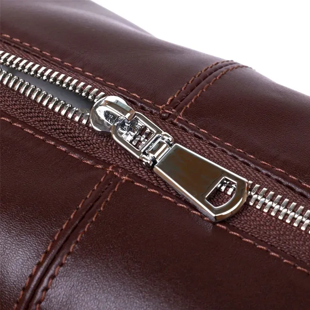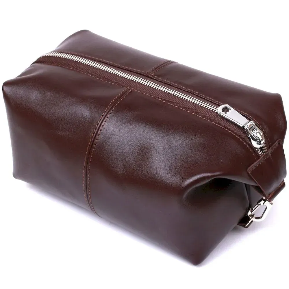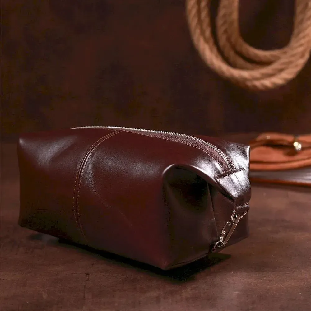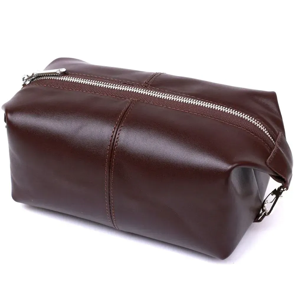 Чудова і практична косметичка, яка стане надійною супутником своєму господареві. Виконано модель з натуральної шкіри, висока якість якої видно неозброєним оком. Колір косметички – коричневий з легким блиском, фактура – гладка і дуже приємна на дотик. Для регулювання обсягу передбачено два маленькі карабіни.