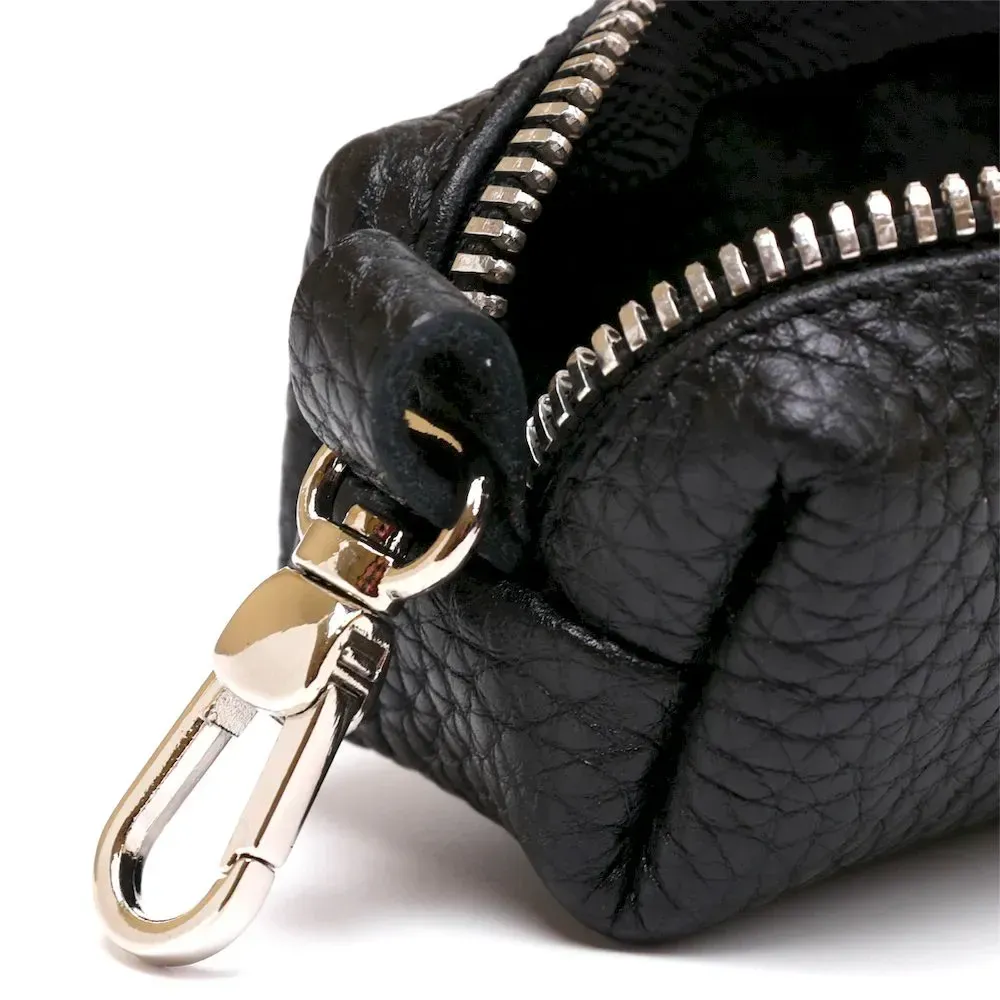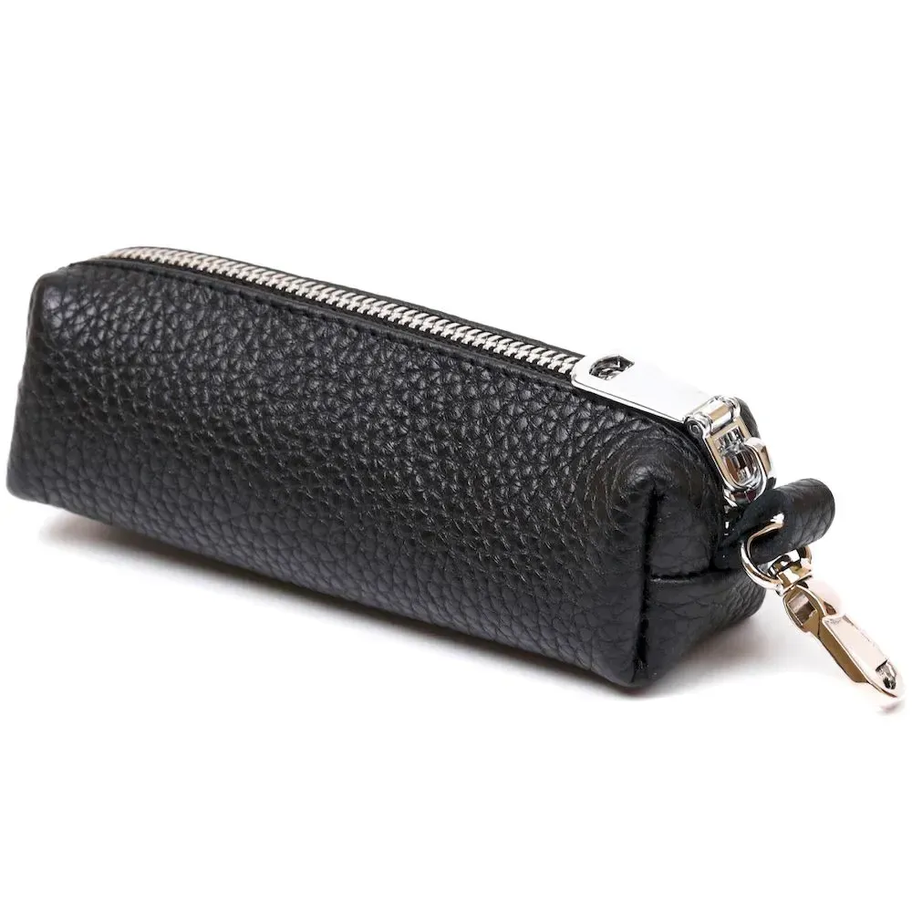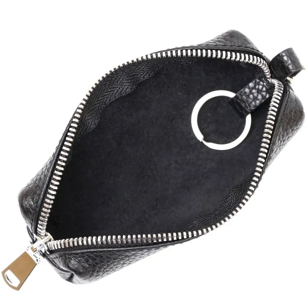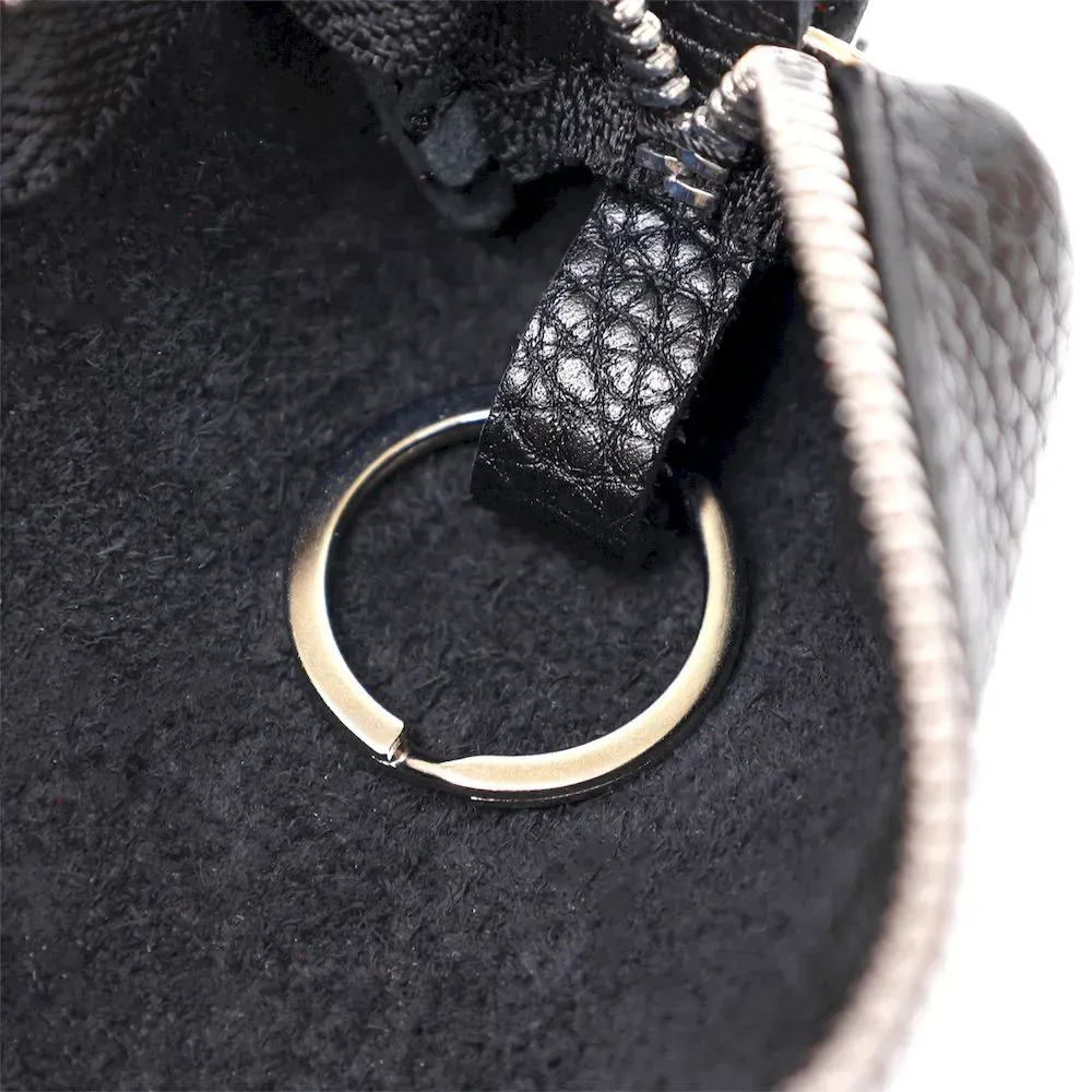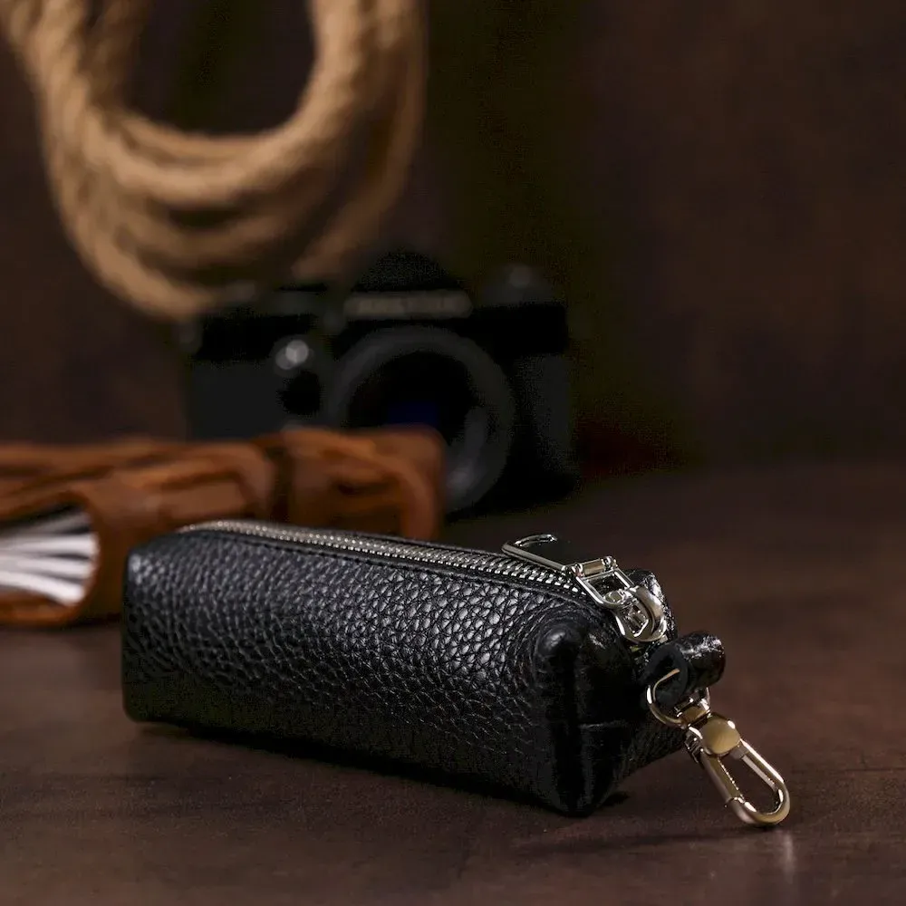 Відмінна ключниця для безпечного зберігання ключів, при цьому вони точно не подряпають вміст сумки або кишені. Виконано виріб із натуральної шкіри високого класу з покращеними показниками стійкості до зносу. Ключі кріпляться на металеве кільце всередині виробу, аксесуар закривається на блискавку. Колір – класичний чорний.