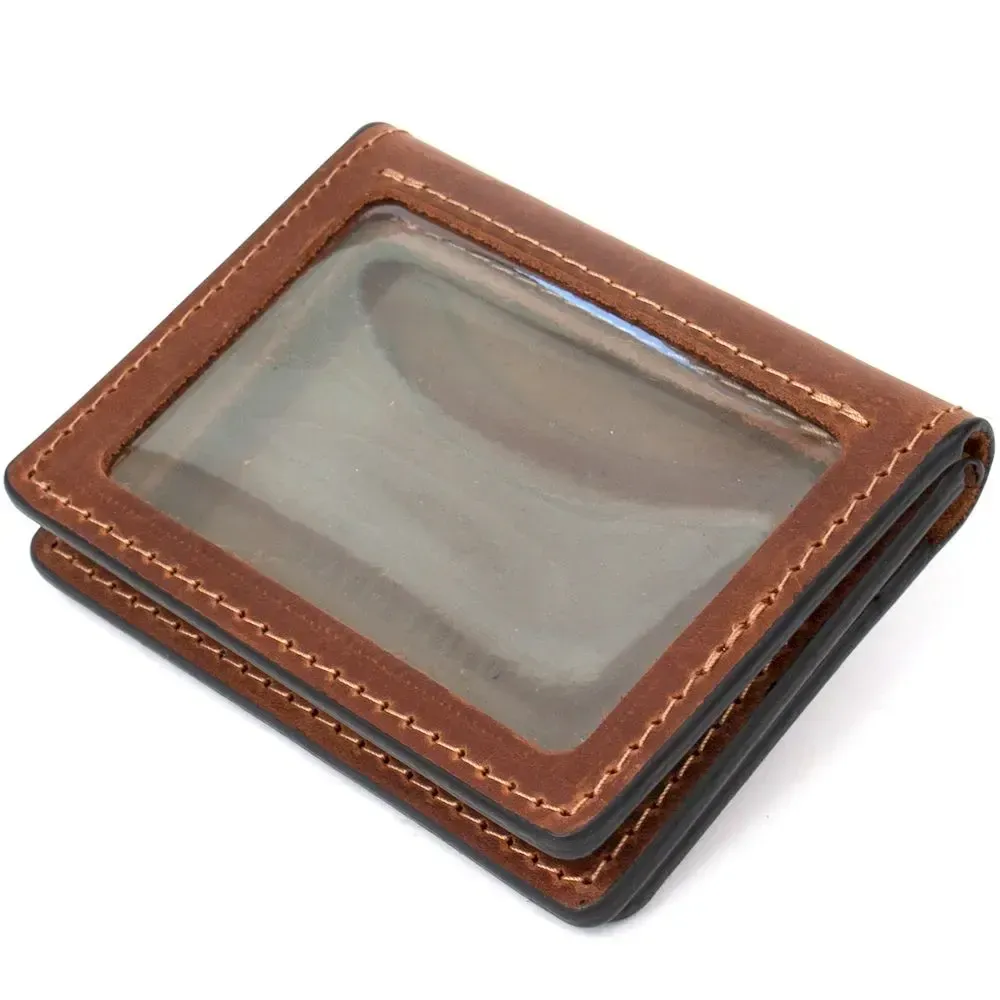 Компактна візитниця з якісної натуральної шкіри в благородному коричневому кольорі. Має гладку та м'яку вінтажну фактуру. Усередині є прозорі слоти для карт та звичайні. Упаковка представлена у вигляді фірмового чохла.