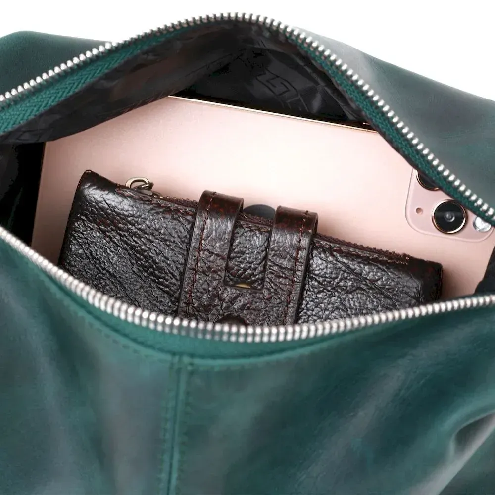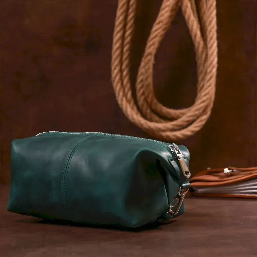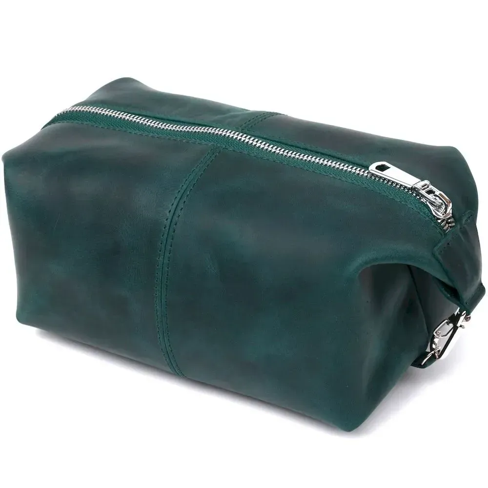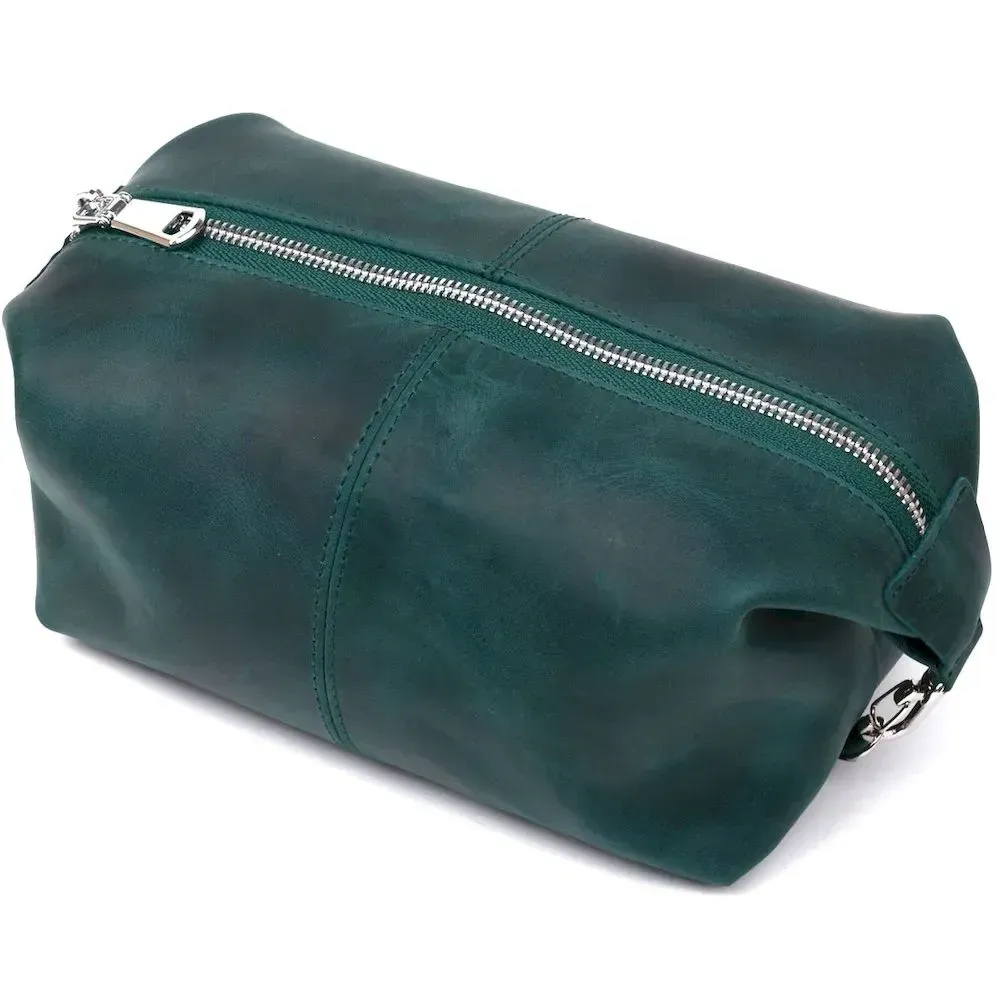 Добротна косметичка від українського виробника, яку можна використовувати для зберігання негабаритних речей, документів, косметики та ін. Виконано аксесуар з натуральної висококласної шкіри з відмінними характеристиками. Колір виробу – темно-зелений, фактура – гладка матова з вінтажними нотками.