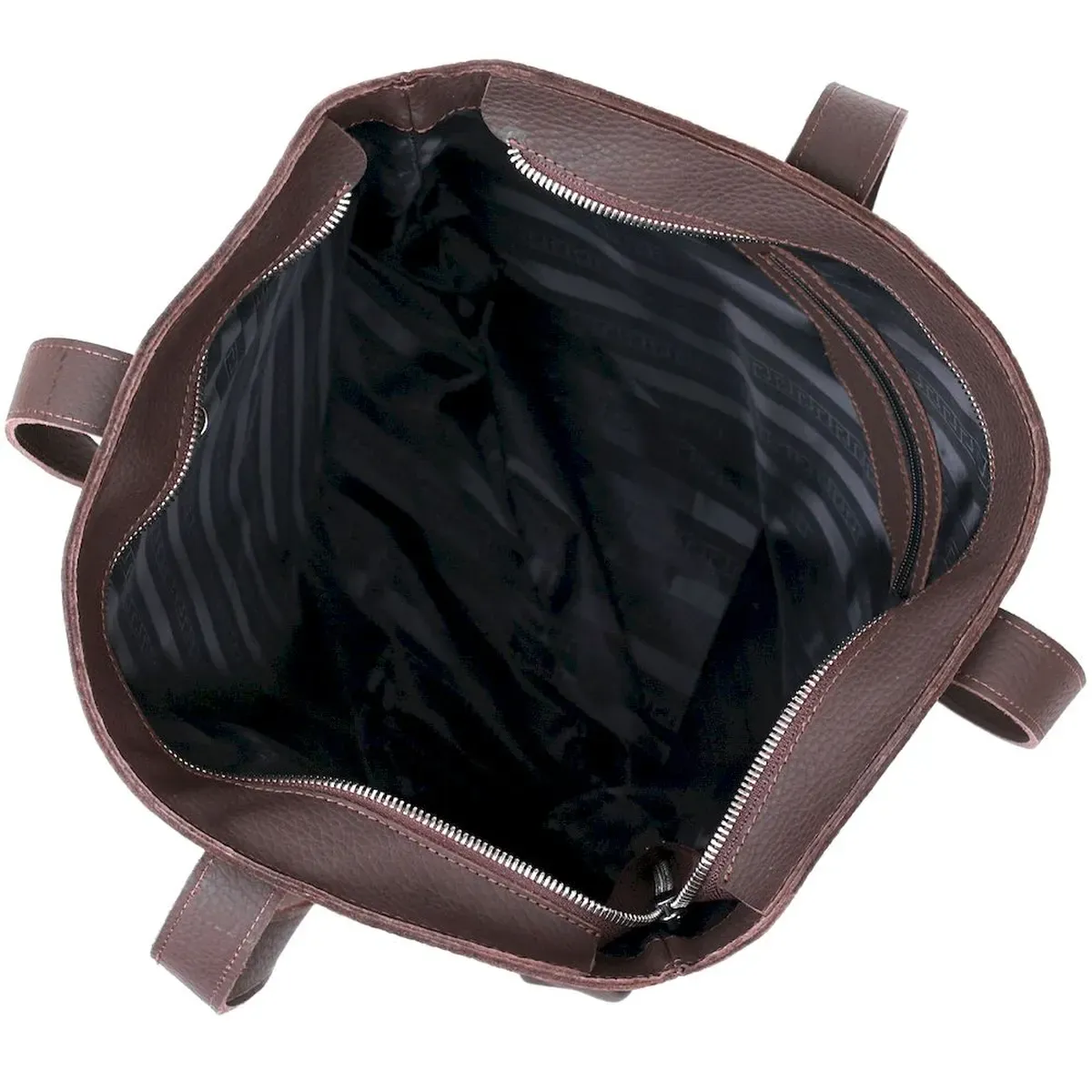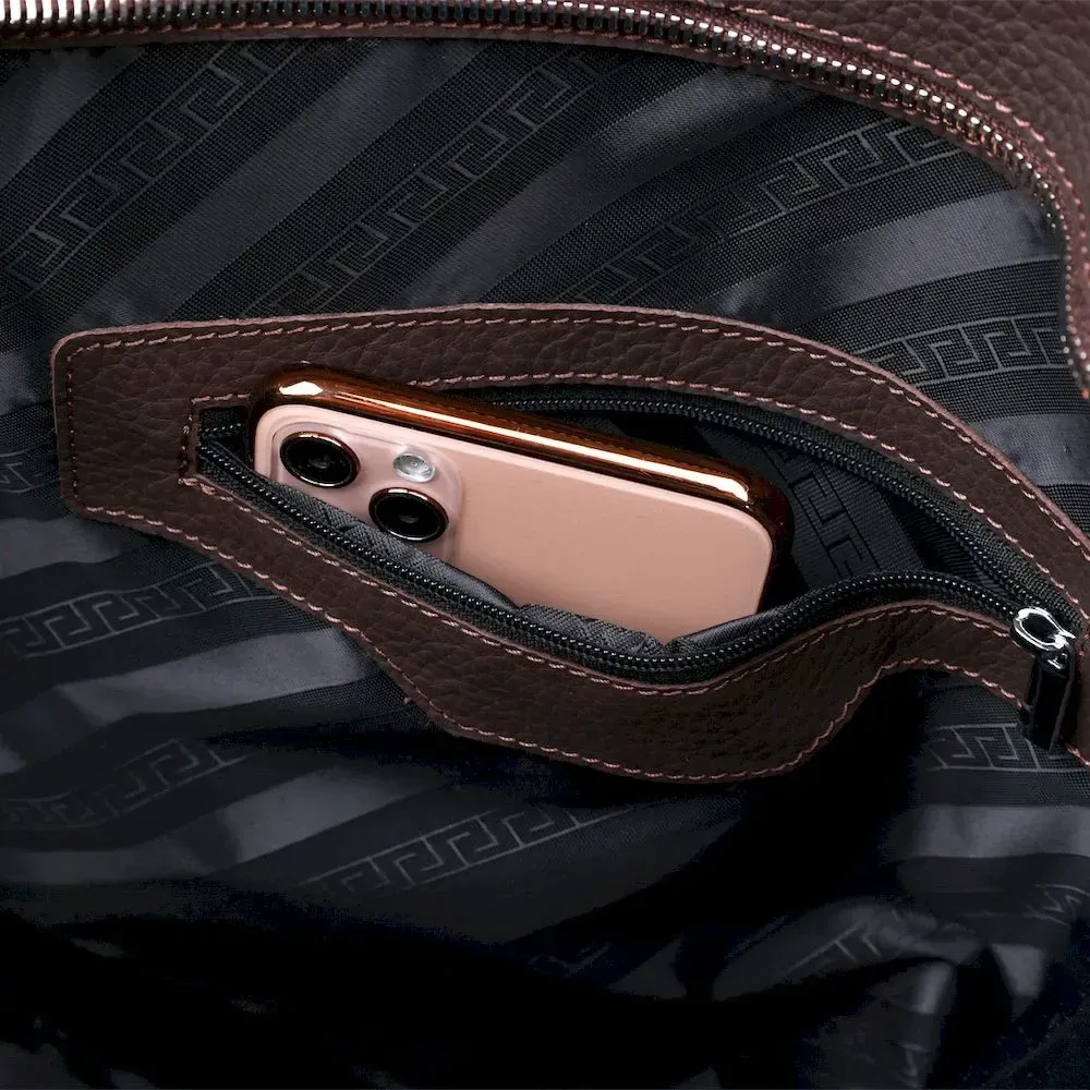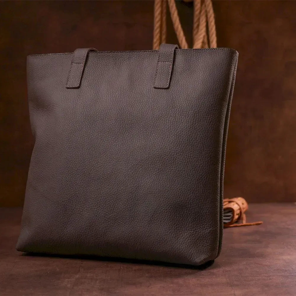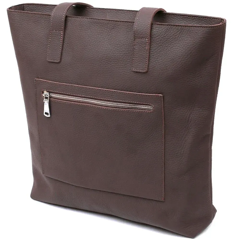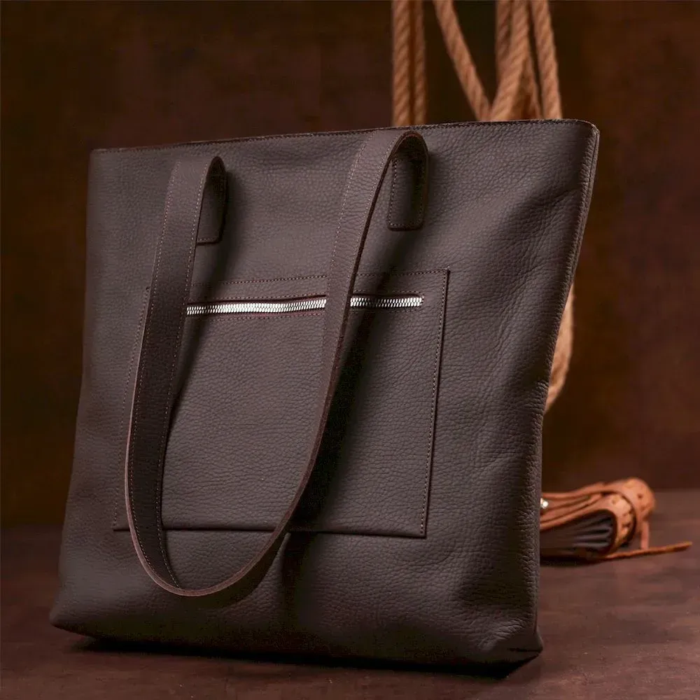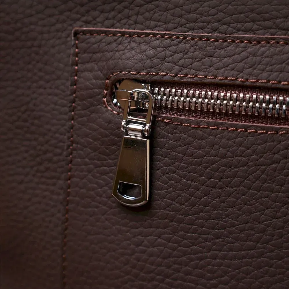 Чудова сумка для жінок, які віддають перевагу просторим та містким аксесуарам. Колір цієї моделі – матовий коричневий, фактура – зерниста і дуже приємна на дотик. Виконано сумку з високоякісної натуральної шкіри з відмінними характеристиками. Основне відділення закривається на блискавку. На зовнішній стороні є невелика кишеня на блискавці для швидкого доступу до його вмісту.
