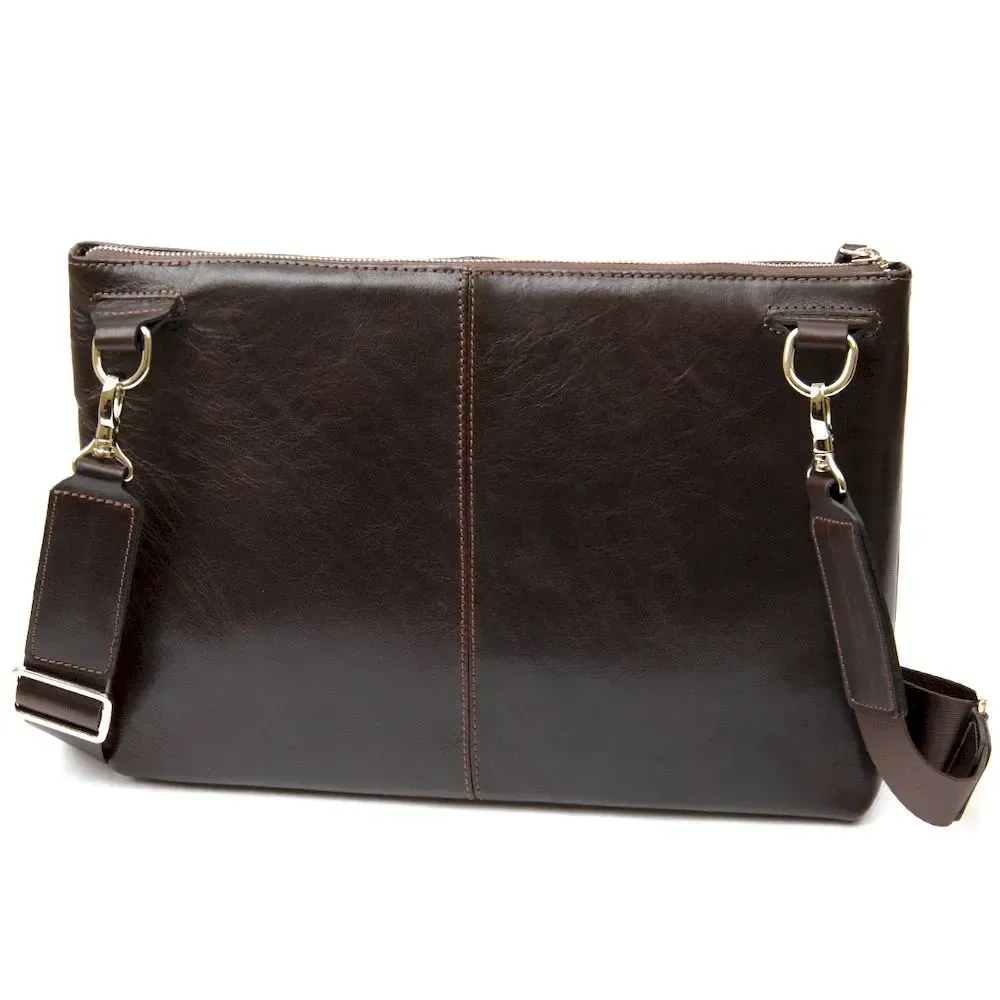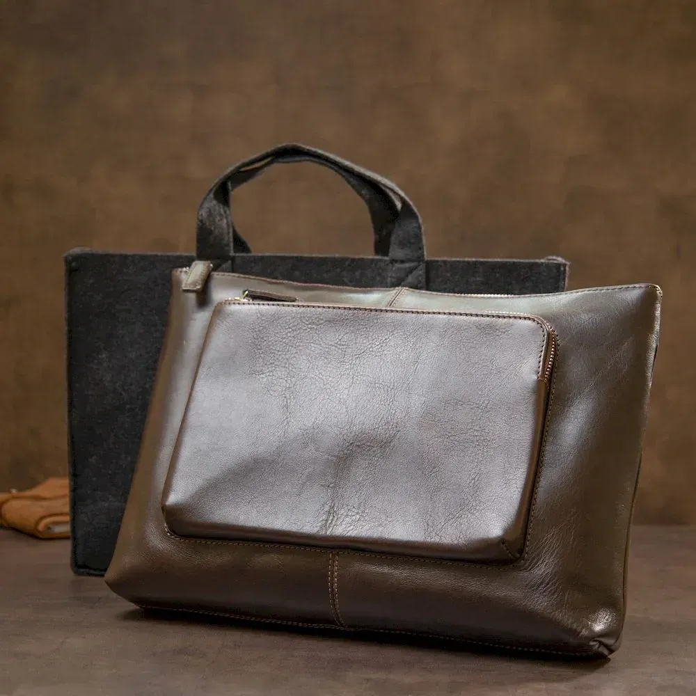 - знімний плечовий ремінь текстильний – регулюється по довжині. Добротна гарна сумка для ноутбука в глянсовому коричневому кольорі. Виконана із натуральної високоякісної шкіри. Закривається сумка на міцну та надійну блискавку, всередині є містке основне відділення та відділення на липучці для ноутбука. Папери А4 легко помістяться в даний аксесуар. Запакована сумка у гарний фірмовий чохол чорного кольору з ручками.
