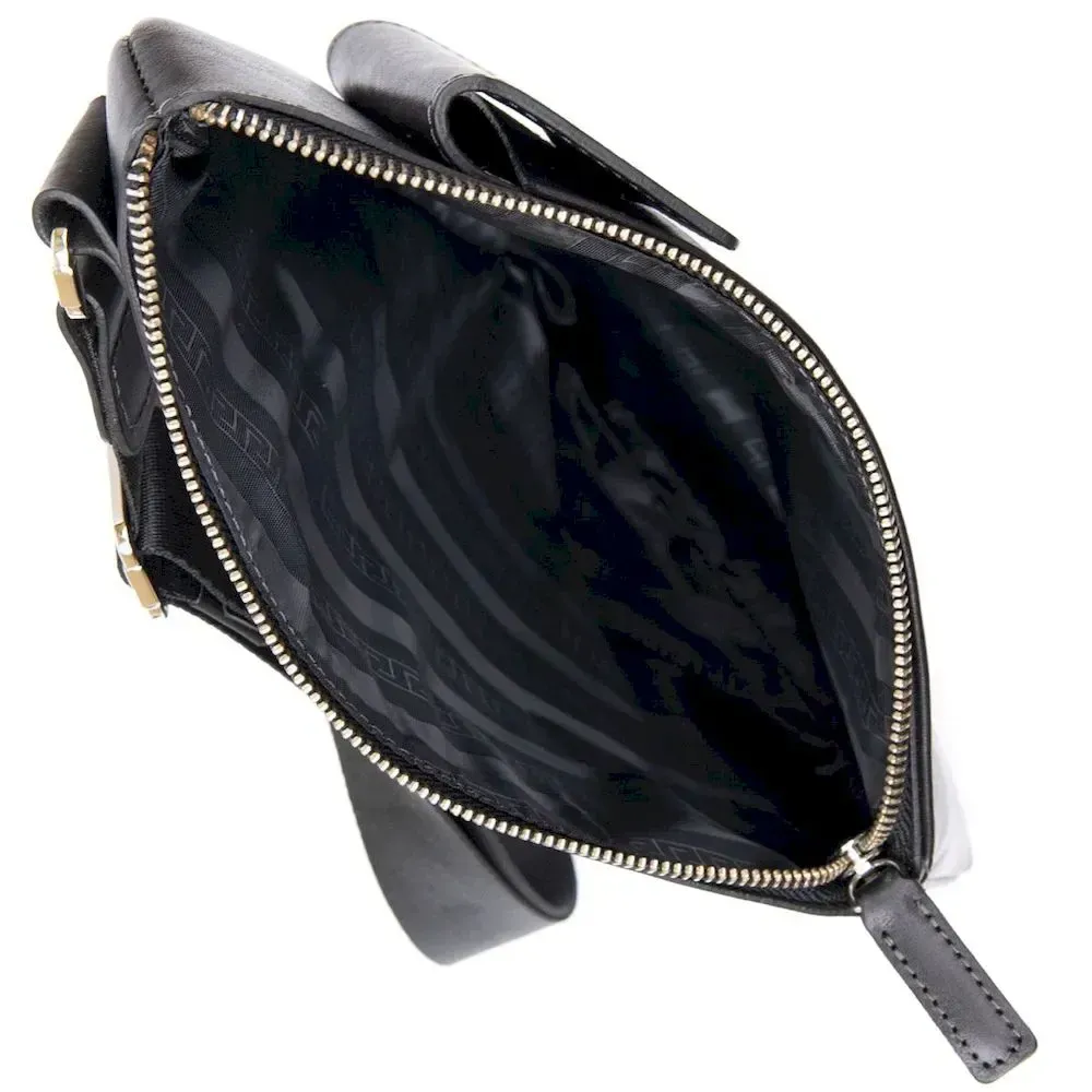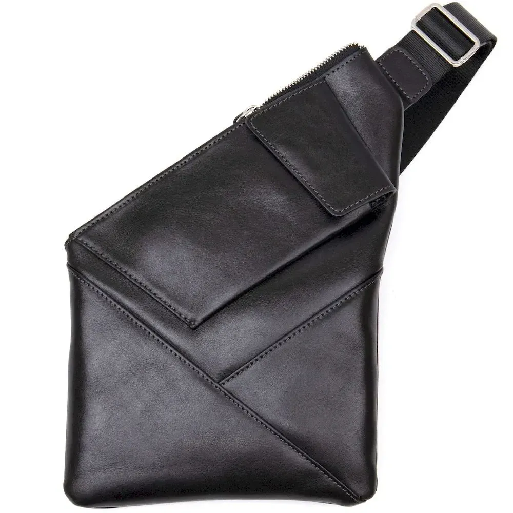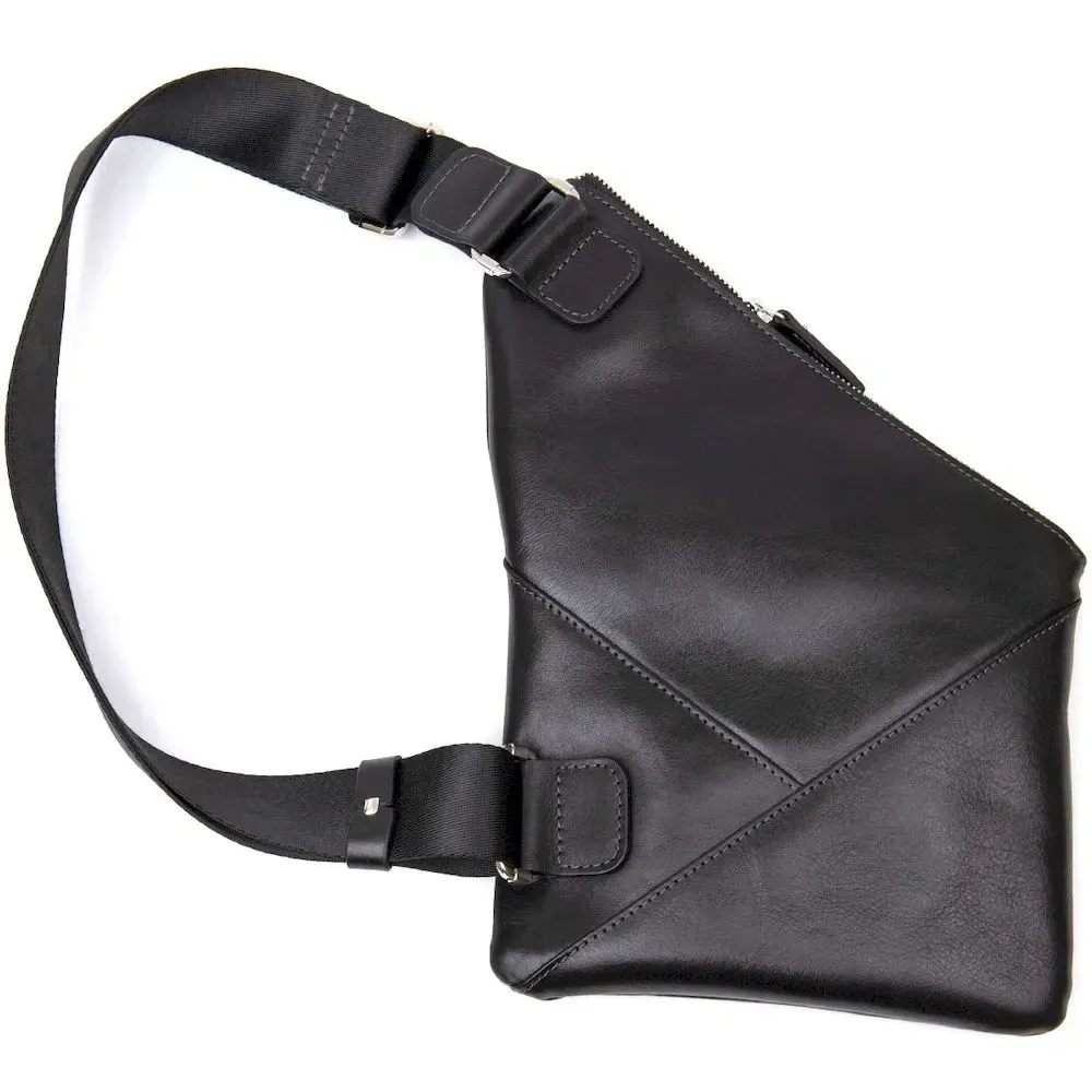 - плечовий ремінь текстильний – регулюється по довжині. Цікава чоловіча сумка через плече нестандартної форми, яка дуже модна на сьогоднішній день. Виконана з міцної та зносостійкої натуральної шкіри. Колір чорний, фактура гладка та глянсова. Ремінь із міцного текстилю, його можна регулювати за довжиною. Упакована ця сумка в гарний фірмовий чохол з ручками.