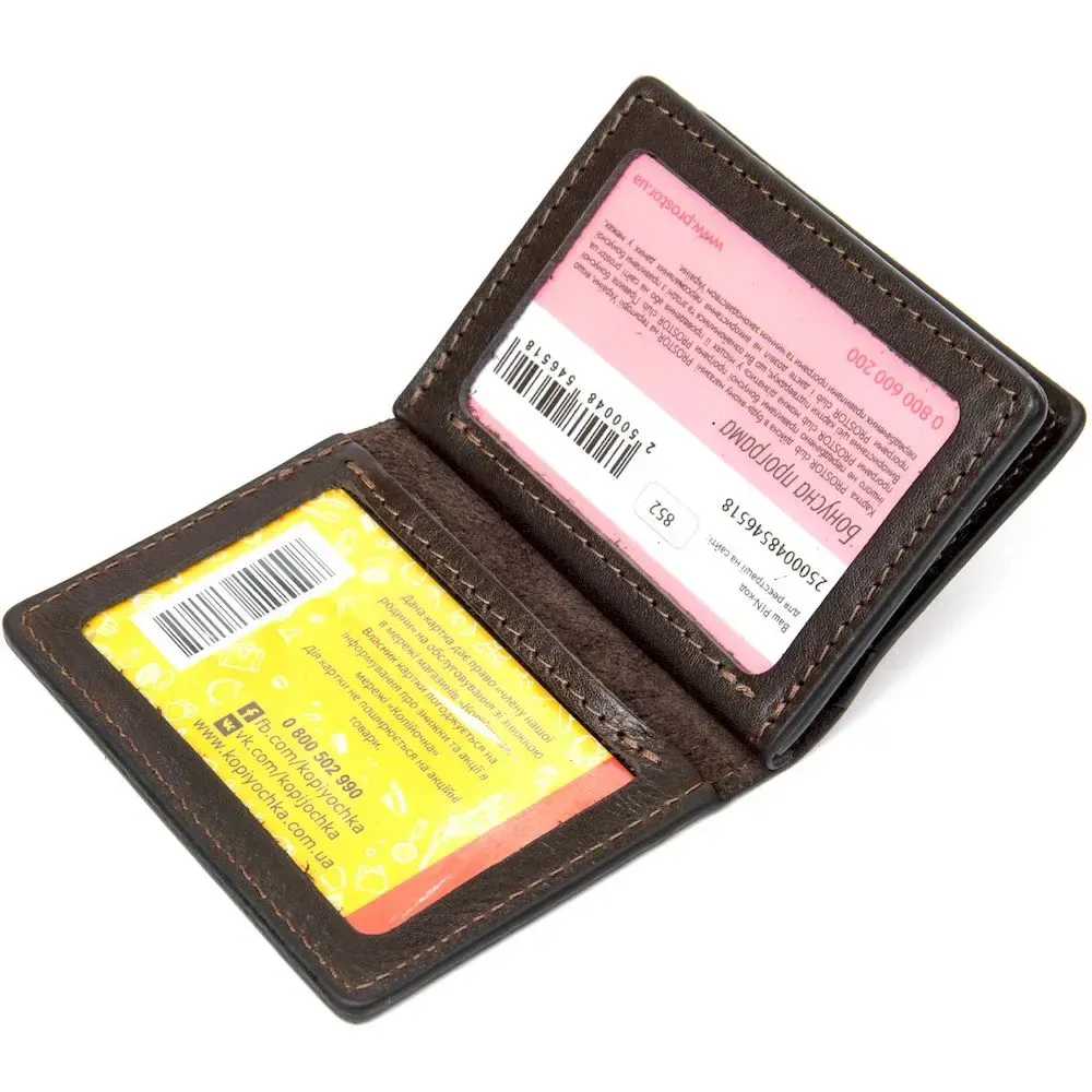 Чудове рішення для зберігання Ваших автодокументів. Обкладинка виготовлена з натуральної високоякісної шкіри. Має красивий темно-коричневий колір і акуратні шви трохи світліше відтінку. Дві двосторонні прозорі кишені та два слоти для карт- це і є оптимальне наповнення подібних виробів.
