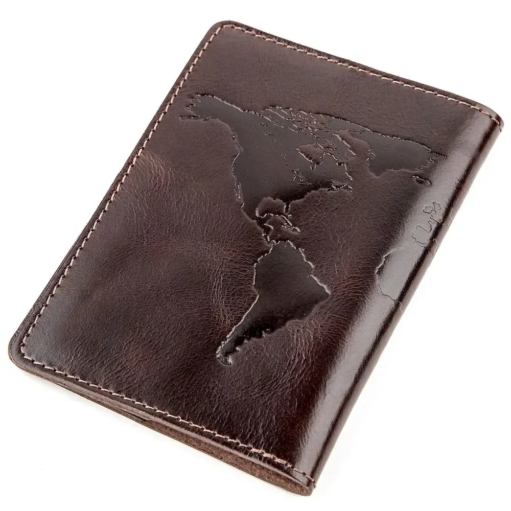 Якісна та стильна обкладинка на паспорт, коричневого кольору із зображенням карти світу, виготовлена з високоякісної натуральної шкіри. Сучасний висококласний аксесуар, який стане незабутнім подарунком для ваших коханих та близьких. З такою обкладинкою ваш паспорт буде надійно захищений від зношування.