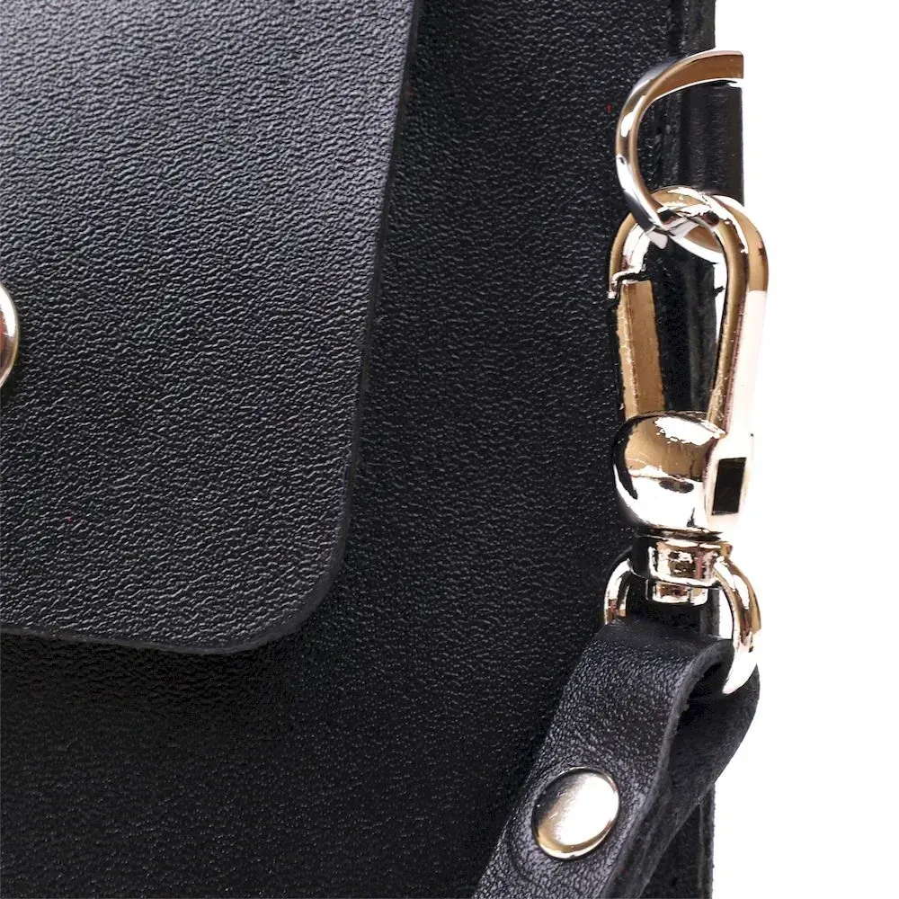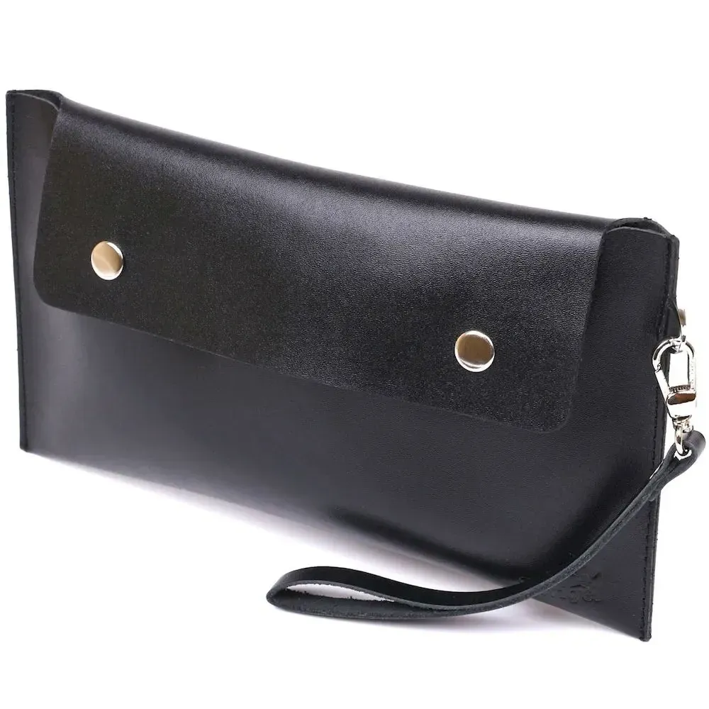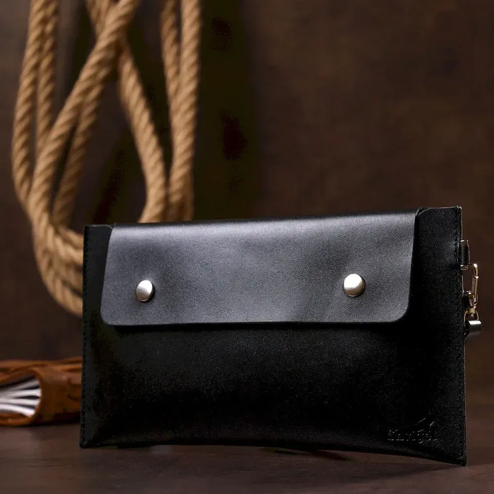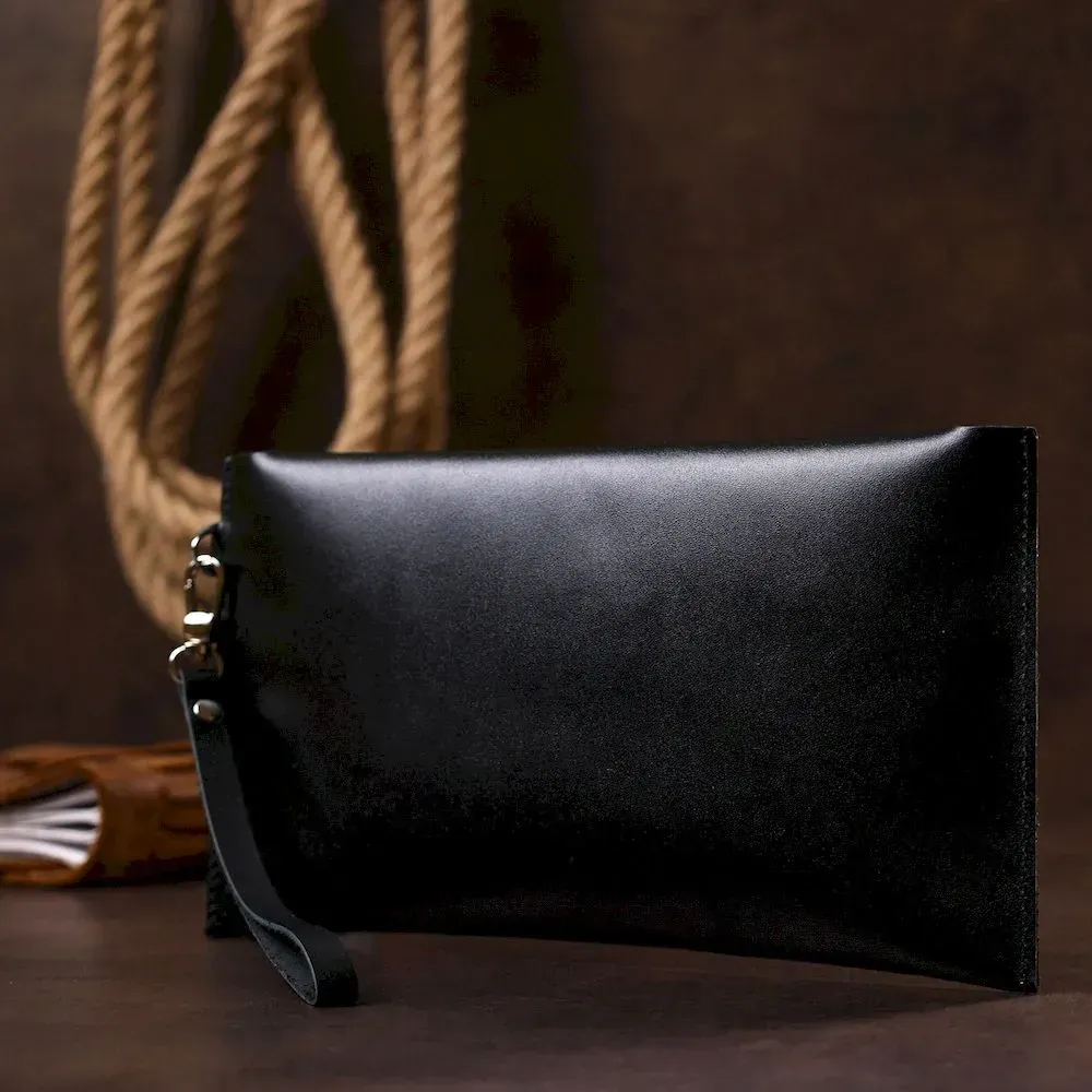 Відмінна тревел-косметичка з гладкої натуральної шкіри з високими показниками стійкості до зносу. Має класичний чорний колір, приємну на дотик фактуру та фурнітуру у кольорі під срібло. Закривається аксесуар на дві кнопки із клапаном. Ремінець на зап'ясті також виготовлений з натуральної шкіри. Така косметичка стане гарним подарунком близькій людині.