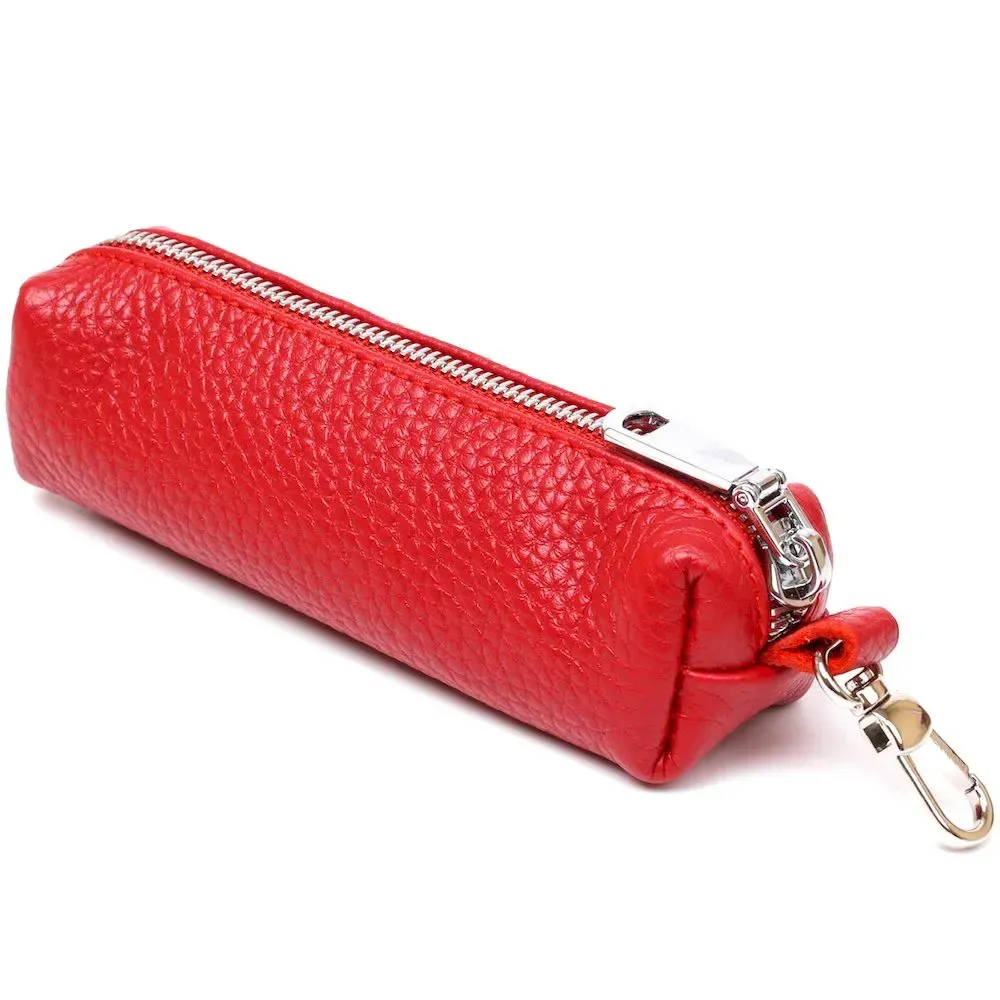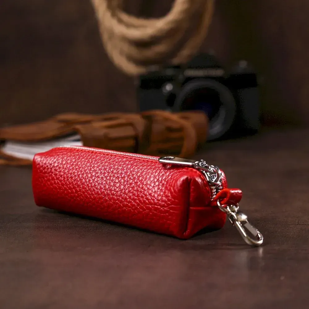 Красива і практична жіноча ключниця в насиченому червоному кольорі. Має зернисту фактуру, яка дуже приємна на дотик. Фурнітура виготовлена в кольорі під срібло. Матеріал виготовлення – натуральна шкіра високої якості та відмінної опірності до зносу. З таким аксесуаром ключі будуть надійно заховані.