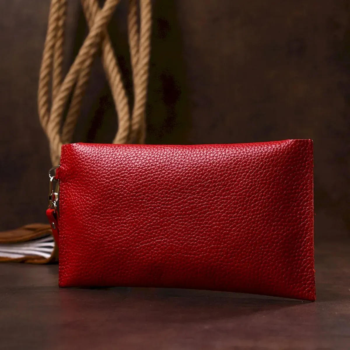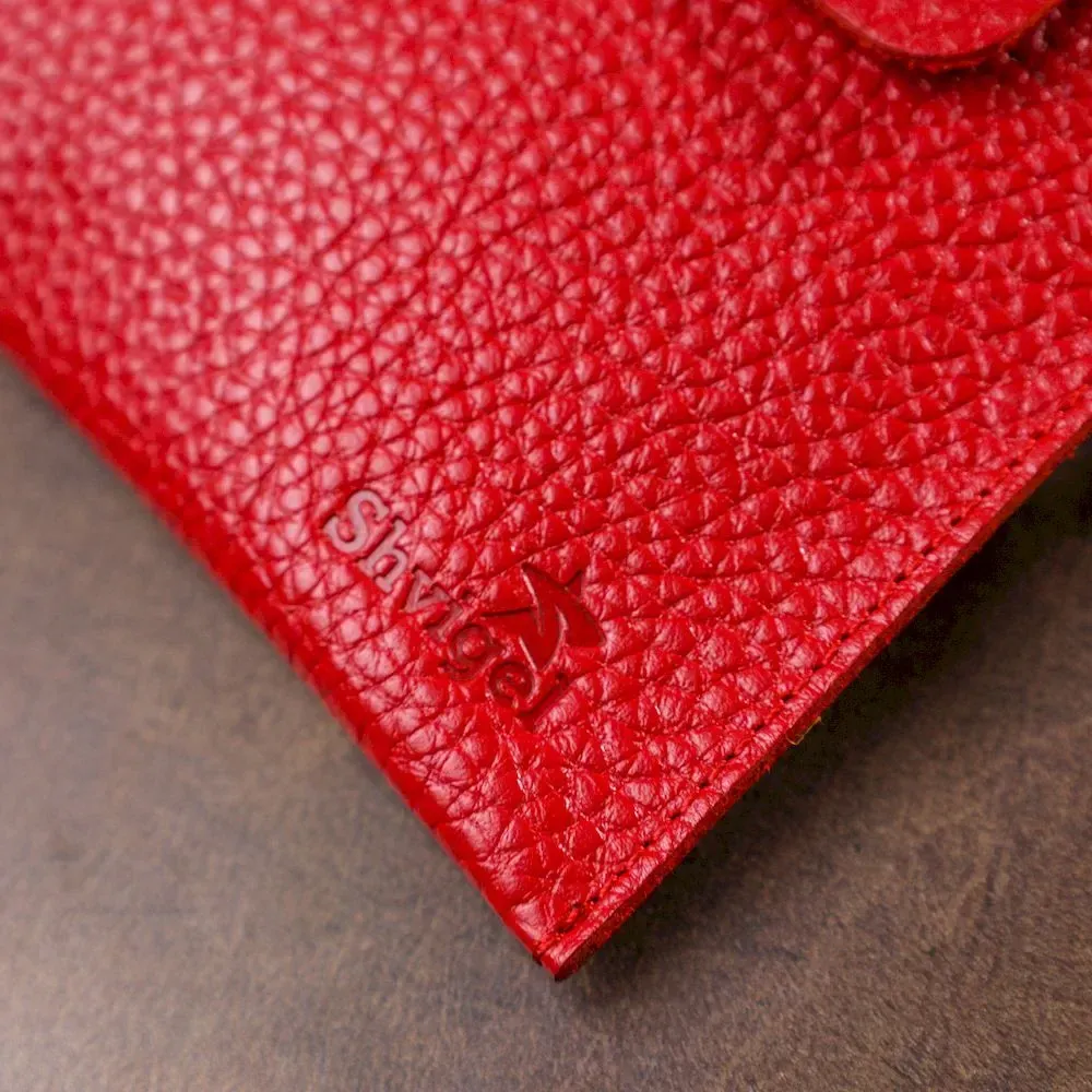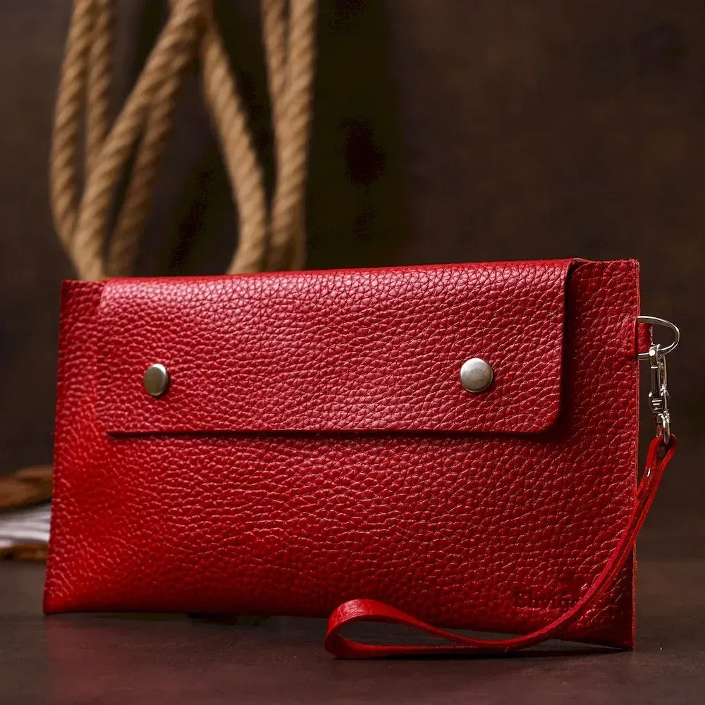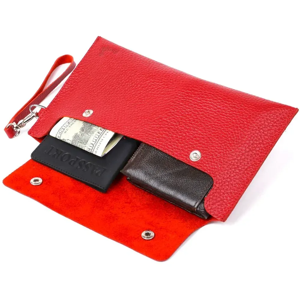 Чудовий і просто незамінний аксесуар, особливо в дорозі. Відмінно містить у собі всі цінні папери та документи. Матеріал виготовлення – натуральна шкіра, висока якість якої видно неозброєним оком. Закривається на клапан із кнопками. Колір виробу – червоний, фактура – крупно-зерниста, сама шкіра дуже м'яка і приємна на дотик.