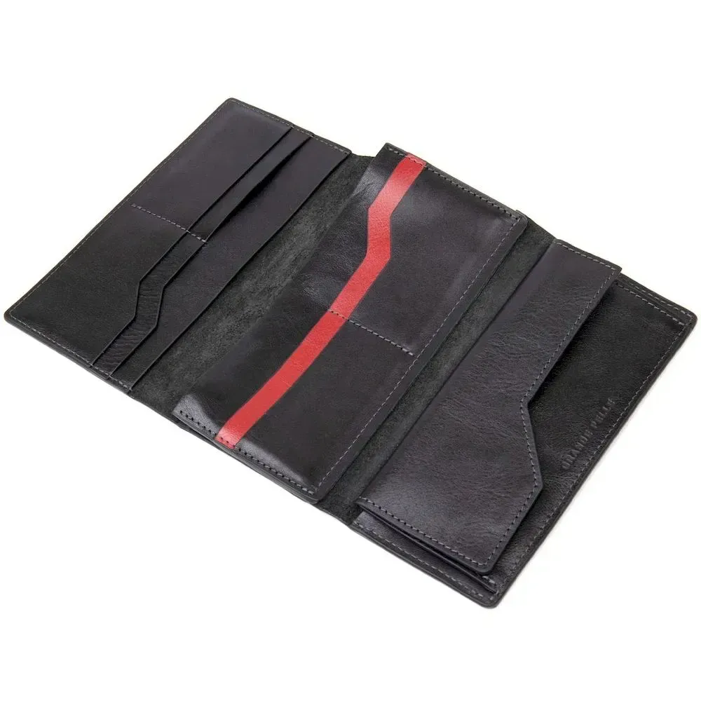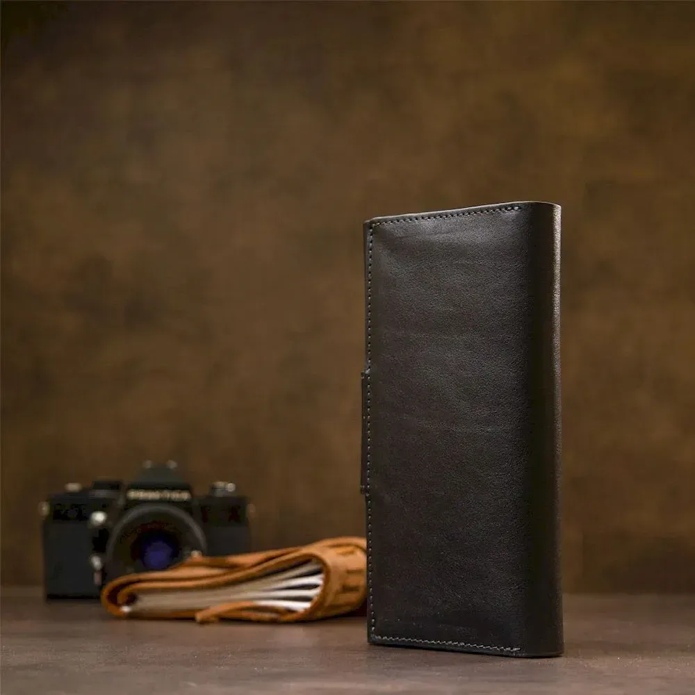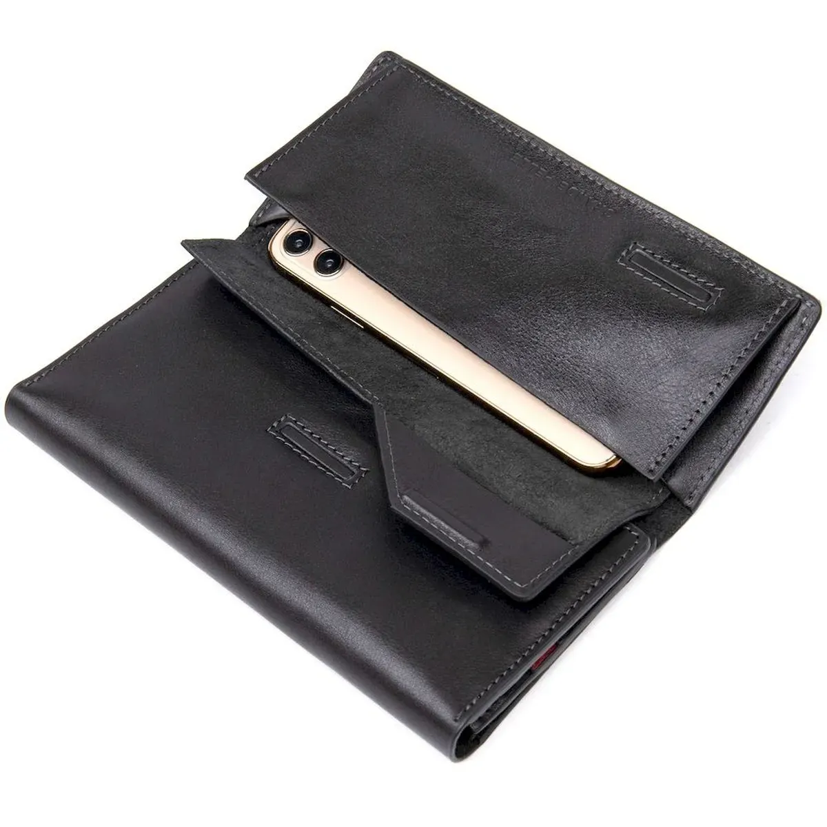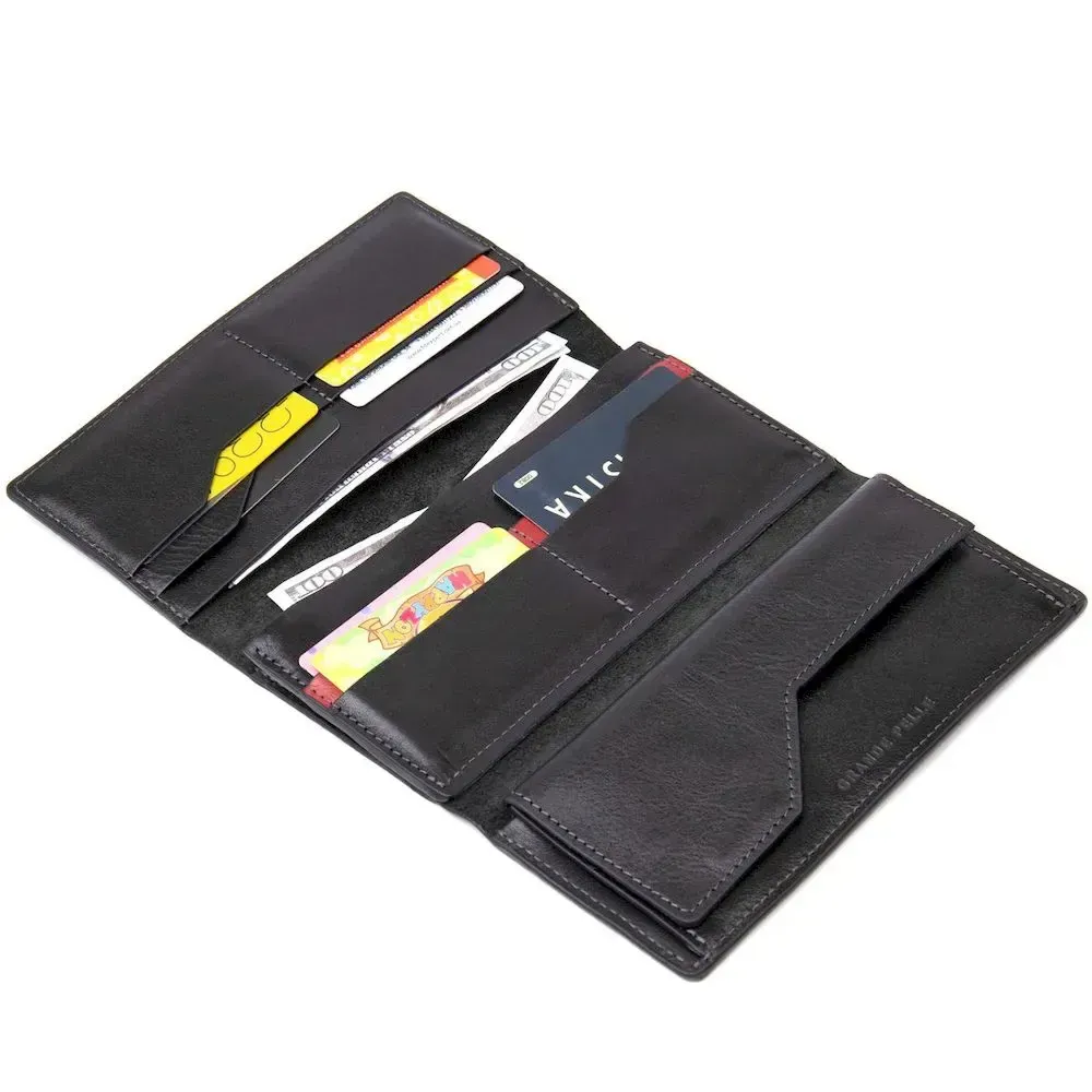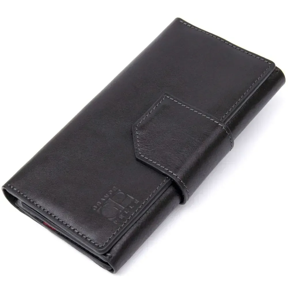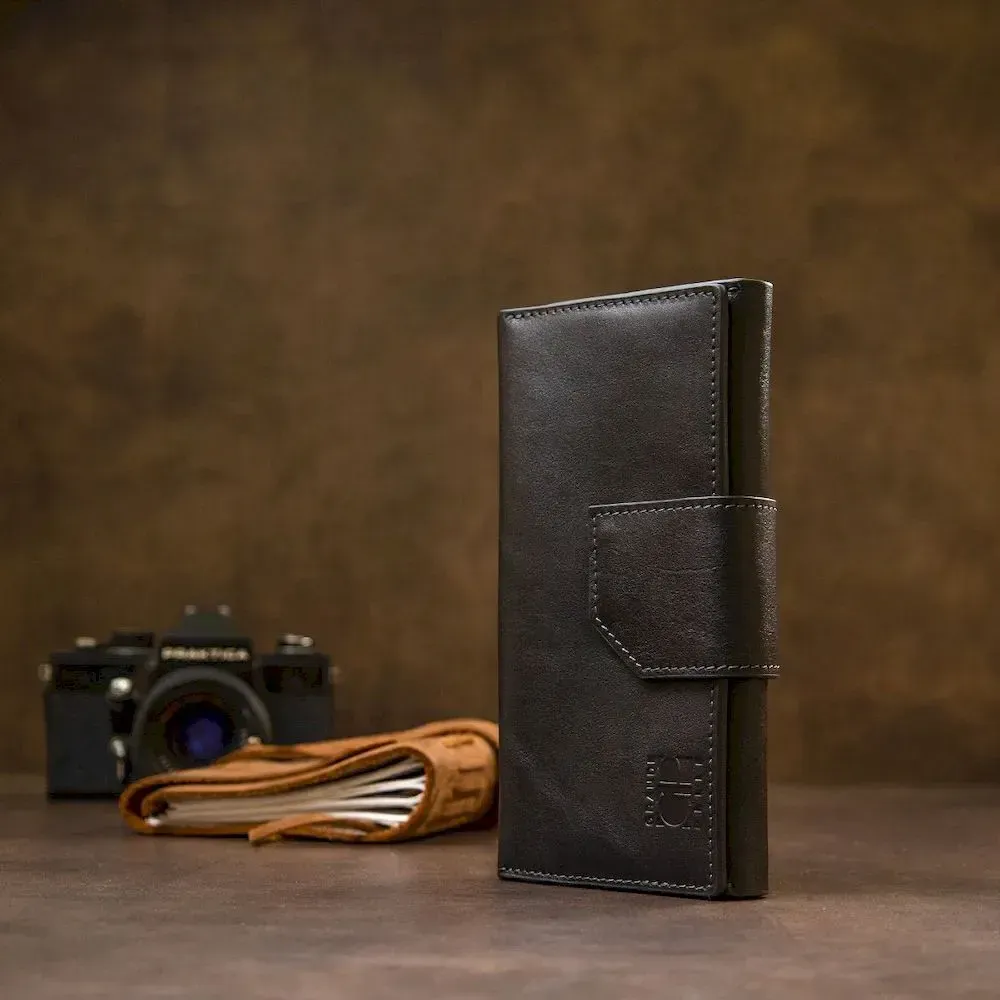 Багатофункціональне портмоне на хлястиці з магнітом. Має всередині місткі та практичні відділення для купюр, велику монетницю на магніті та вісім слотів для різних карт та візиток. Матеріал виготовлення – натуральна м'яка на дотик шкіра. Колір виробу чорний, що робить гаманець практично універсальним. Упаковка – фірмова картонна коробка.