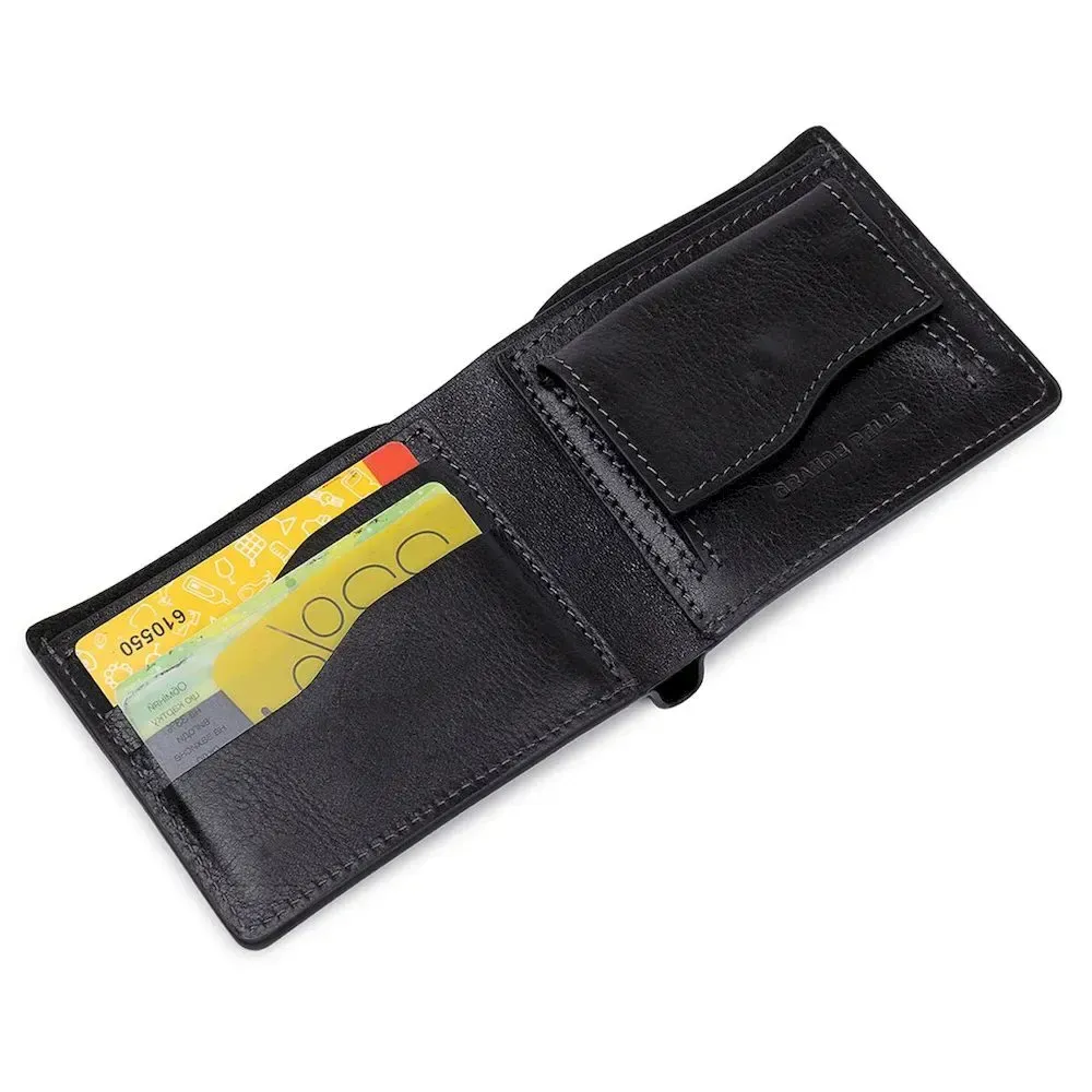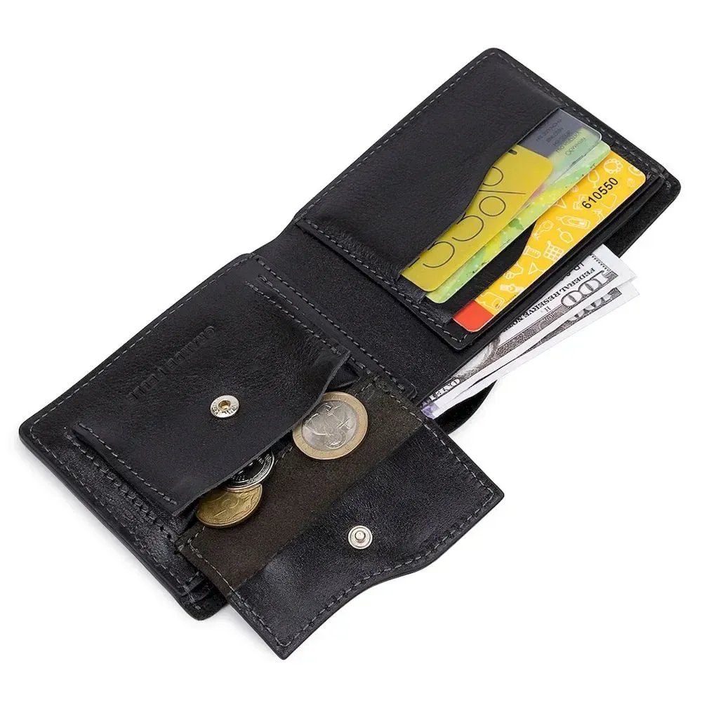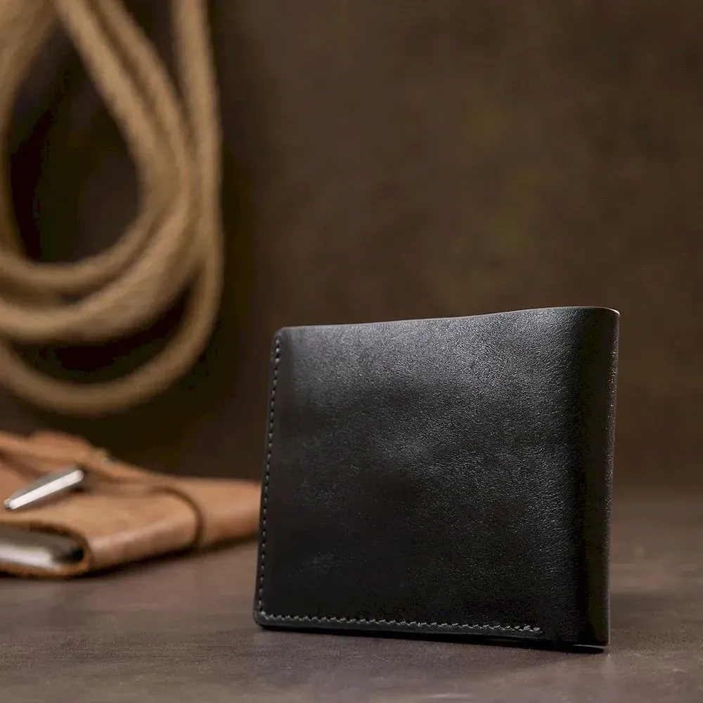 Класичне чоловіче портмоне невеликого розміру у глянсовій гладкій фактурі. Матеріал виготовлення – натуральна зносостійка шкіра високої якості. Усередині є відділення для купюр, слоти для пластикових карток та візиток, а також монетниця на кнопці. Упаковано виріб у фірмовий ущільнений чохол.