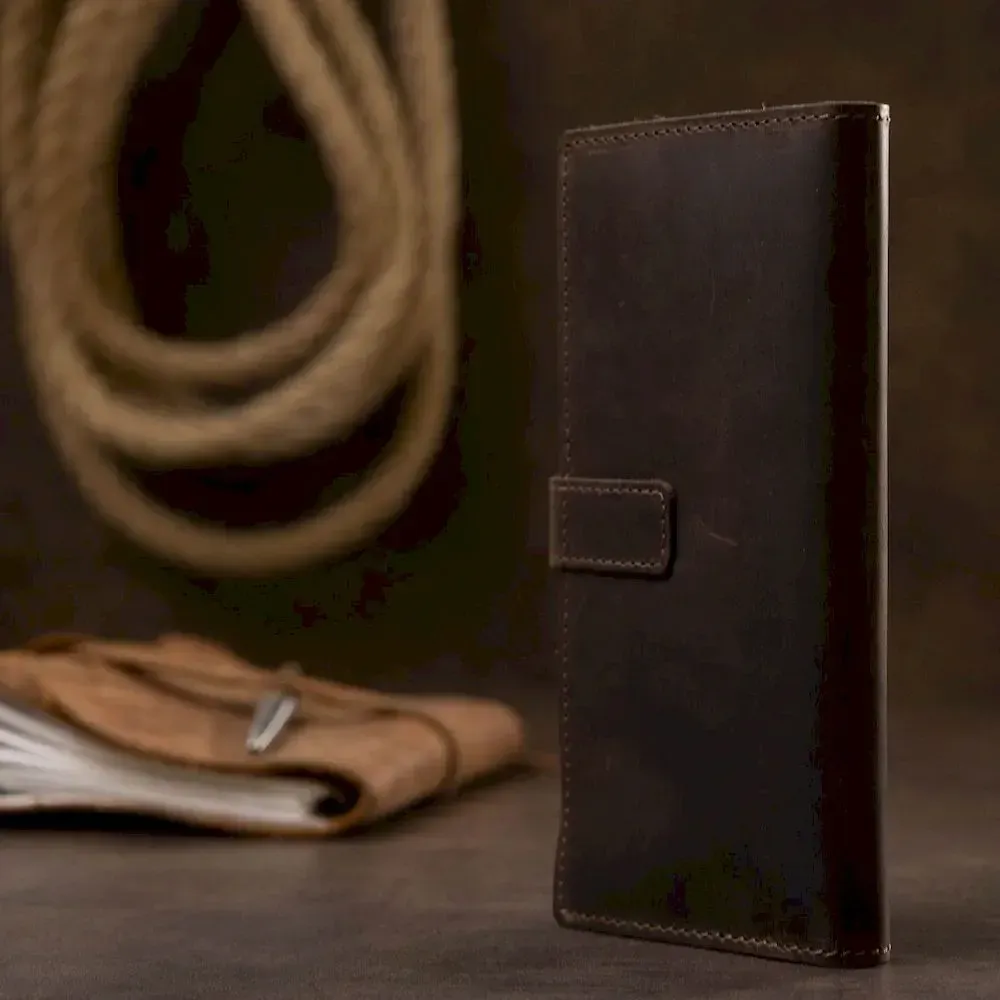 - 7 кишень для карток Невеликий чоловічий портмоне в красивому матовому коричневому кольорі. Виконано воно з натуральної високоякісної шкіри, яка стійка до різних ушкоджень. Усередині є просторі відділення для купюр, зручна монетниця на блискавці та кишені для візитних чи кредитних карток. Упаковка представлена у вигляді фірмової картонної коробки білого кольору.