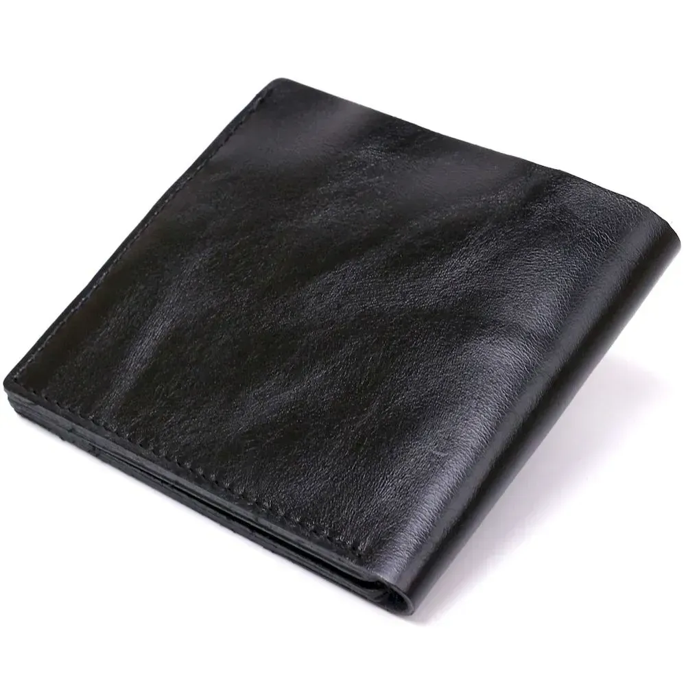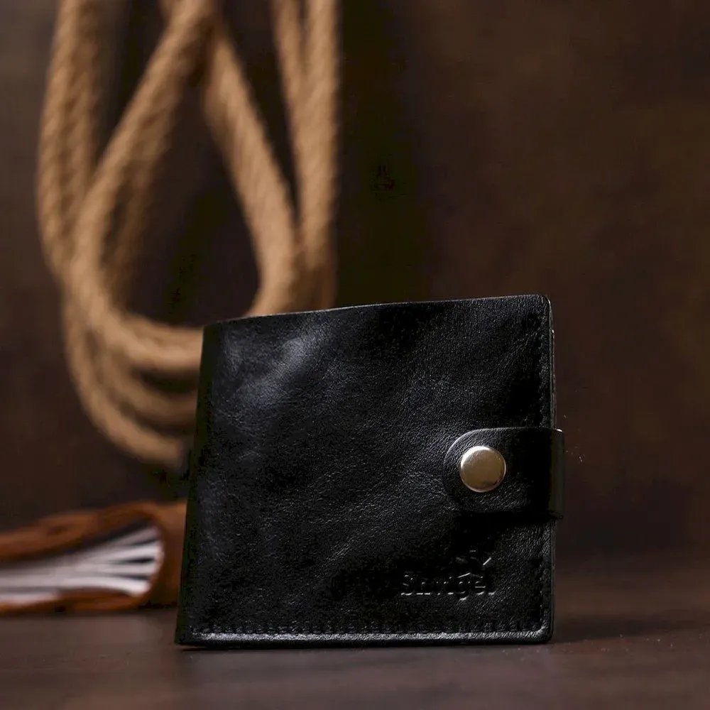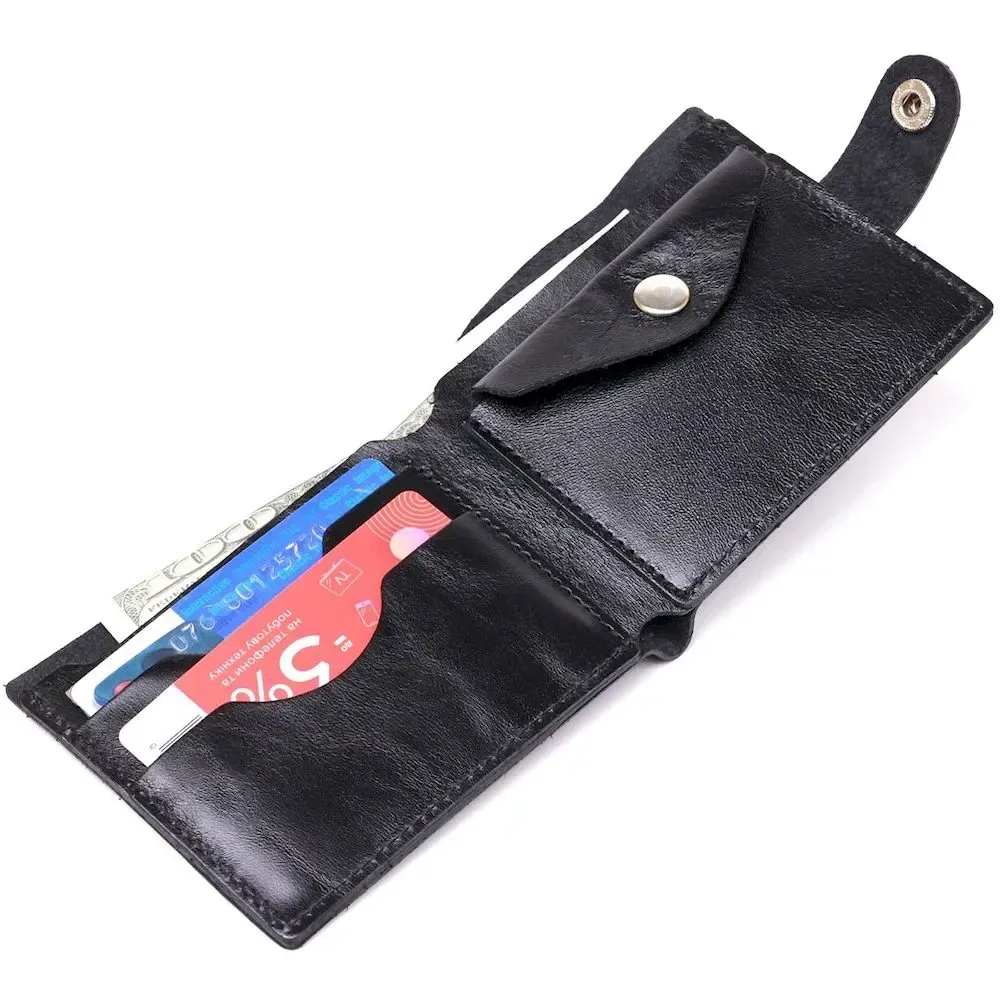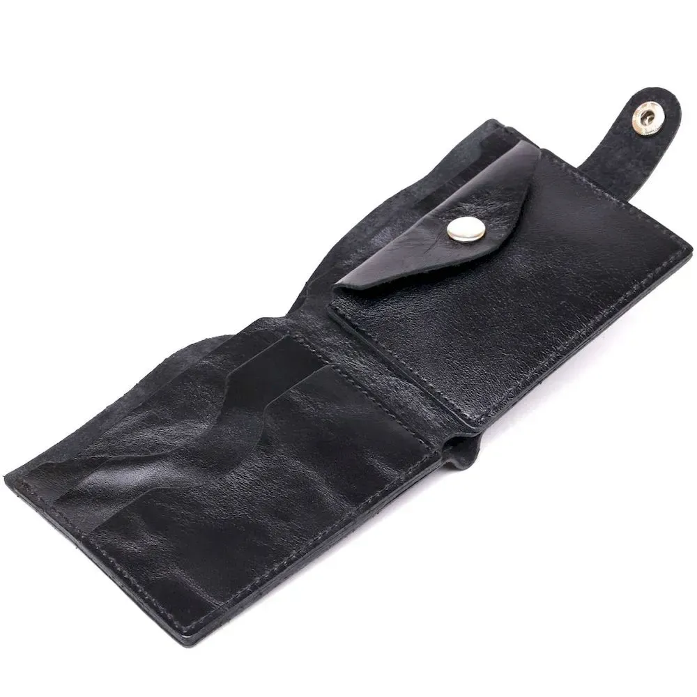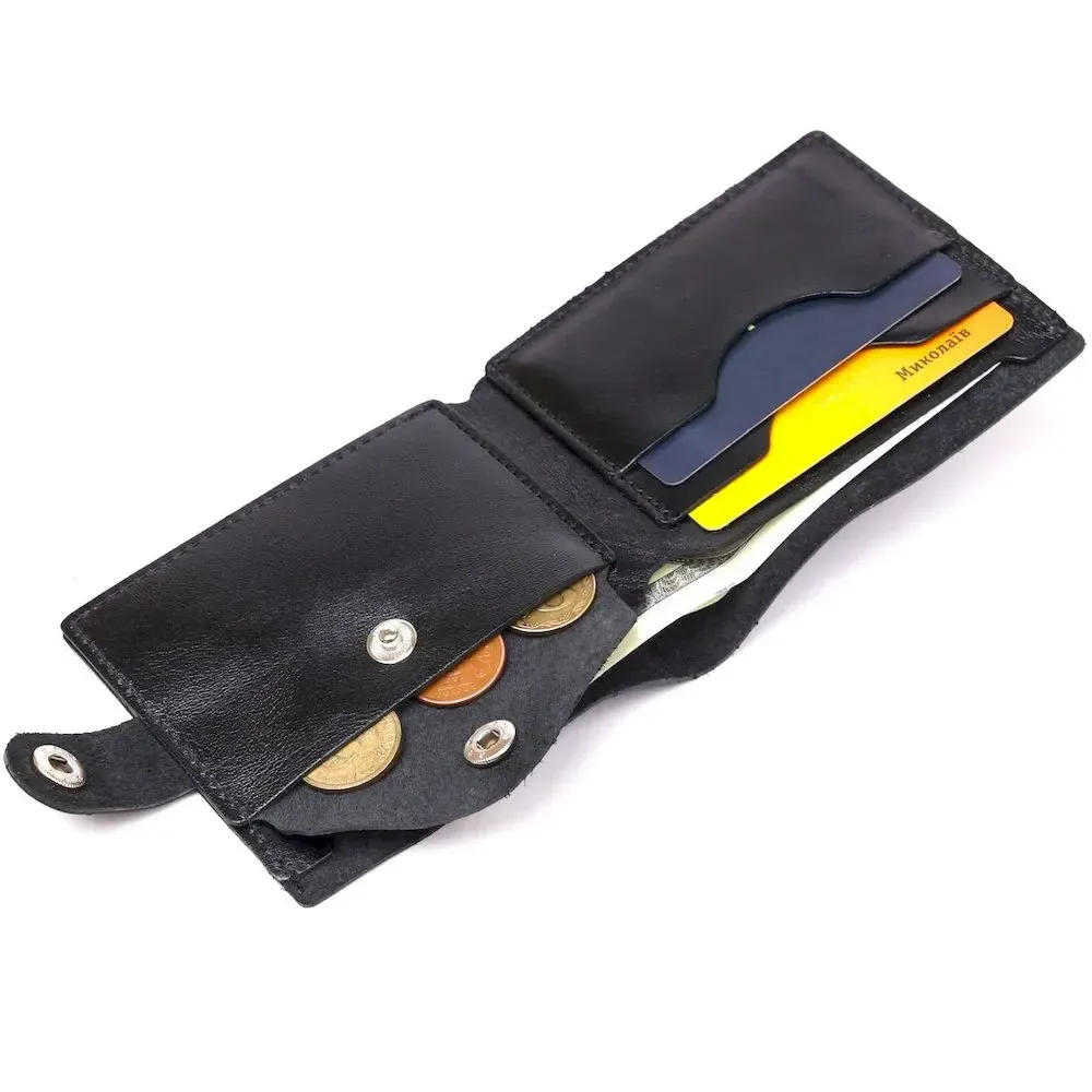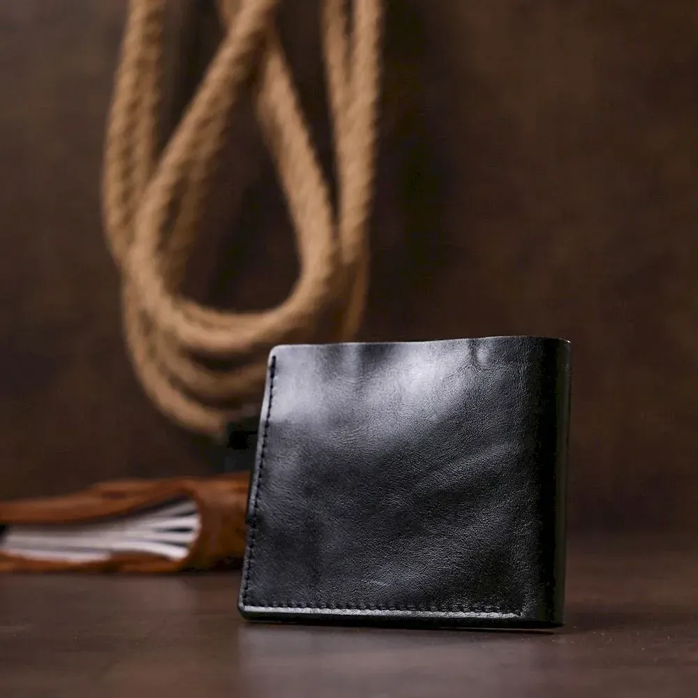 Універсальне чоловіче портмоне в два додавання для шанувальників лаконічних та негроміздких речей. Виконано з натуральної шкіри високої якості та відмінною стійкістю до зношування. Усередині є містке відділення для купюр, слоти для пластикових карток та невелика монетниця на кнопці. Колір виробу – чорний з легким переливом, фактура – гладка.