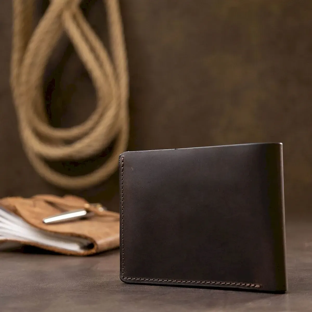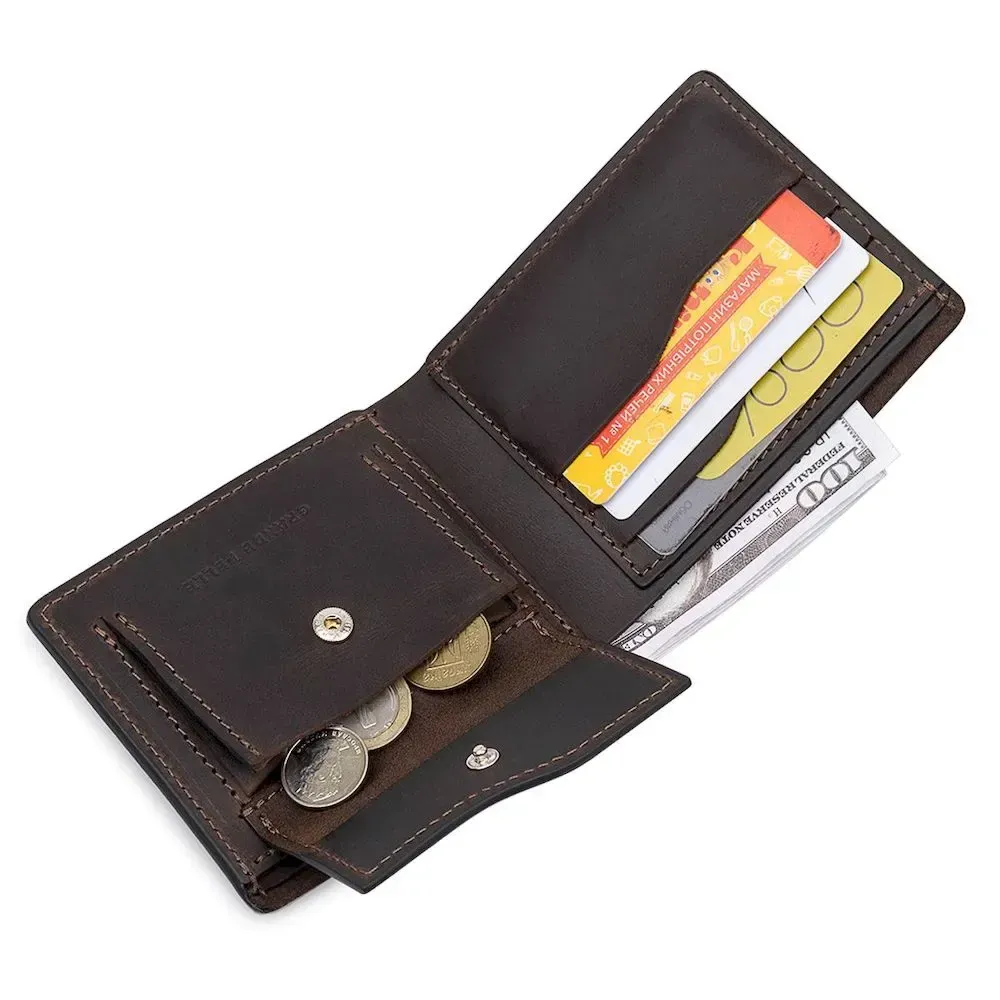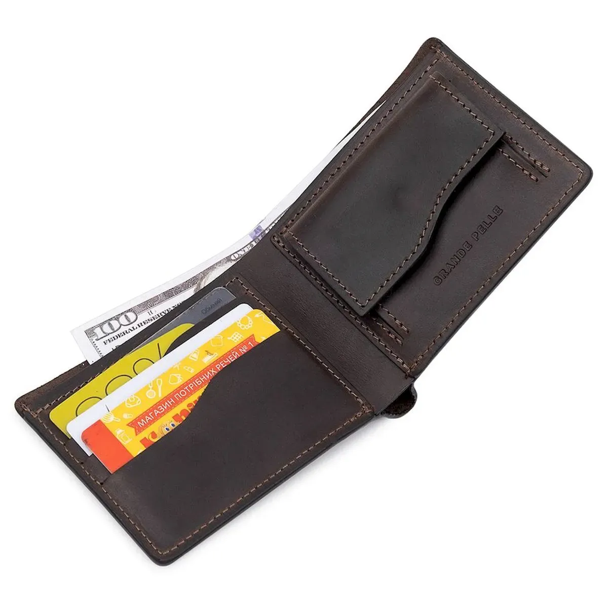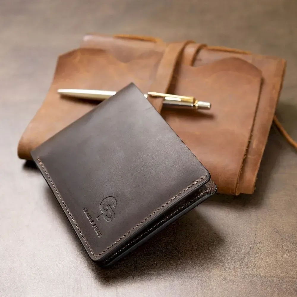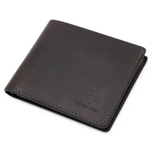Красиве стильне чоловіче портмоне компактних розмірів, тому легко поміститься у сумці чи кишені. Матеріал виготовлення – стійка до зносу натуральна шкіра в матовій гладкій фактурі. Усередині є відділення для купюр, кишені для карток та невелика монетниця на кнопці. Запаковано портмоне у фірмовий щільний чохол.