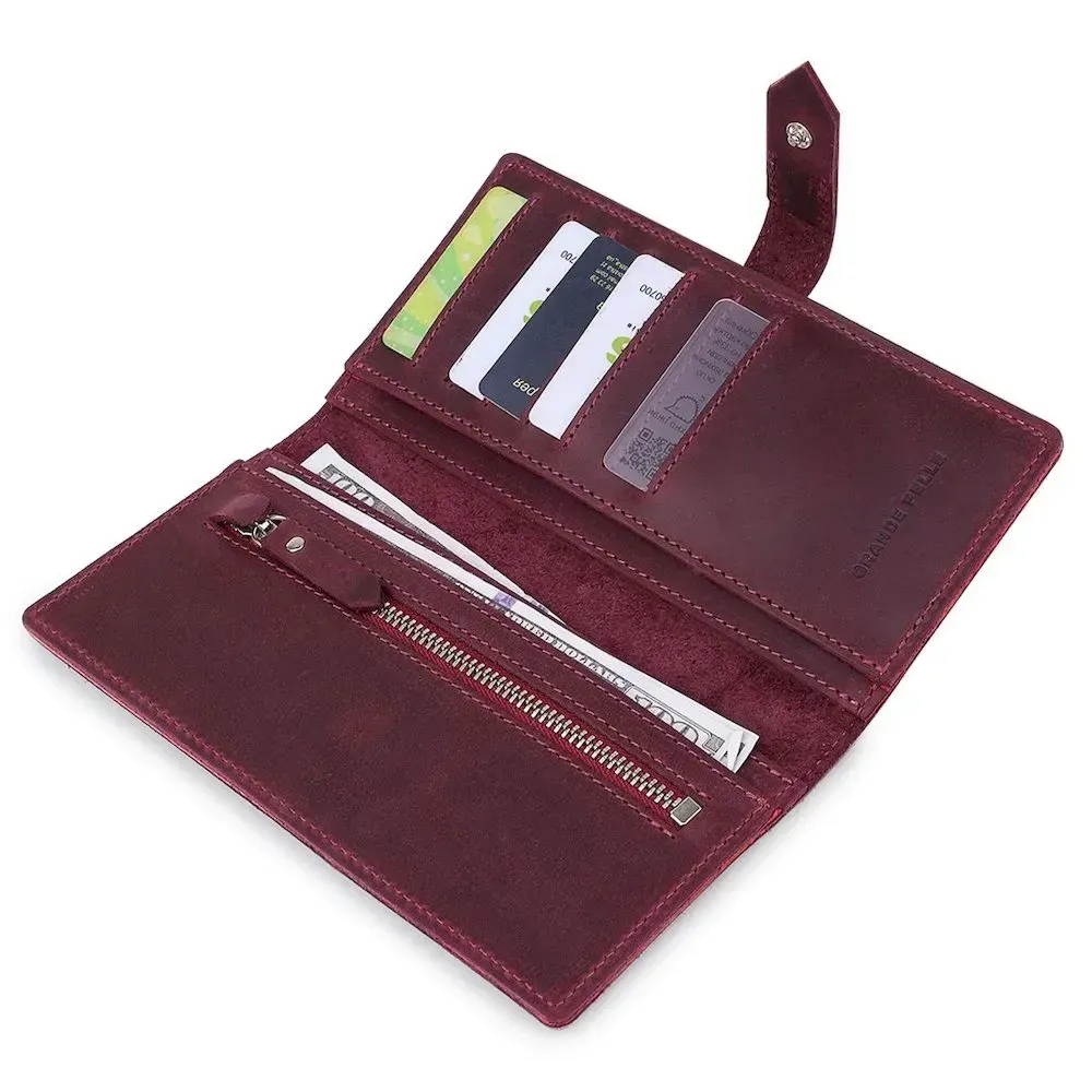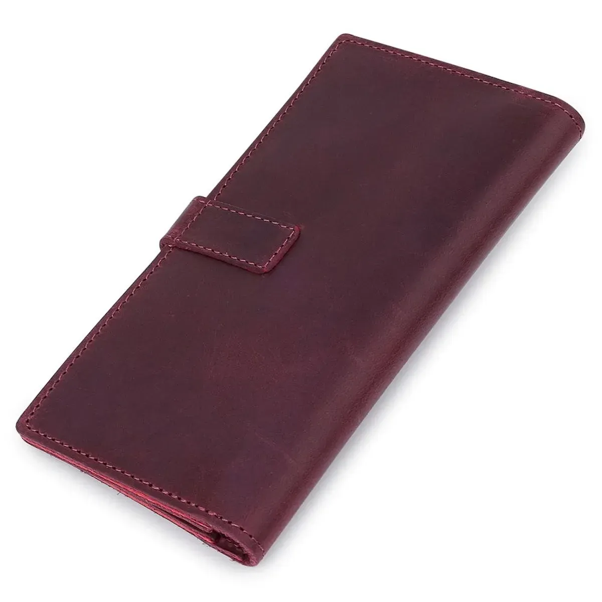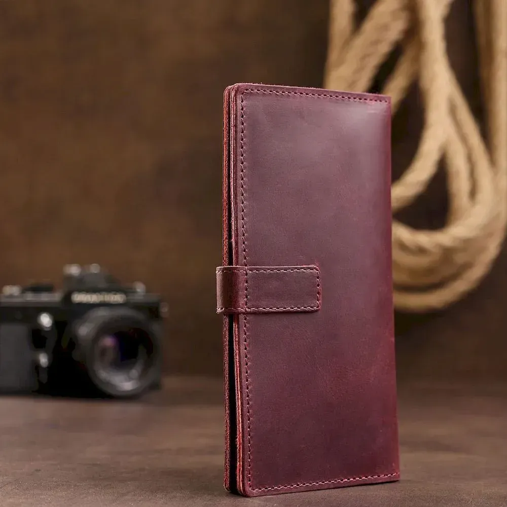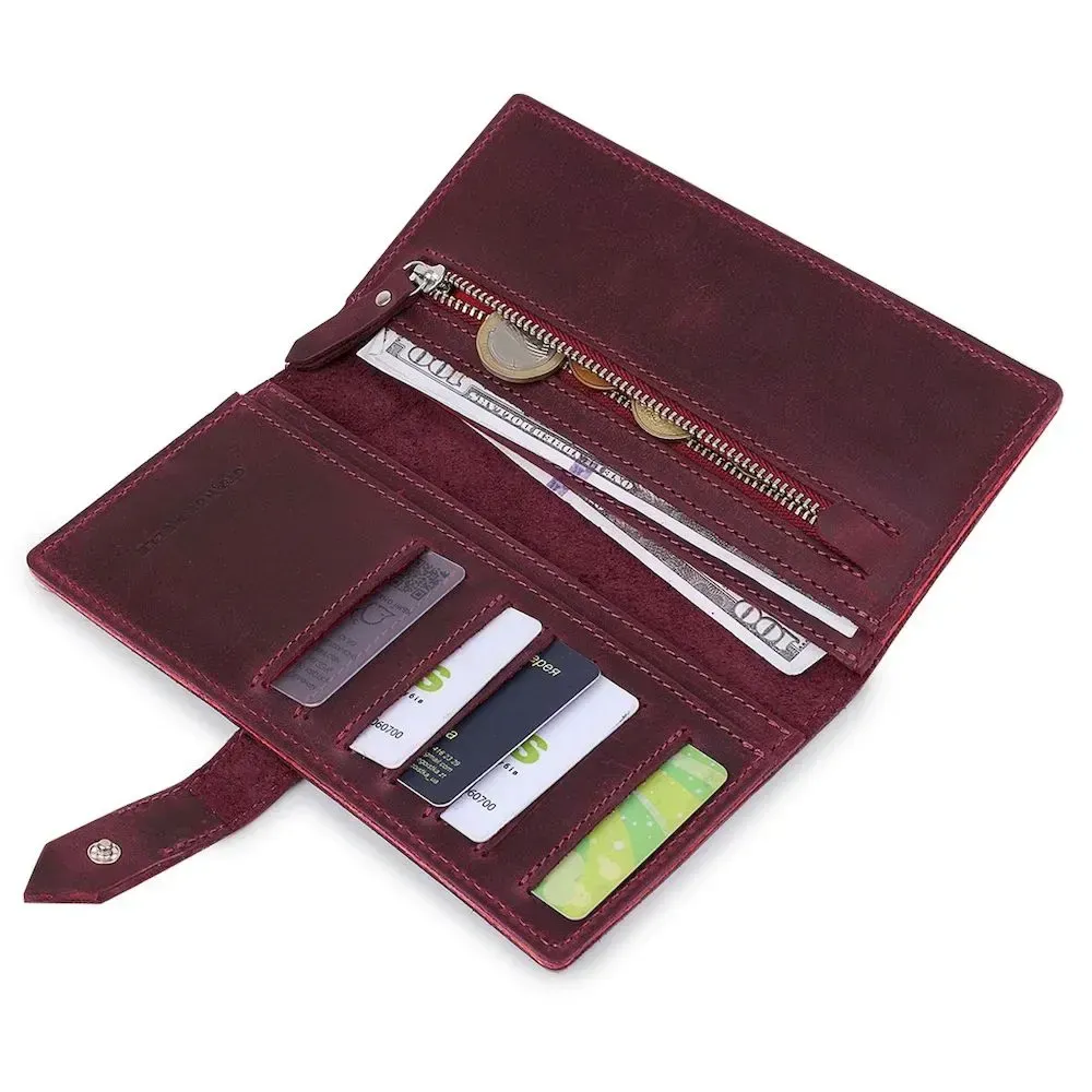 Гарне матове жіноче портмоне у бордовому кольорі з відтінком стиглої вишні. Виготовлено виріб із натуральної шкіри з високими показниками міцності. Закривається аксесуар на зручну практичну кнопку. Усередині розташувалися відділення на всю довжину для купюр, монетниця на блискавці та слоти для кредитних карток або візиток. Запаковано портмоне у фірмову картонну коробку.