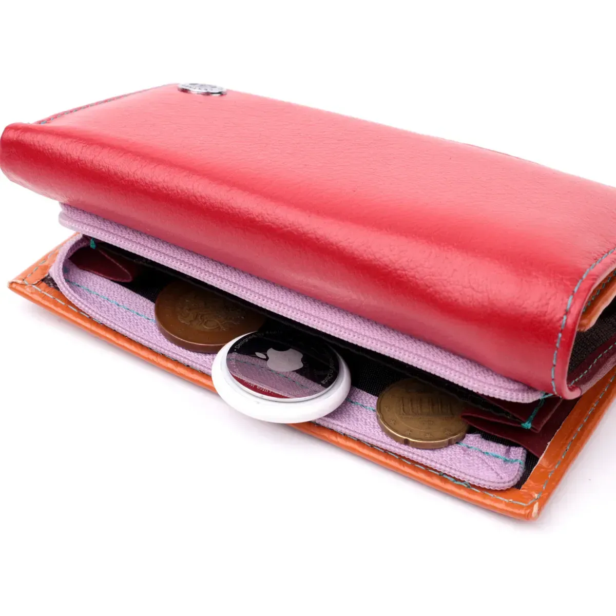 Стильне жіноче портмоне в три складення зручного середнього розміру з натуральної шкіри найвищої якості. Перше, що впадає в око це колірне рішення, замість однотонного аксесуара ми маємо різнокольоровий, який містить два основні зовнішні кольори - червоний і помаранчевий і кілька додаткових усередині. Шкіряне портмоне дуже практичне і служить досить довго. Аксесуар складається з двох містких кишень для купюр, кишені на блискавці через всю довжину, п'яти осередків для карт, прозорого віконця для пропуску та зовнішньої кишені на блискавці з перегородкою, що чудово прослужить для монет. Портмоне доповнено надійною фурнітурою. Укомплектований гаманець у фірмову картонну коробку білого кольору. Виріб стане ідеальним подарунком для дівчини будь-якого віку.