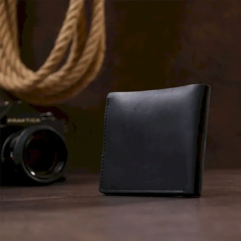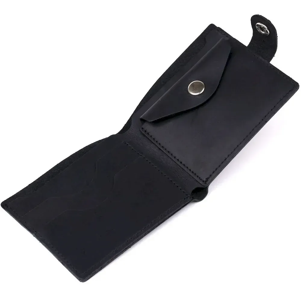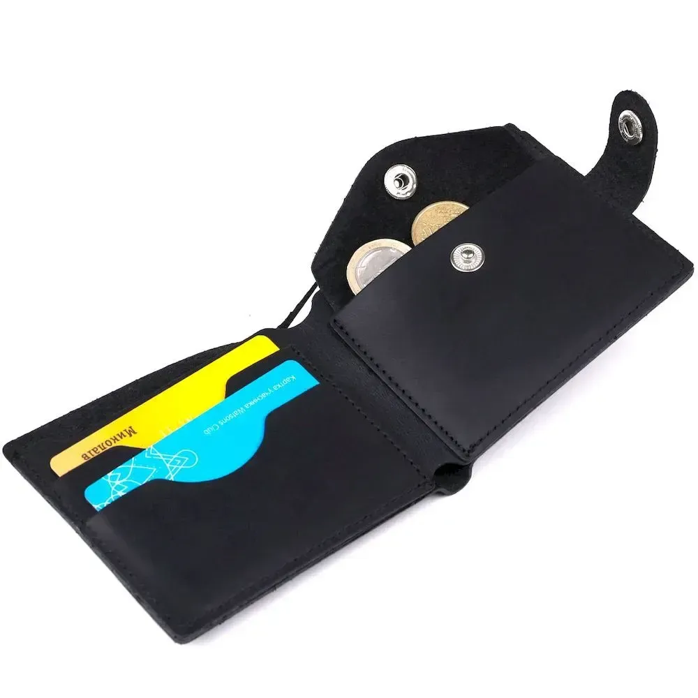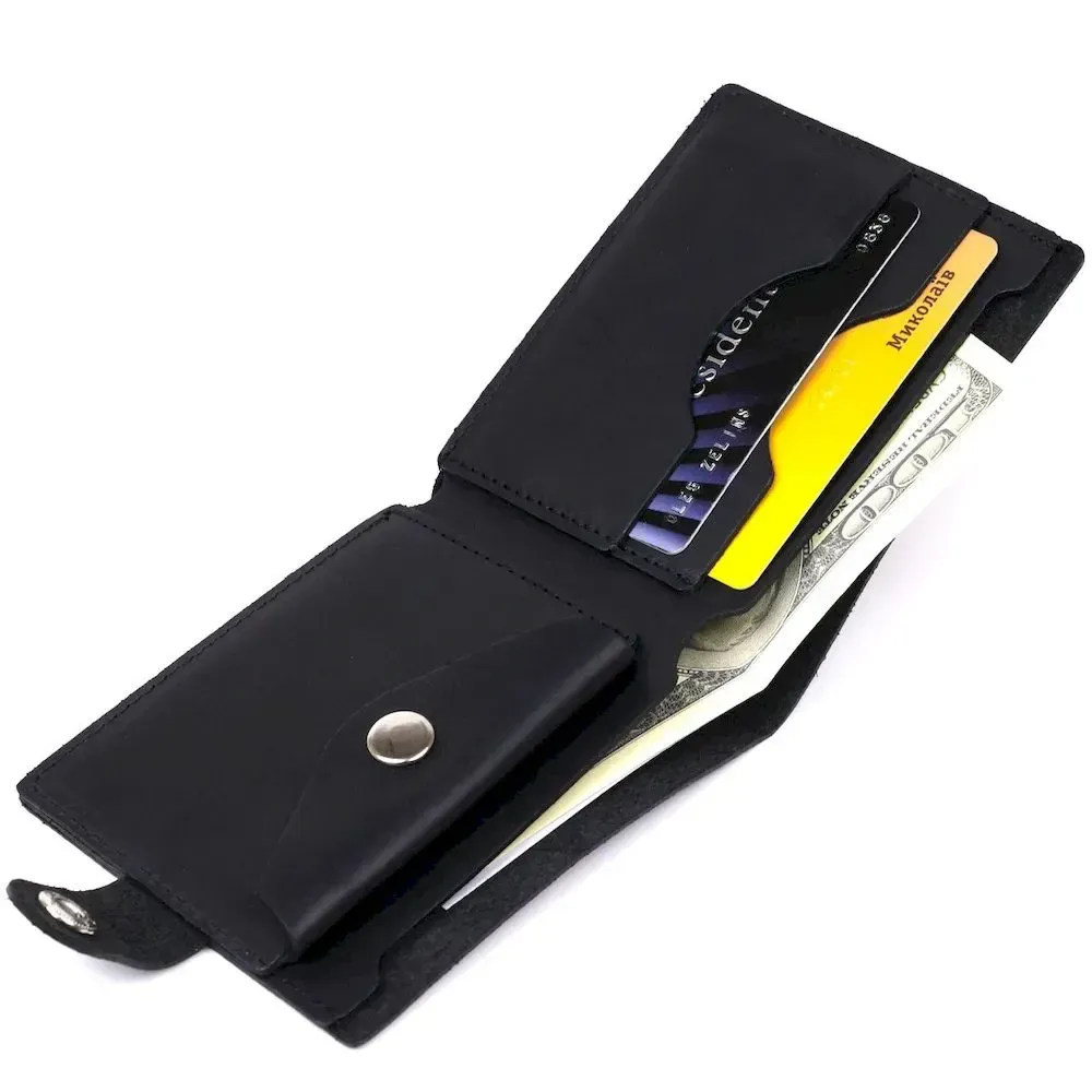 Невеликий чоловічий гаманець із вінтажної шкіри високої якості та відмінними характеристиками. Має містке основне відділення для купюр, слоти для кредитних та візитних карток та монетницю на блискавці. Такий гаманець легко поміститься у сумку будь-якого розміру чи кишеню. Закривається виріб на хлястик з кнопкою, що дуже зручно та практично.