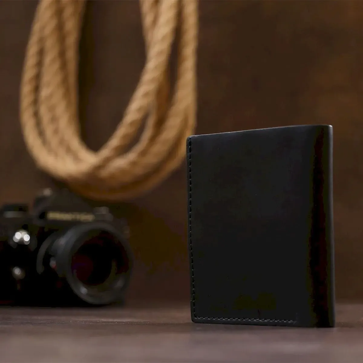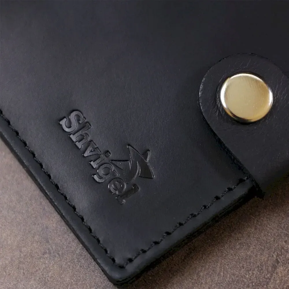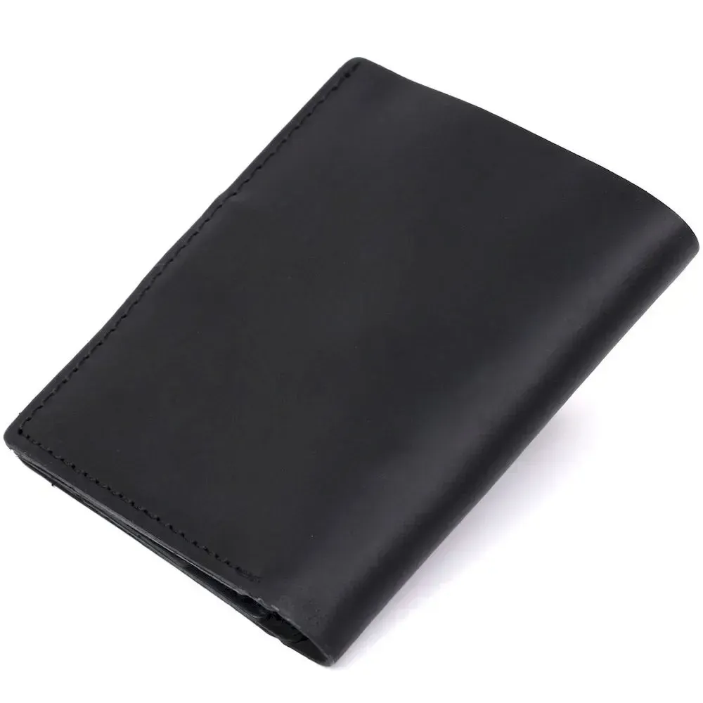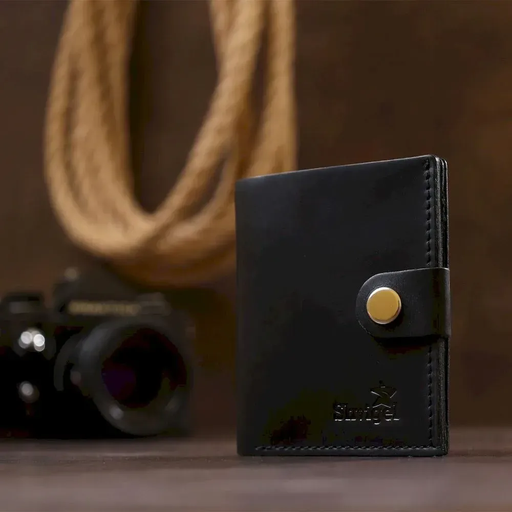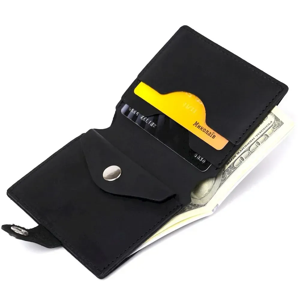 Компактний чоловічий гаманець із натуральної шкіри високої якості від українського виробника. Має універсальний чорний колір та матову гладку фактуру, яка дуже приємна на дотик. Внутрішнє наповнення представлене у вигляді відділення для купюр, кредитних карток та монетниці на кнопці.