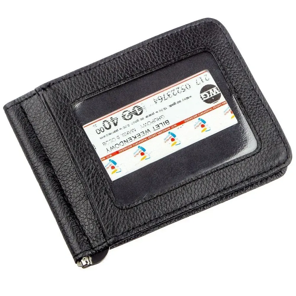 Невеликий аскетичний чоловічий затискач у строгому дизайні. Виконаний із натуральної якісної шкіри з відмінними експлуатаційними показниками. Має найпрактичніший та універсальний чорний колір. Підійде тим чоловікам, які цінують мінімалізм у всьому, а громіздкі та великі гаманці їм незручні. Такий аксесуар можна легко покласти в будь-яку чоловічу сумку або просто в кишеню, з ним Вам буде завжди комфортно. Окрім купюр у затиску також є кишені для пластикових чи паперових карток. Упаковка затискача представлена у вигляді щільної картонної коробки білого кольору з логотипом виробника.