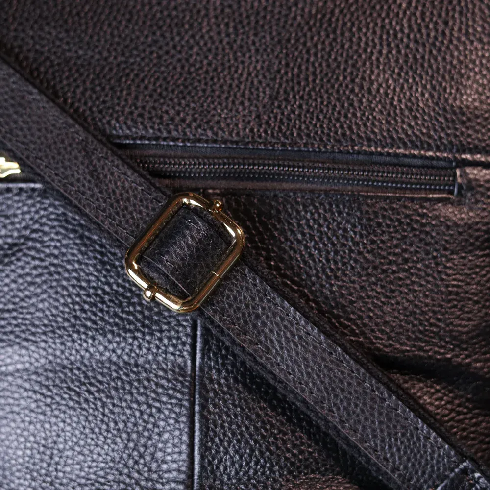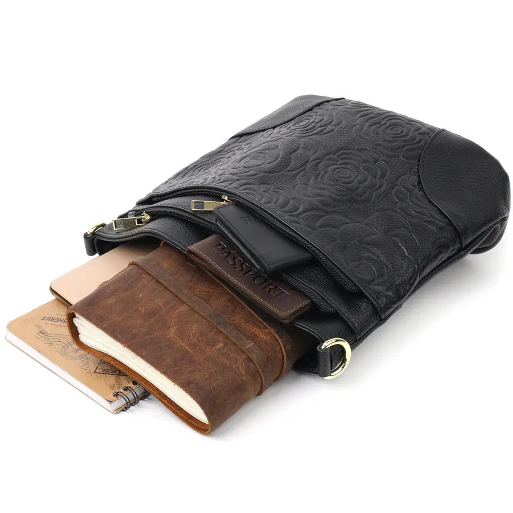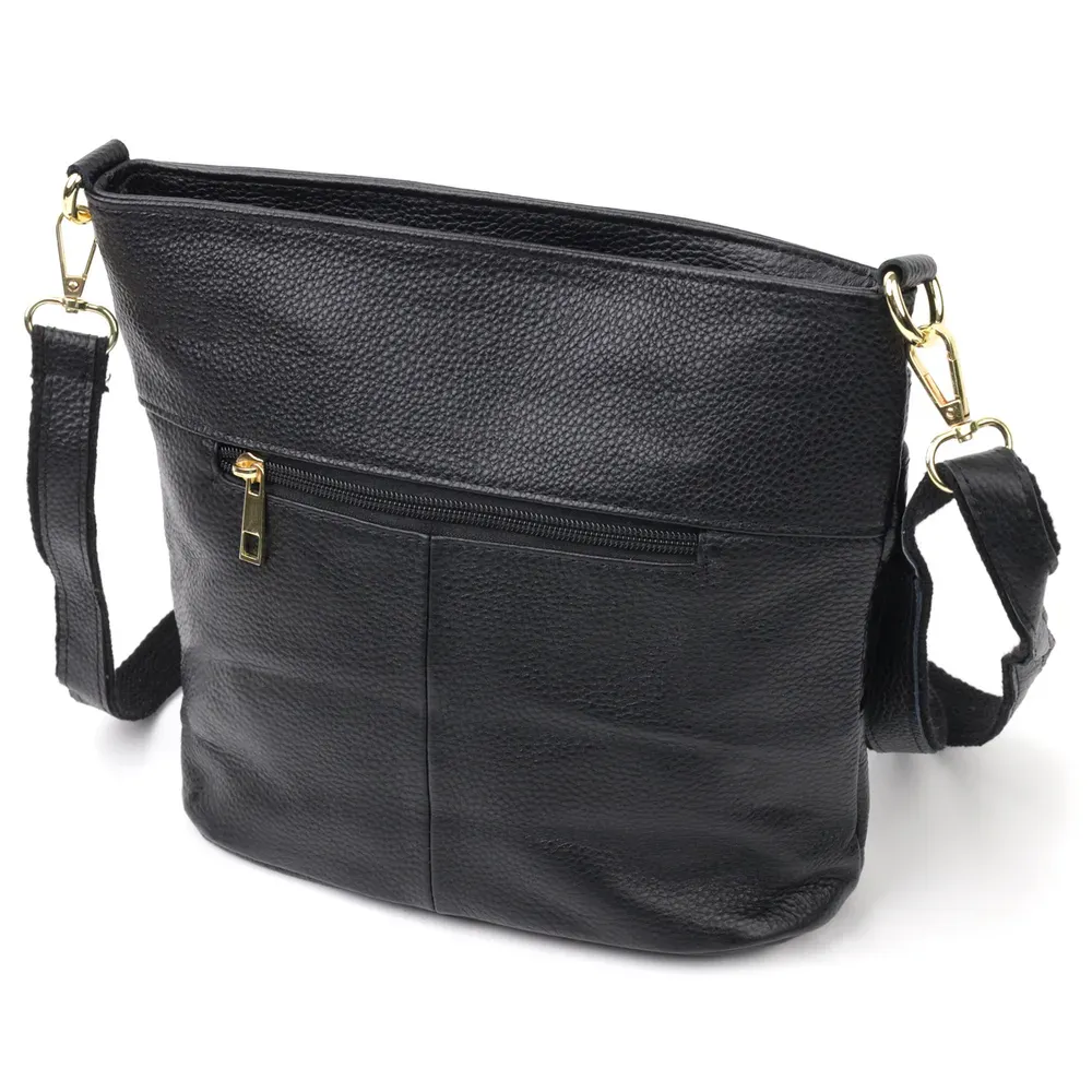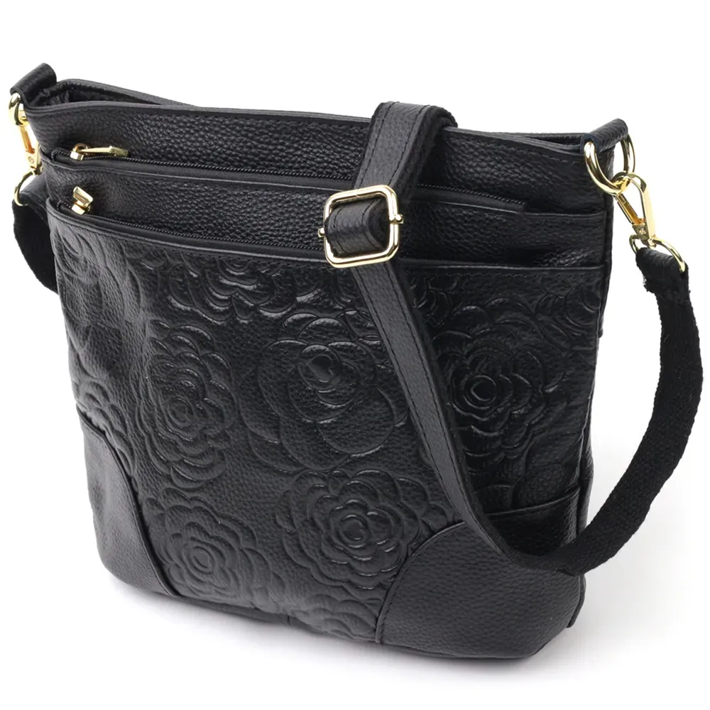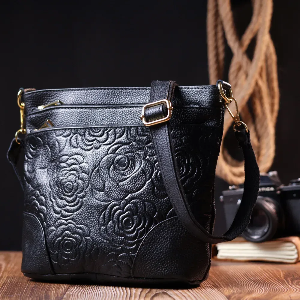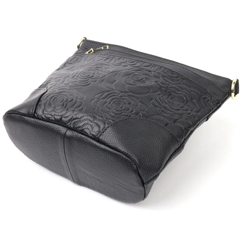 Стильна сумка жіноча середнього розміру з натуральної високоміцної шкіри з квітковим тисненням. Має класичний чорний колір та зернисту фактуру. Фурнітура виконана у кольорі під золото. Модель довгий час залишається у ідеальному стані, таку сумку приємно носити. Може бути чудовим варіантом для подарунка близькій людині.