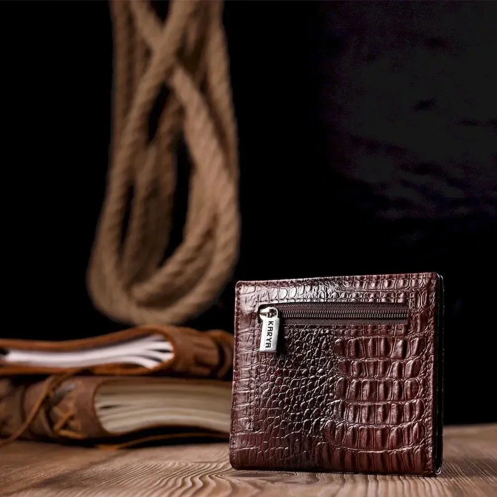 Стильний картхолдер з лакованої шкіри, з тисненням під крокодила, в гарному коричневому кольорі. При закритті розворот фіксується на магніт всередині. На лицьовій стороні у вигляді декору розташований металевий логотип виробника. Аксесуар упакований у фірмову коробочку. Вироби з натуральної шкіри завжди будуть чудовим подарунком для близької людини.