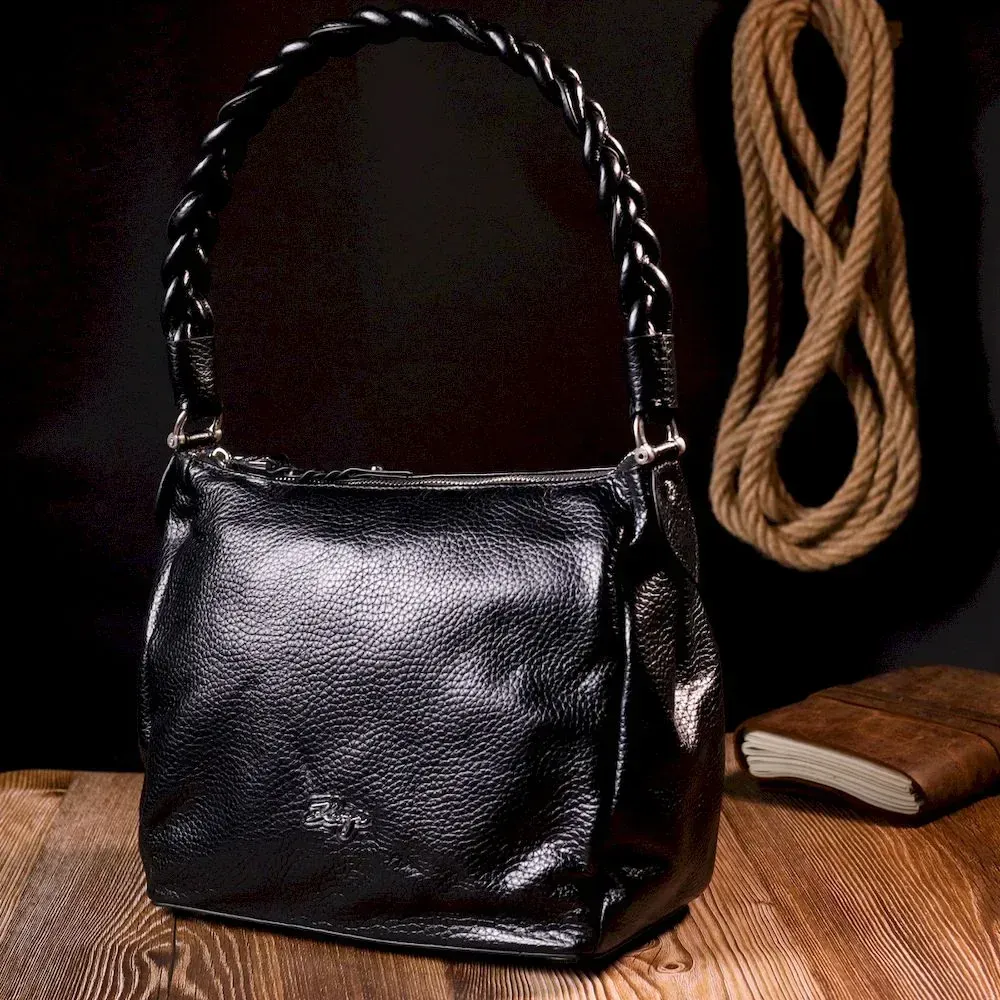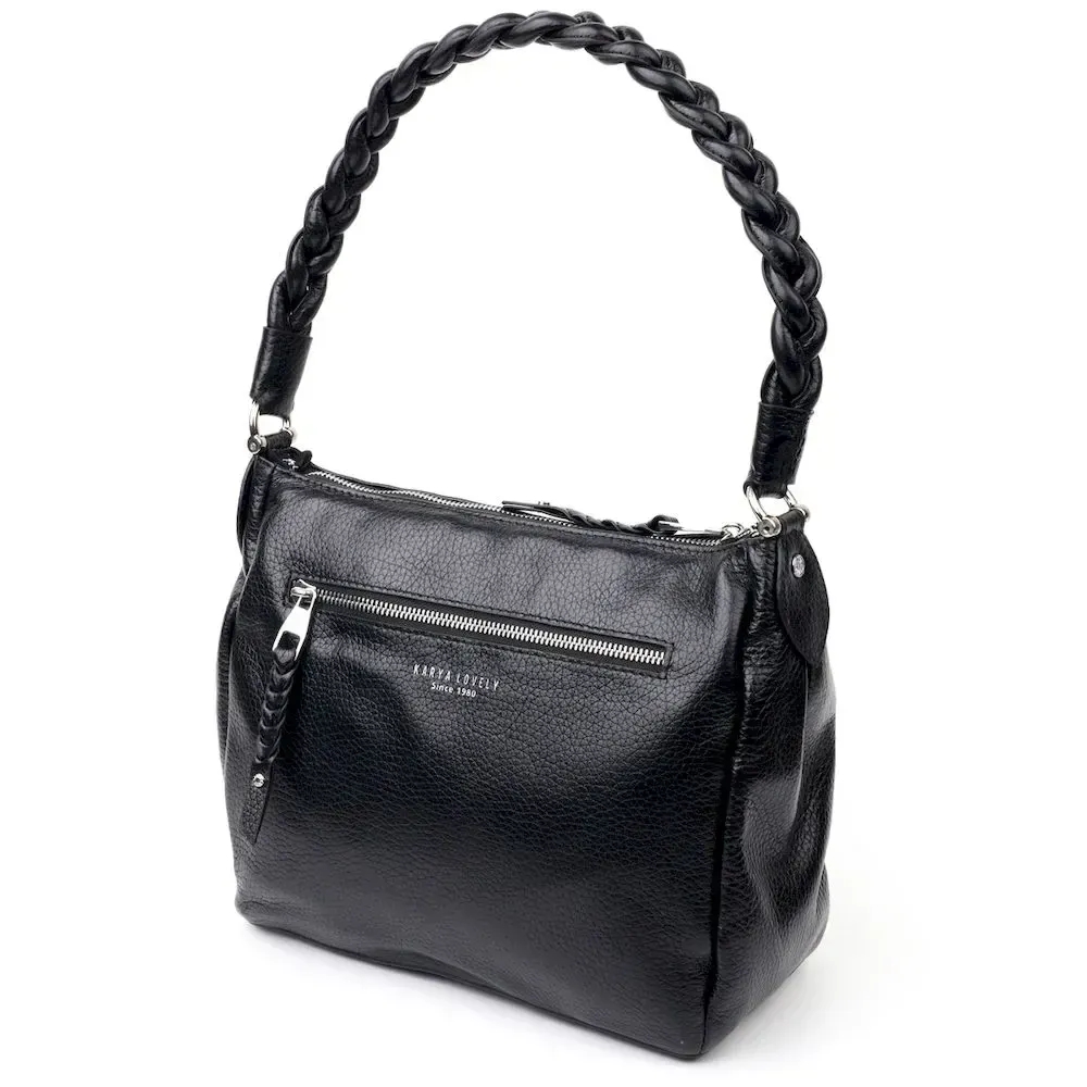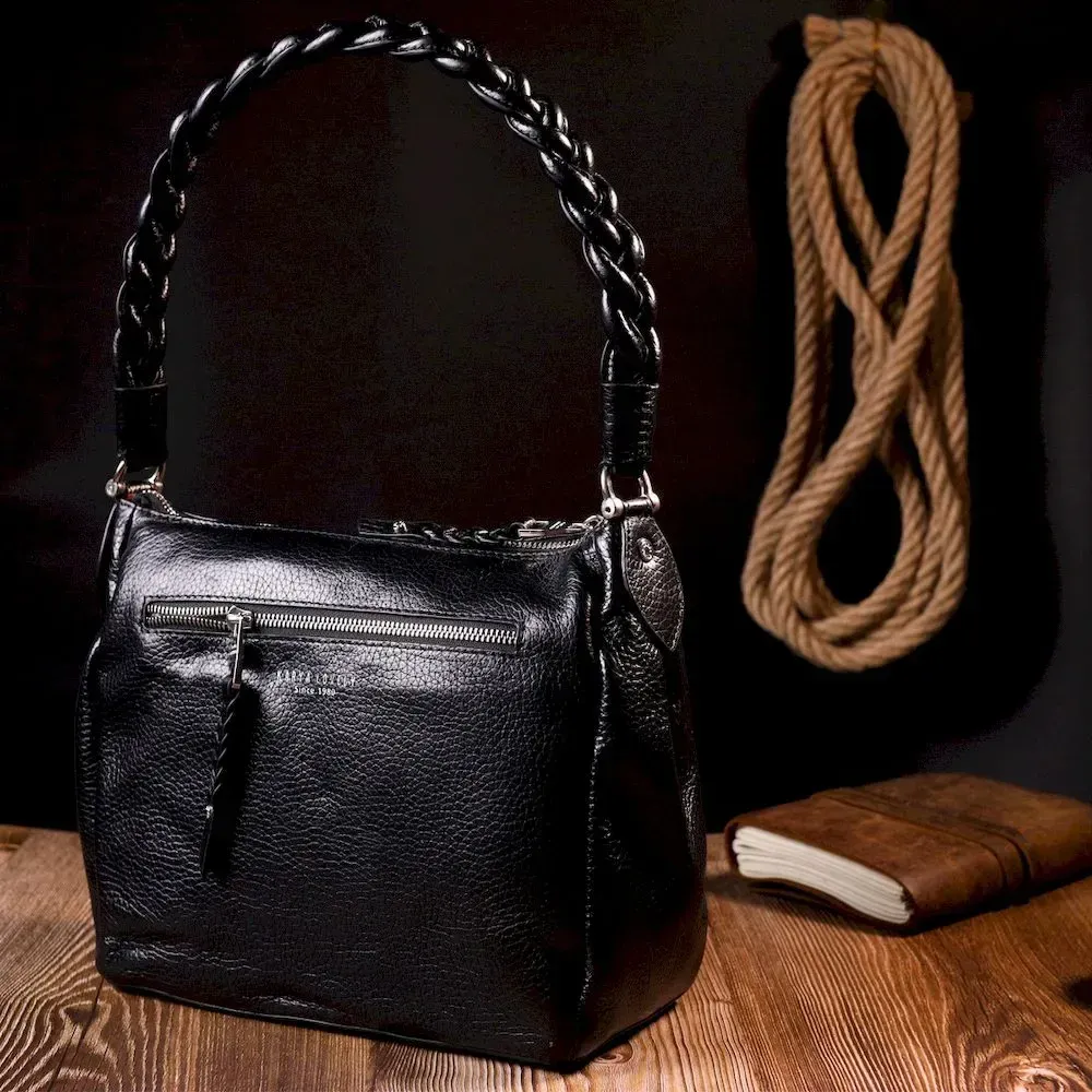 Приваблива сумка жіноча з дрібнозернистої натуральної шкіри, в класичному чорному кольорі. Сумка функціональна та зручна в експлуатації, якісна фурнітура не тільки доповнює стильний дизайн сумки, але й захищає виріб. Виріб має міцну підкладку. Аксесуар упакований у фірмовий текстильний мішок Karya. Сумка з натуральної шкіри завжди буде чудовим подарунком будь-якій жінці.