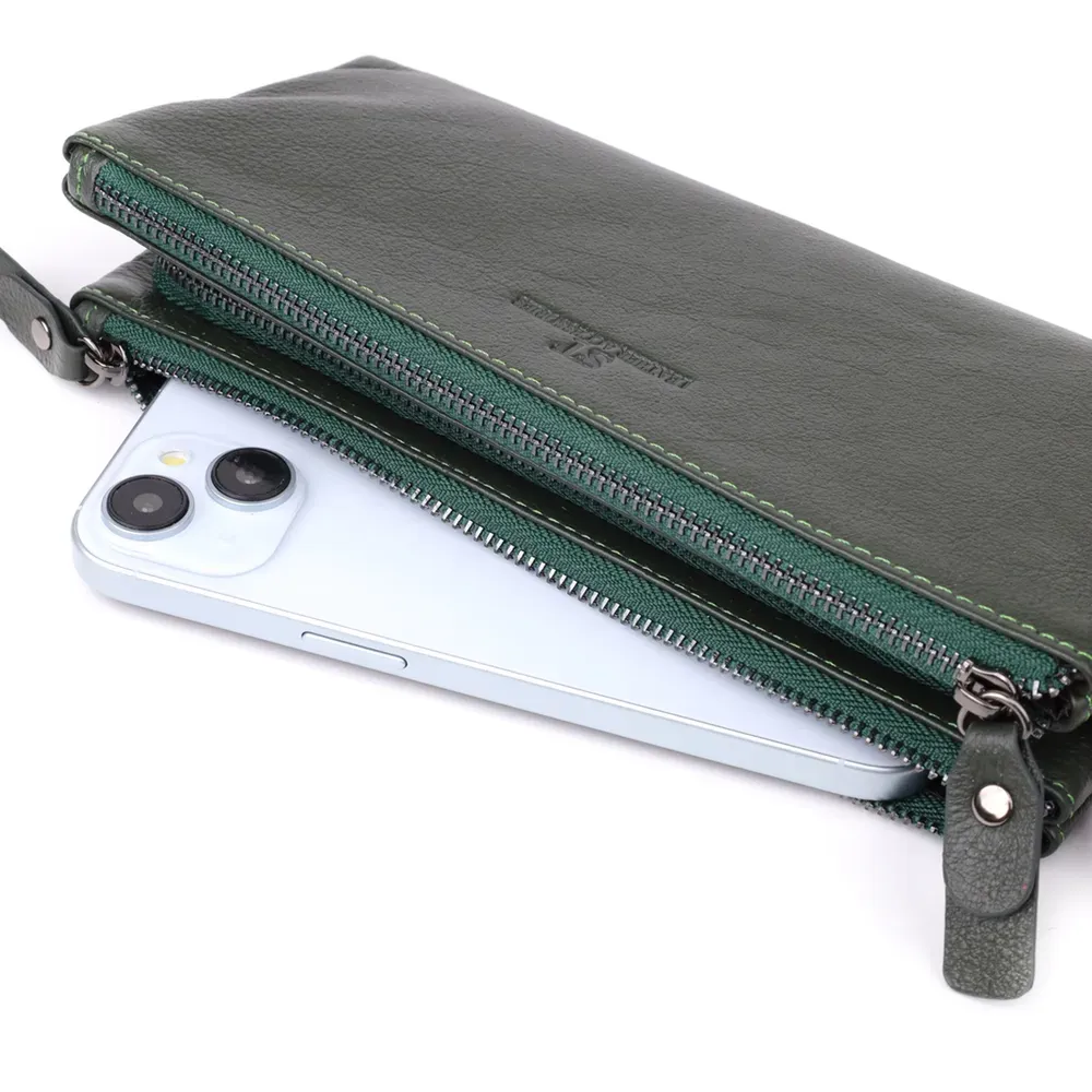 Зручний гаманець-клатч, який відрізняється своєю місткістю. У цю модель легко поміститься ваш смартфон. Таким чином, модель здатна замінити вечірню сумочку. Носити клатч можна за допомогою шкіряного ремінця на зап'ястя. Дві місткі кишені допоможуть зручно розкласти вам гроші, також клатч має достатньо слотів для кредиток. Перевагою даного кольору є те, що він не прив'язує вас до певної палітри кольорів в гардеробі. Він підходить під усе. Сам клатч м'який і приємний на дотик. На лицьовій стороні по центру - тиснений логотип виробника, що є знаком якості та оригінальності виробу. Усередині клатч зроблений з натуральної шкіри та щільного текстилю. У комплекті йде фірмова коробка із логотипом бренду. Шкіряний клатч стане найкращим подарунком для близької людини.