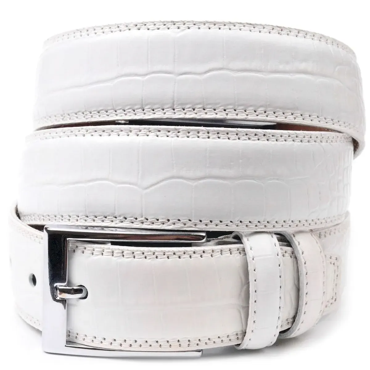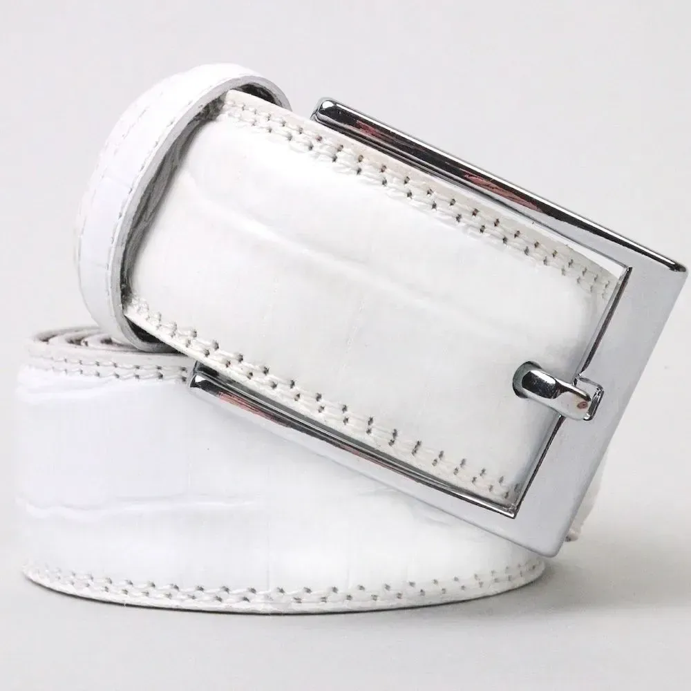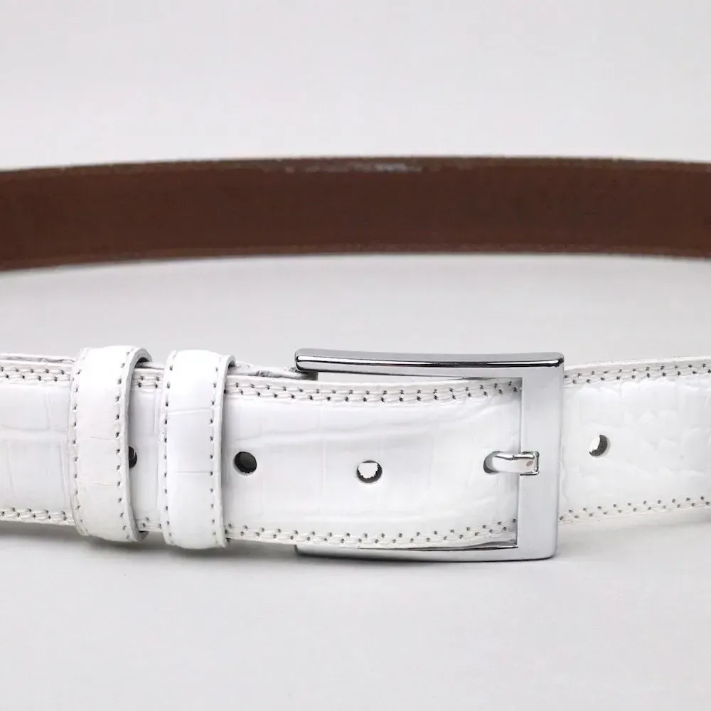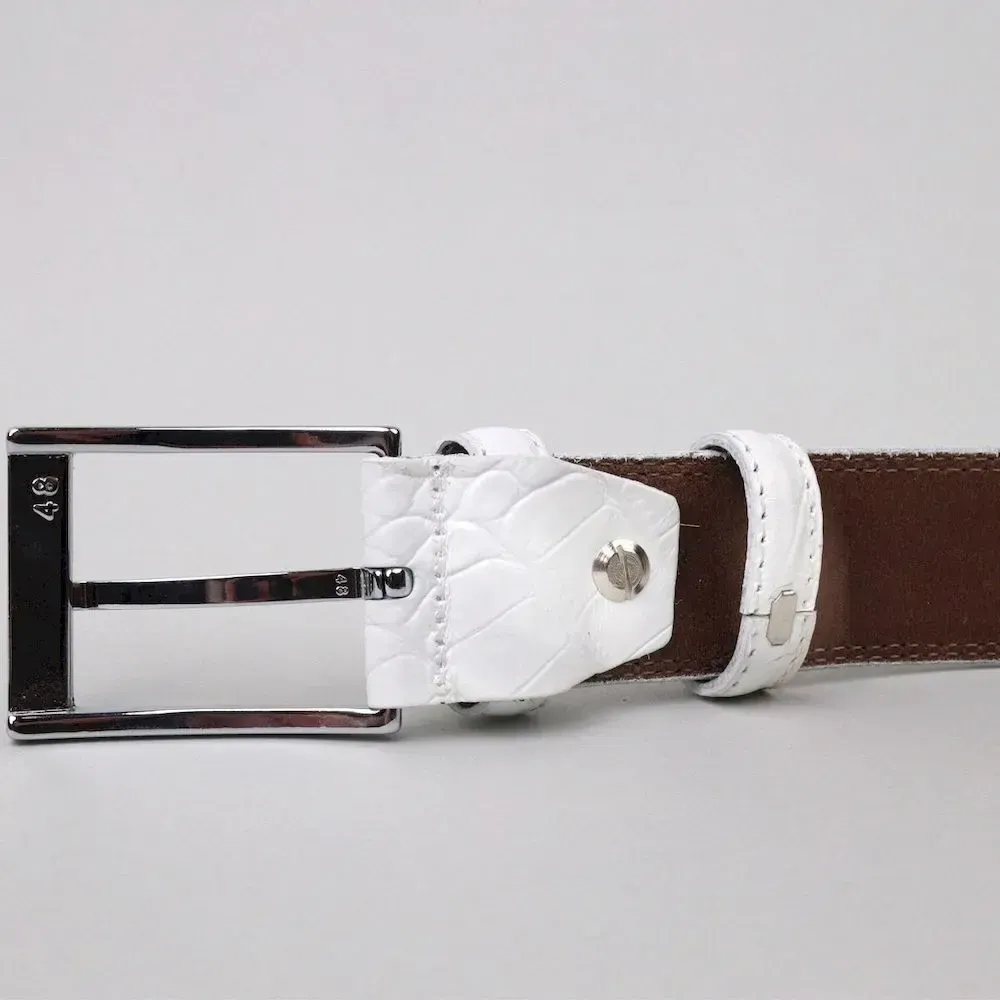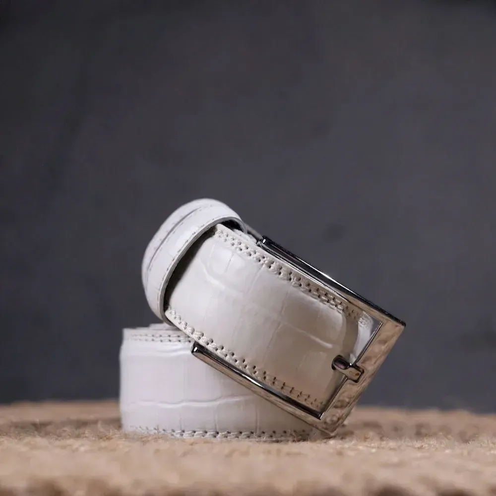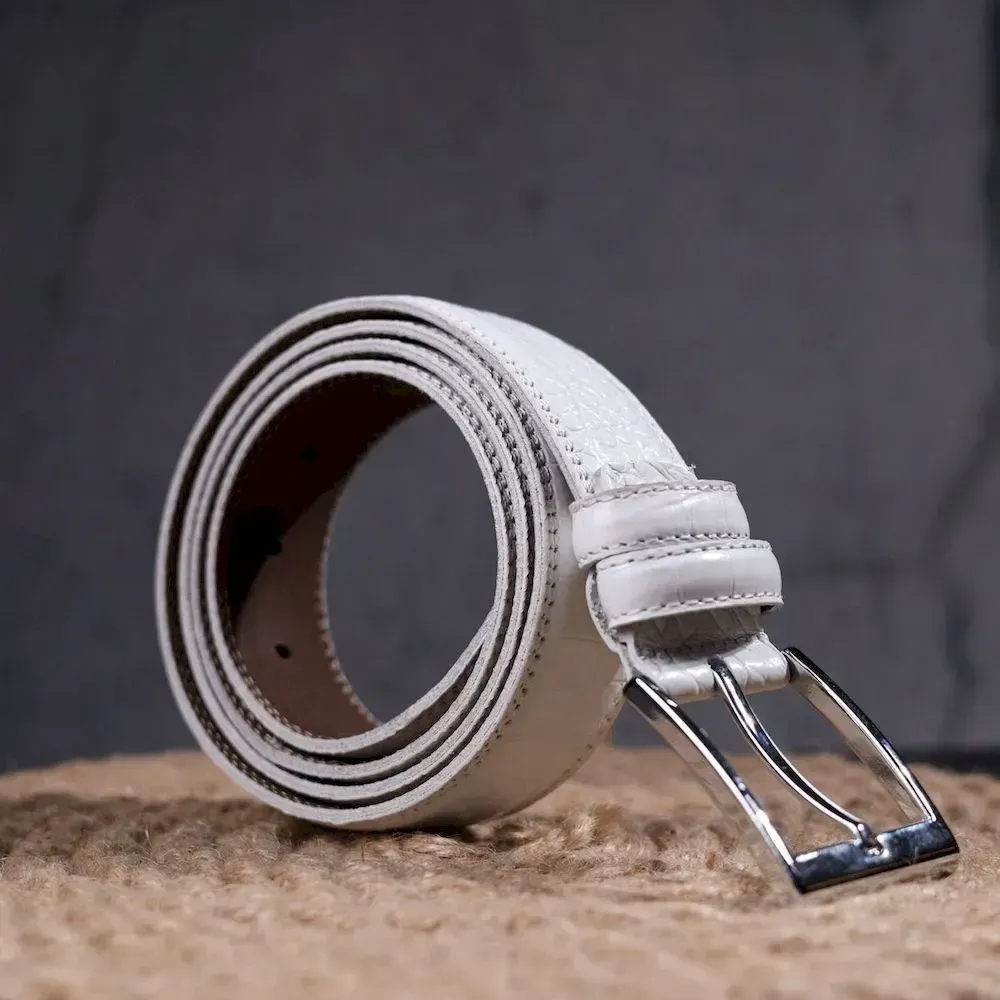 Чудовий чоловічий ремінь середньої довжини для чоловіків. Має гарний білий колір, фактуру під крокодила та класичну пряжку з простим та надійним механізмом. Виконано виріб із натуральної висококласної шкіри. Такий ремінь можна сміливо подавати як чудовий подарунок.