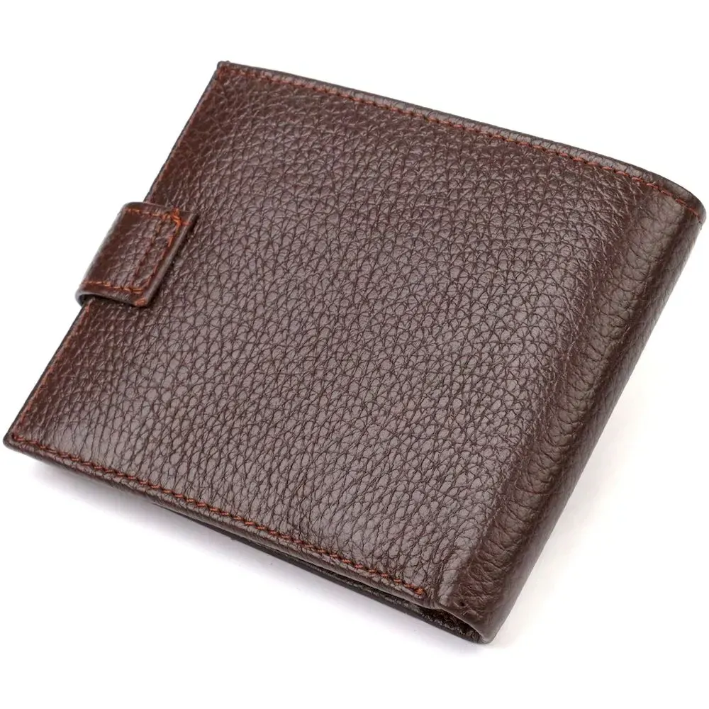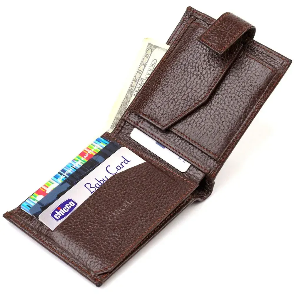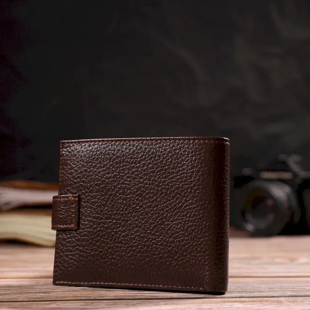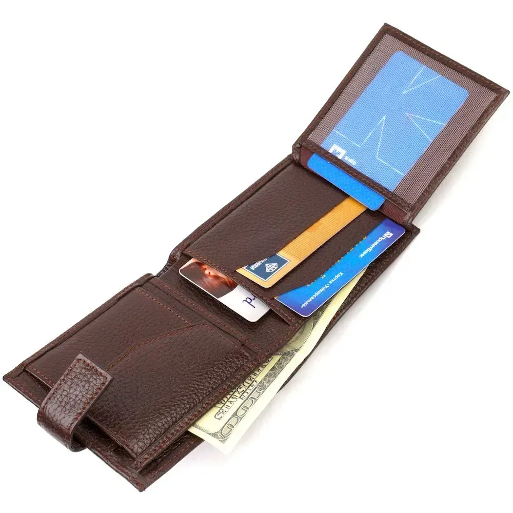 Стильний чоловічий гаманець компактного розміру з натуральної шкіри. Аксесуар має основне відділення для купюр з перегородкою, шість осередків для карток, одна кишеня під сіточкою, дві прилеглі кишені та монетницю. Гаманець складається навпіл, закривається хлястиком на кнопку. На лицьовій стороні в правому нижньому кутку розташований металевий логотип компанії виробника. Купуючи шкіряний гаманець у нашому магазині, Ви отримуєте модний, стильний аксесуар, який прослужить не один рік.