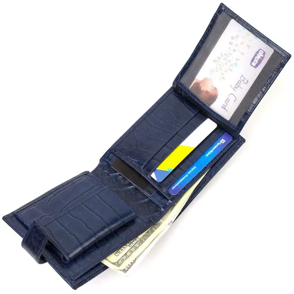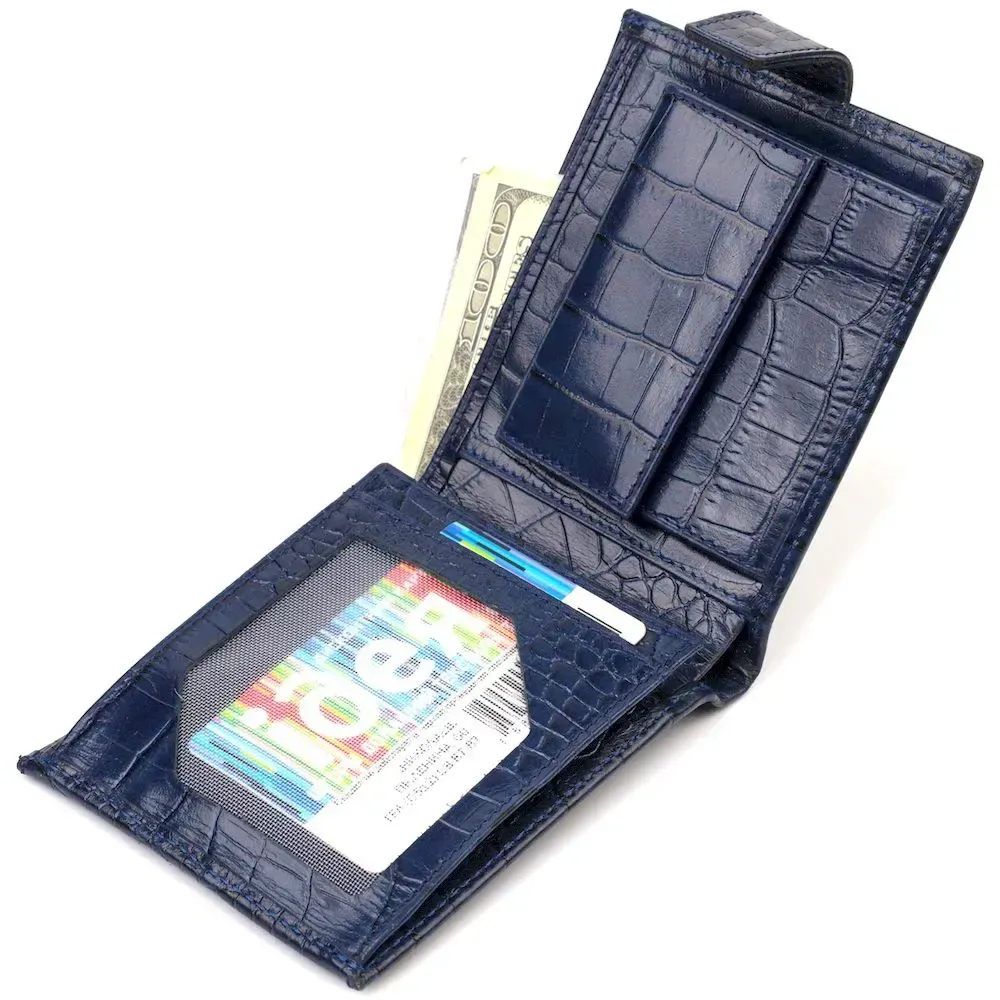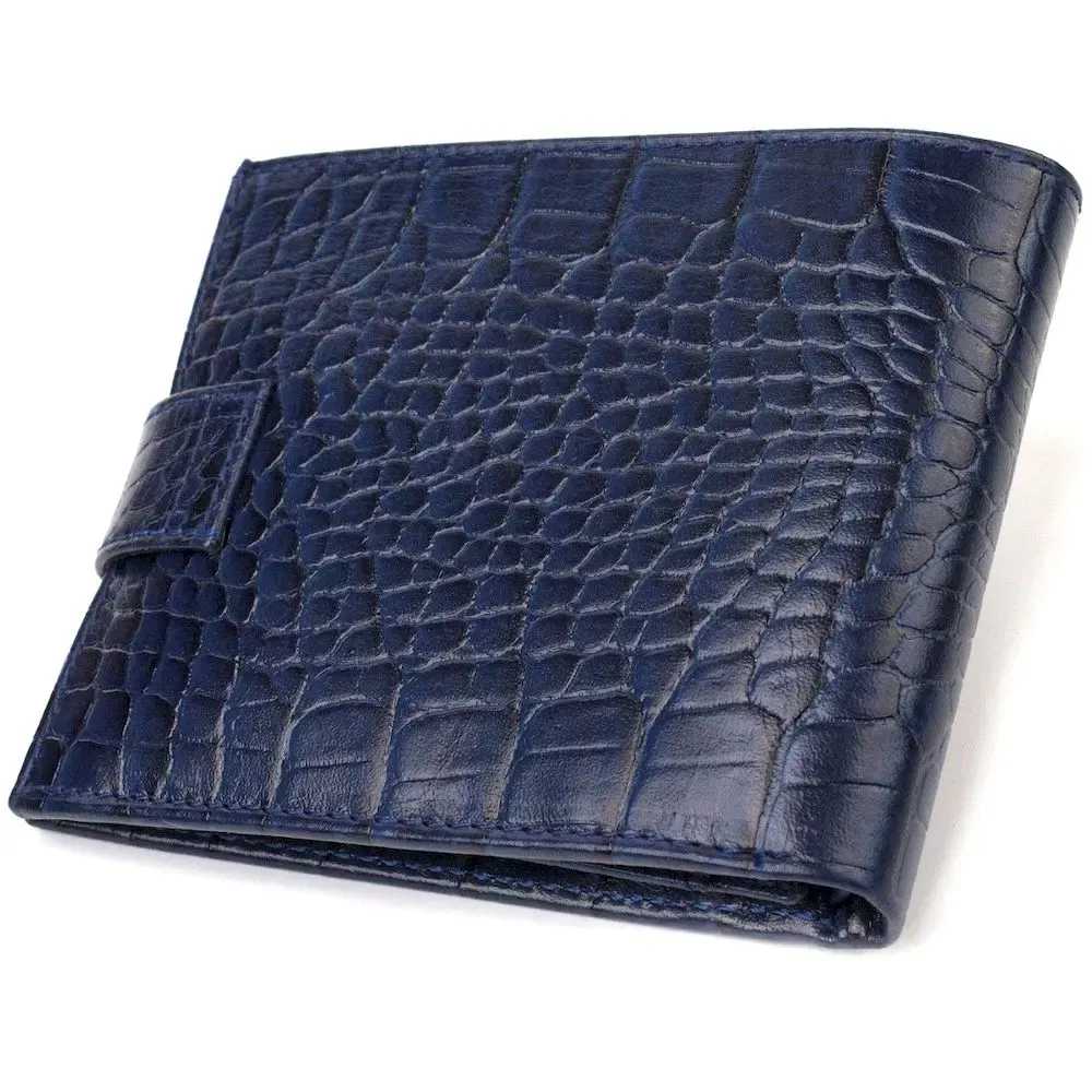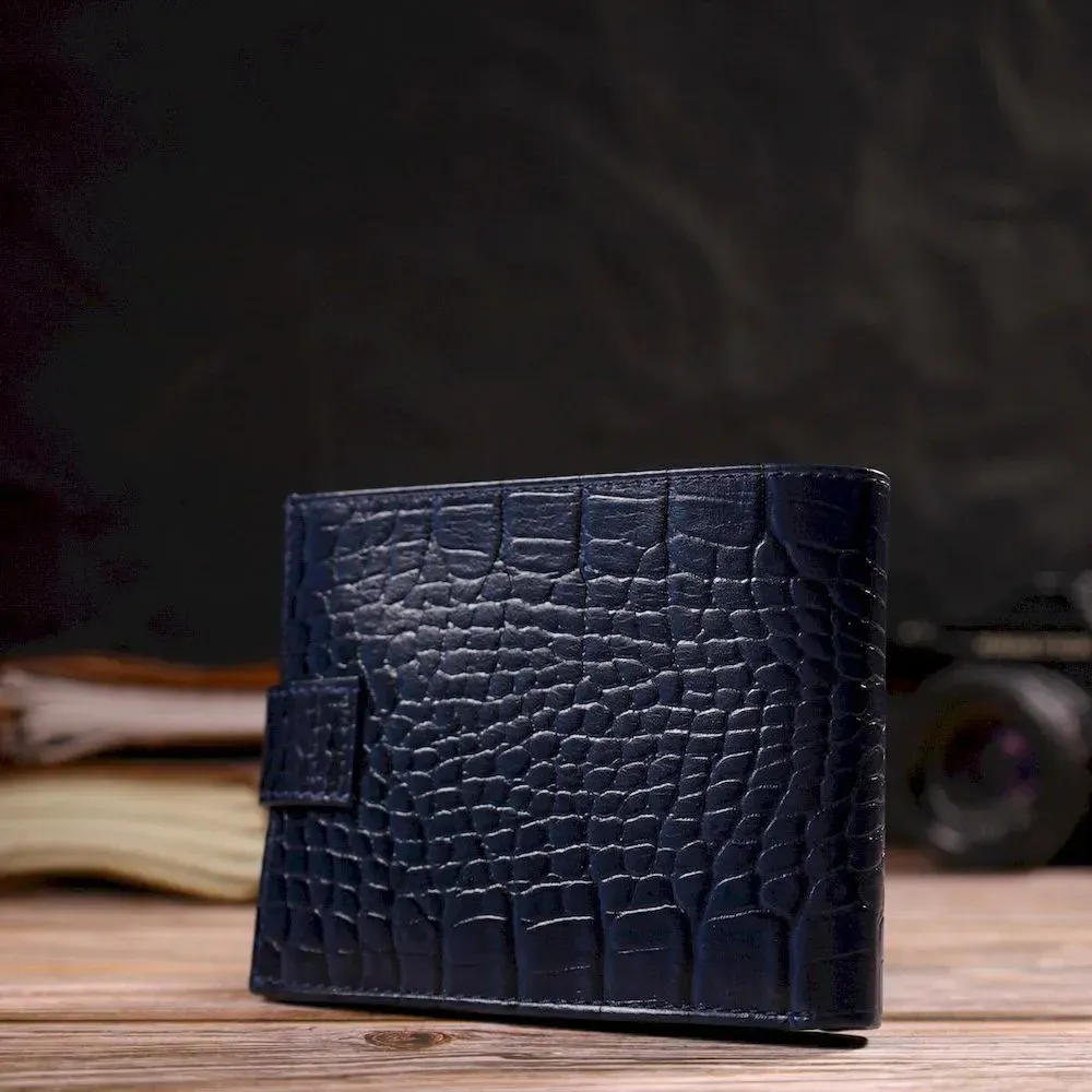 Оригінальний чоловічий гаманець середнього розміру з натуральної фактурної шкіри з тиснення під крокодила. Аксесуар має основне відділення для купюр з перегородкою, чотири осередки для карток, дві кишені під сіточкою, три прилеглі кишені та монетницю. Гаманець складається навпіл, закривається хлястиком на кнопку. На лицьовій стороні в правому нижньому кутку розташований металевий логотип компанії виробника. Купуючи шкіряний гаманець у нашому магазині, Ви отримуєте модний, стильний аксесуар, який прослужить не один рік.