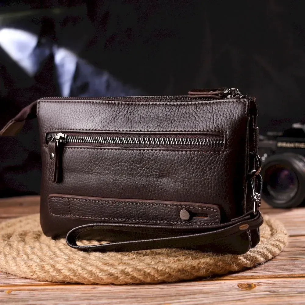 Клатч для чоловіків з натуральної якісної шкіри. Аксесуар має одне основне відділення, всередині якого дві кишені на блискавках і два осередки для кредитних карток. Зовні у виробі розташовані дві кишені на лицьовій та тильній стороні, що закриваються на блискавку. Внизу аксесуара є ремінець для носіння на руці, що дуже зручно у використанні, також є кистьовий ремінь, що знімається. Чим зручний клатч - у нього Ви можете покласти все необхідне і все буде під рукою.
