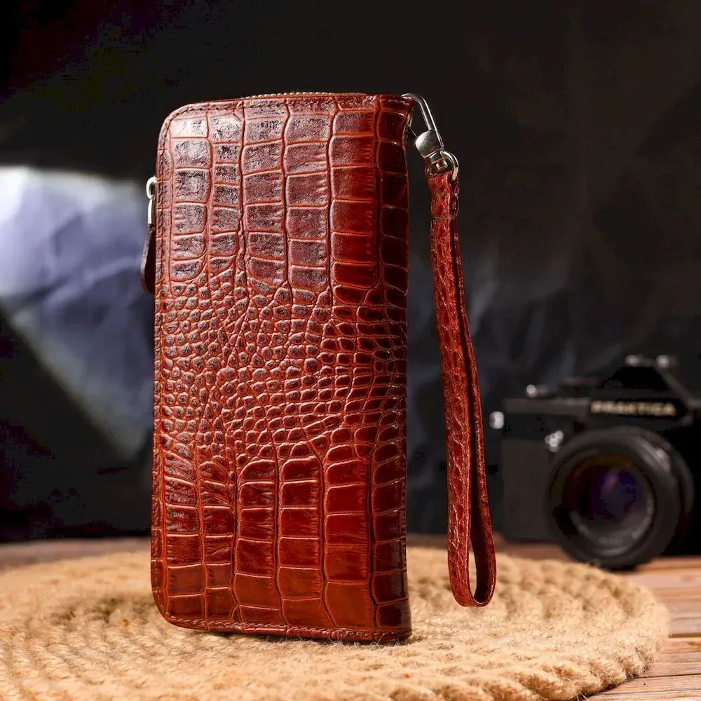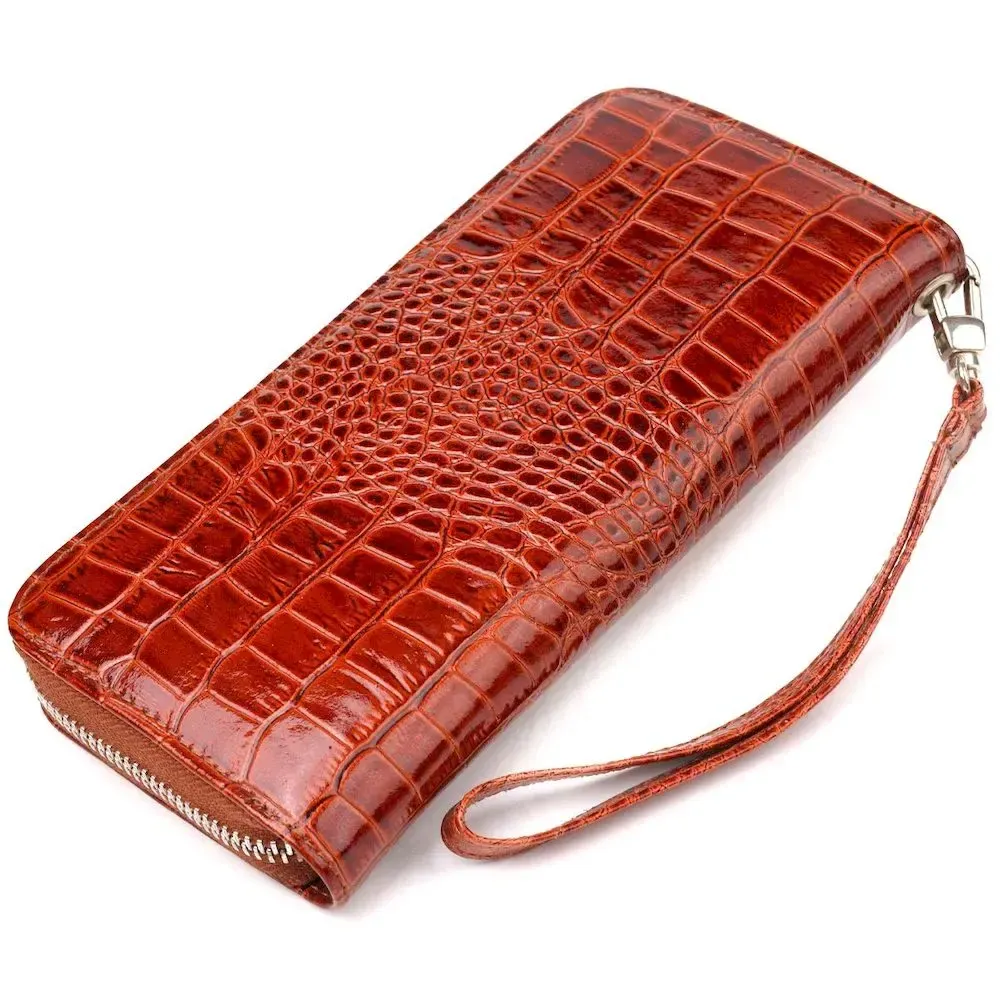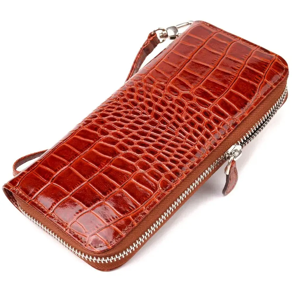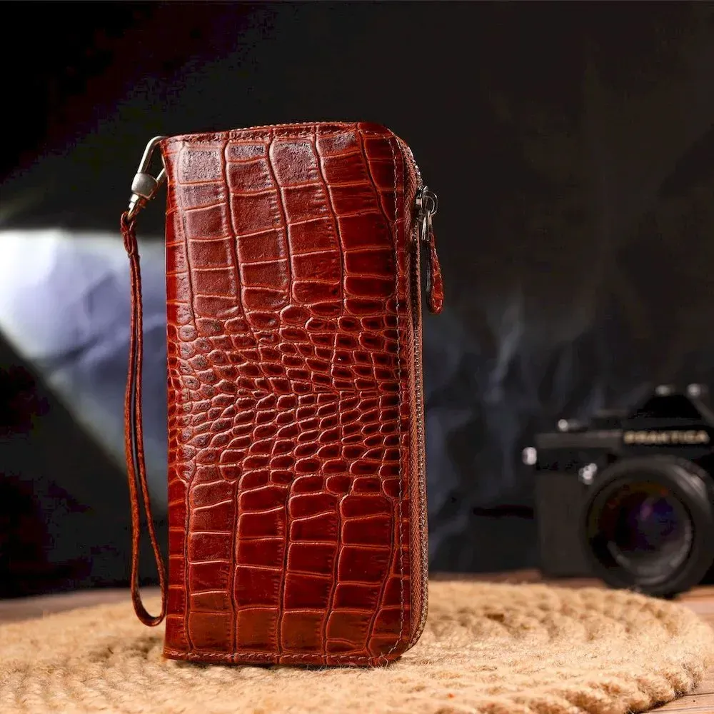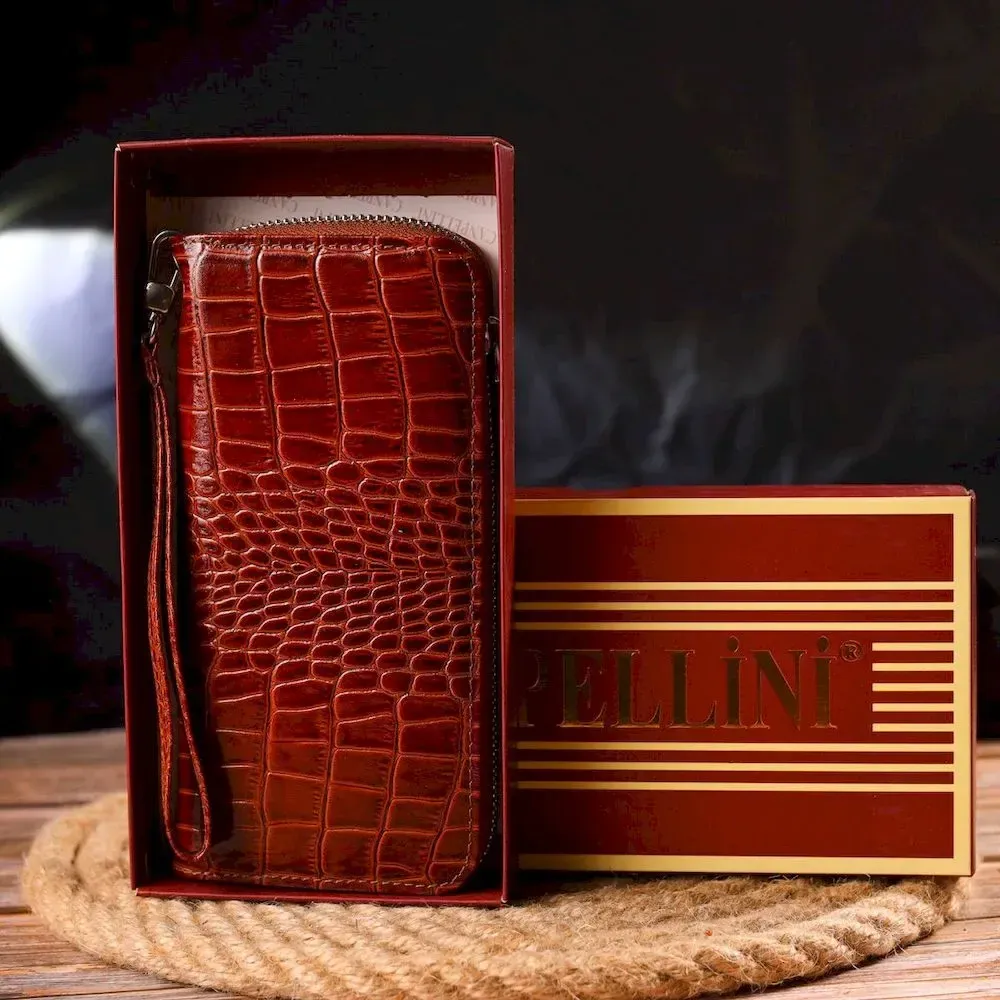 Чудовий жіночий гаманець, з натуральної шкіри з тисненням під крокодила. Аксесуар має три основні відділення, в які поміщаються купюри всіх номіналів, дві перегородки, одна з них на блискавці, вісім кишень для карток, дві прилеглі кишені та знімний кистьовий ремінь. Закривається аксесуар на блискавку. Відмінний аксесуар, надійного виробника, який прослужить дуже довго.